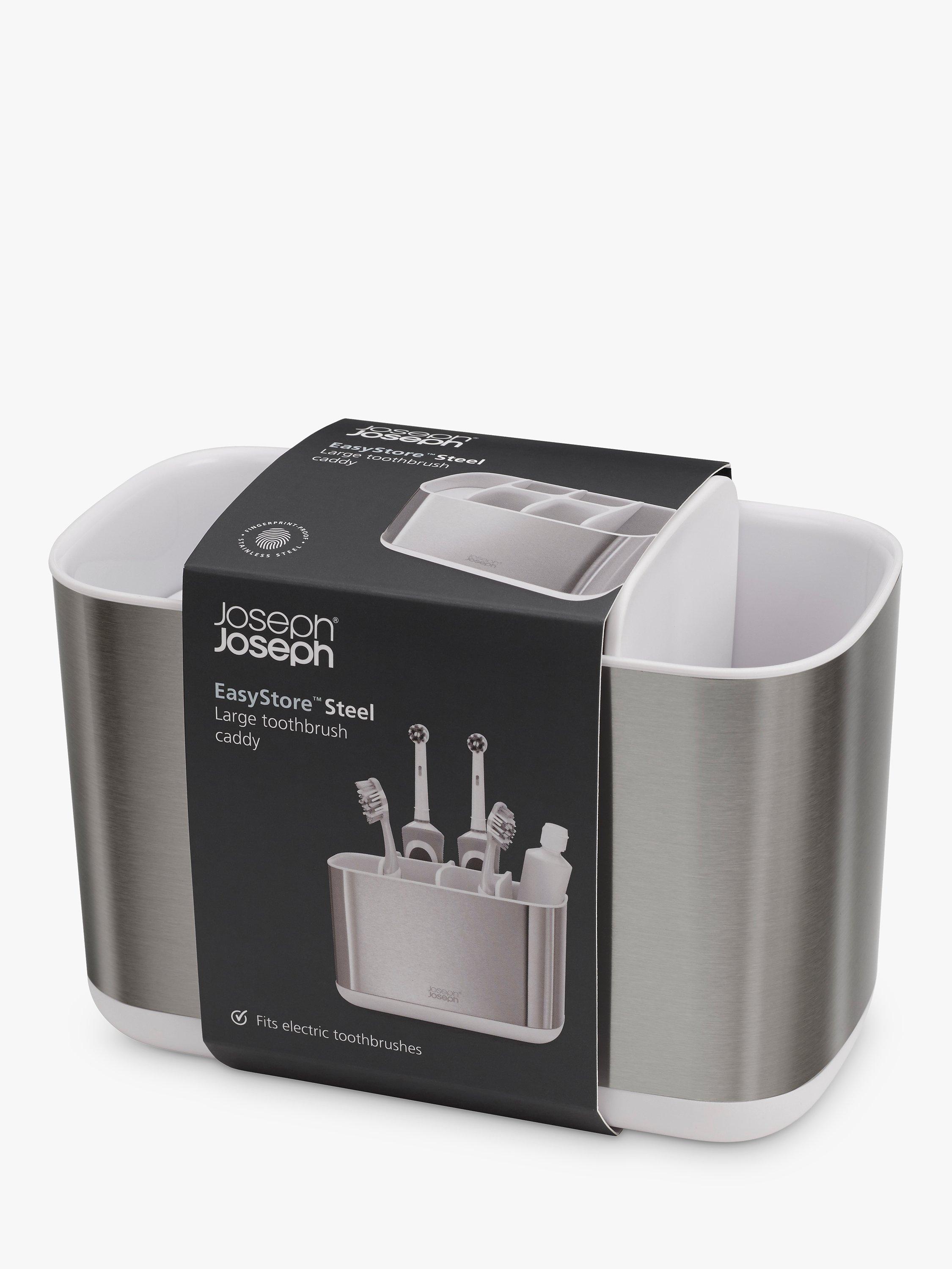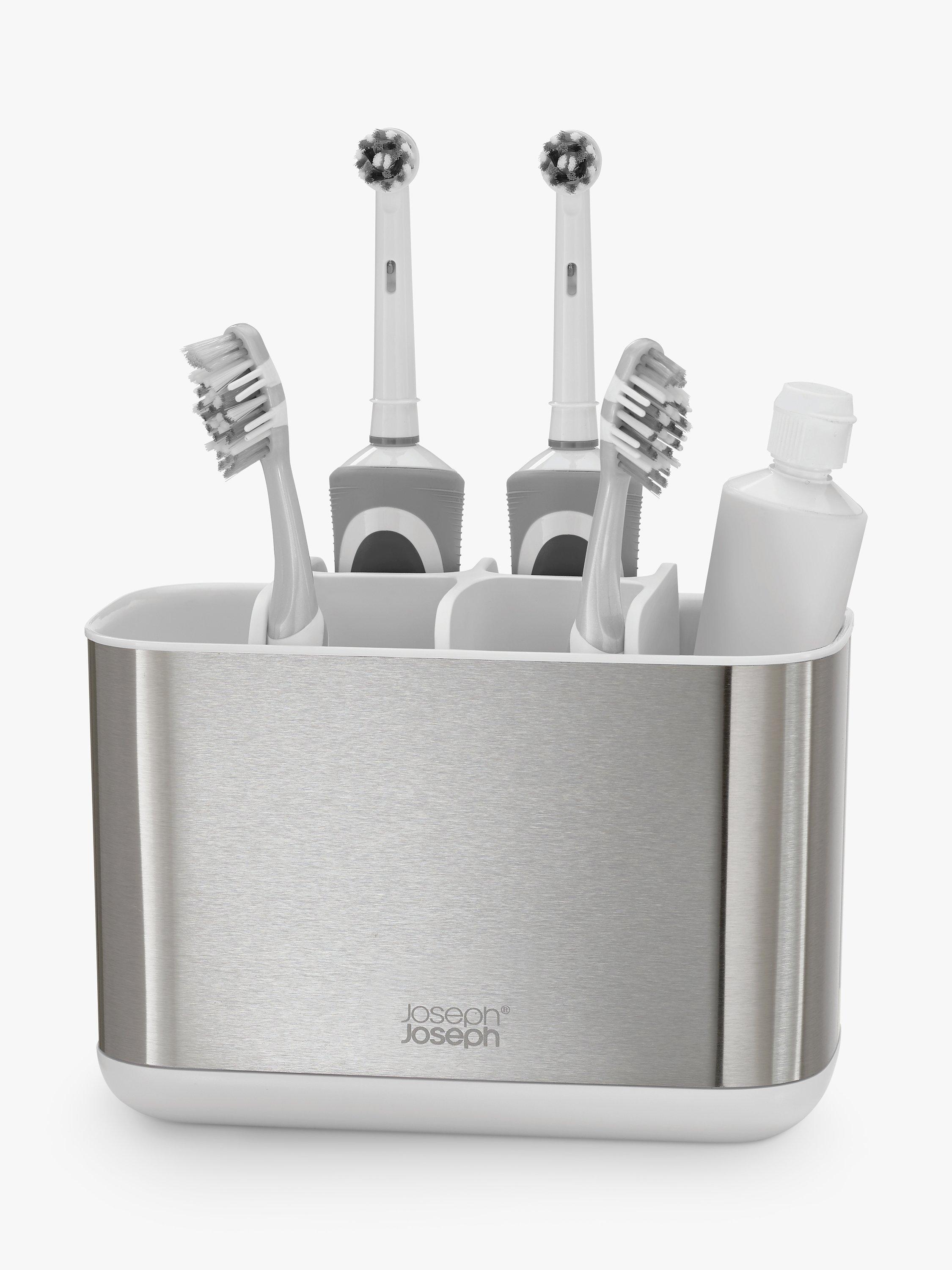 Large toothbrush caddy in a stylish stainless-steel finish, divided into several storage sections for organising oral care items such as manual/electric toothbrushes, toothpaste tubes and dental floss. Dismantles for easy cleaning and features a shallow compartment for small items, a ventilation hole for quick drying and a non-slip base.