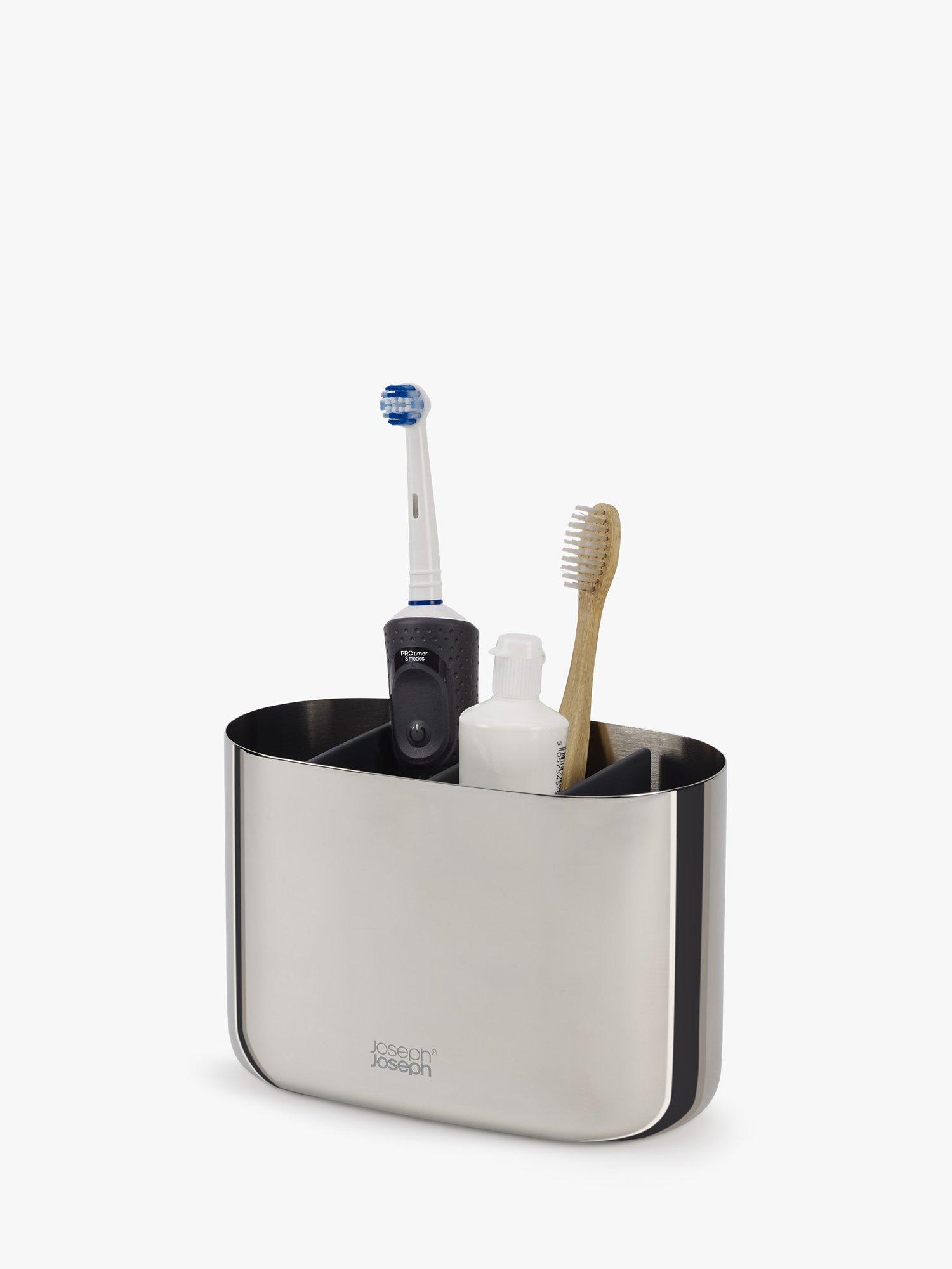 This smart toothbrush caddy brings a touch of class to the bathroom and provides organised storage for a variety of oral care items, such as manual/electric toothbrushes and toothpaste tubes. It features a handy divider, a polished stainless-steel finish and dismantles for easy cleaning.