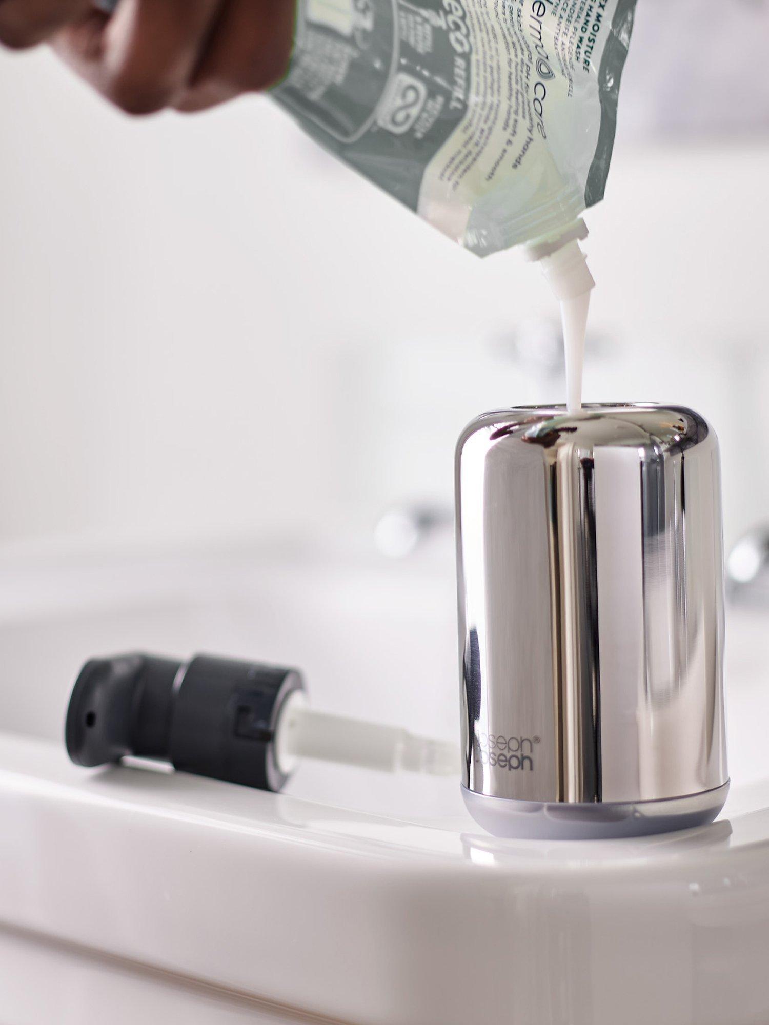 This soap dispenser features an easy-push pump head, a non-slip base and holds up to 300 ml of liquid soap. It has a translucent window at the base to show when it's nearly empty and is easy to fill and clean.