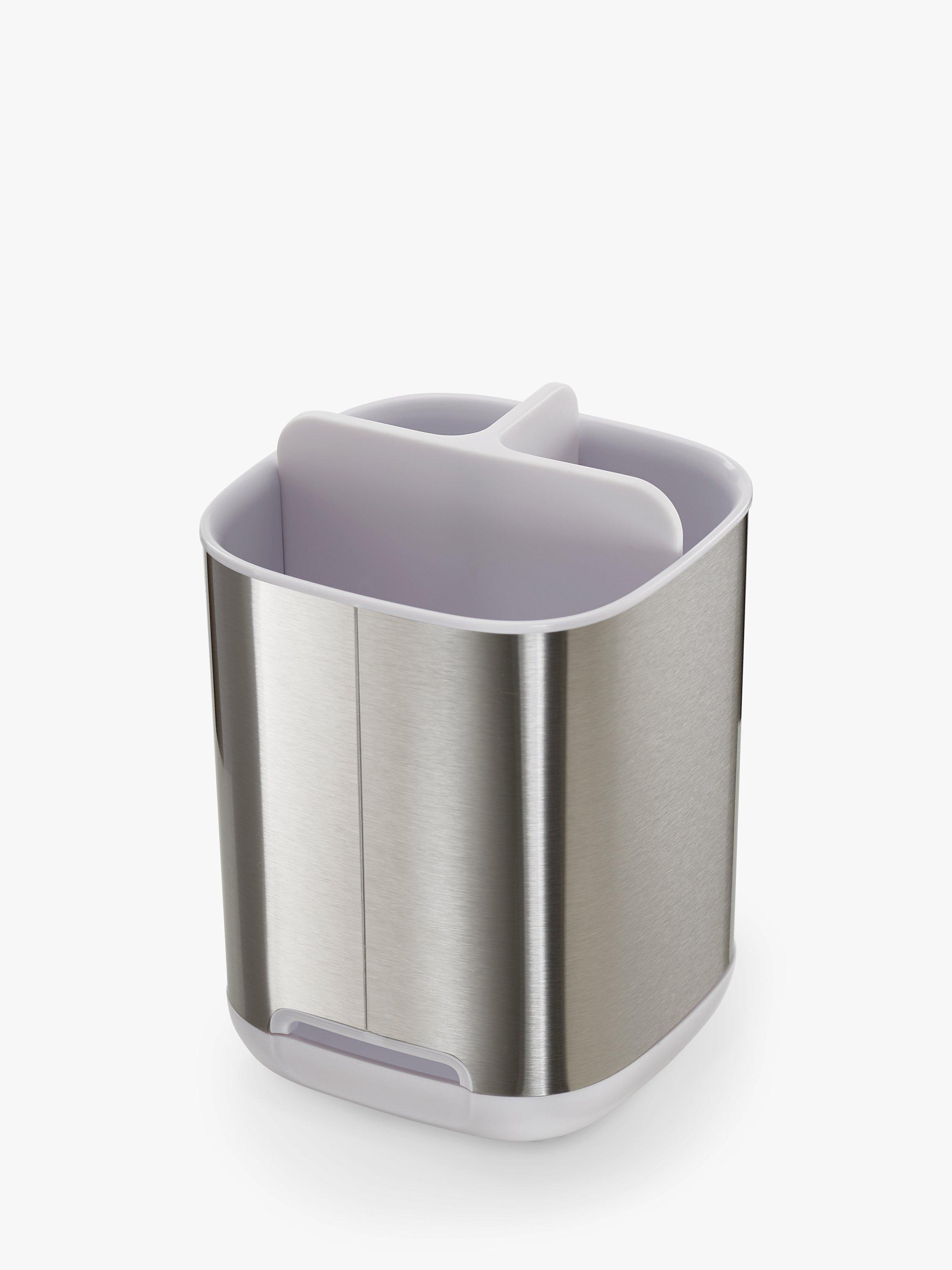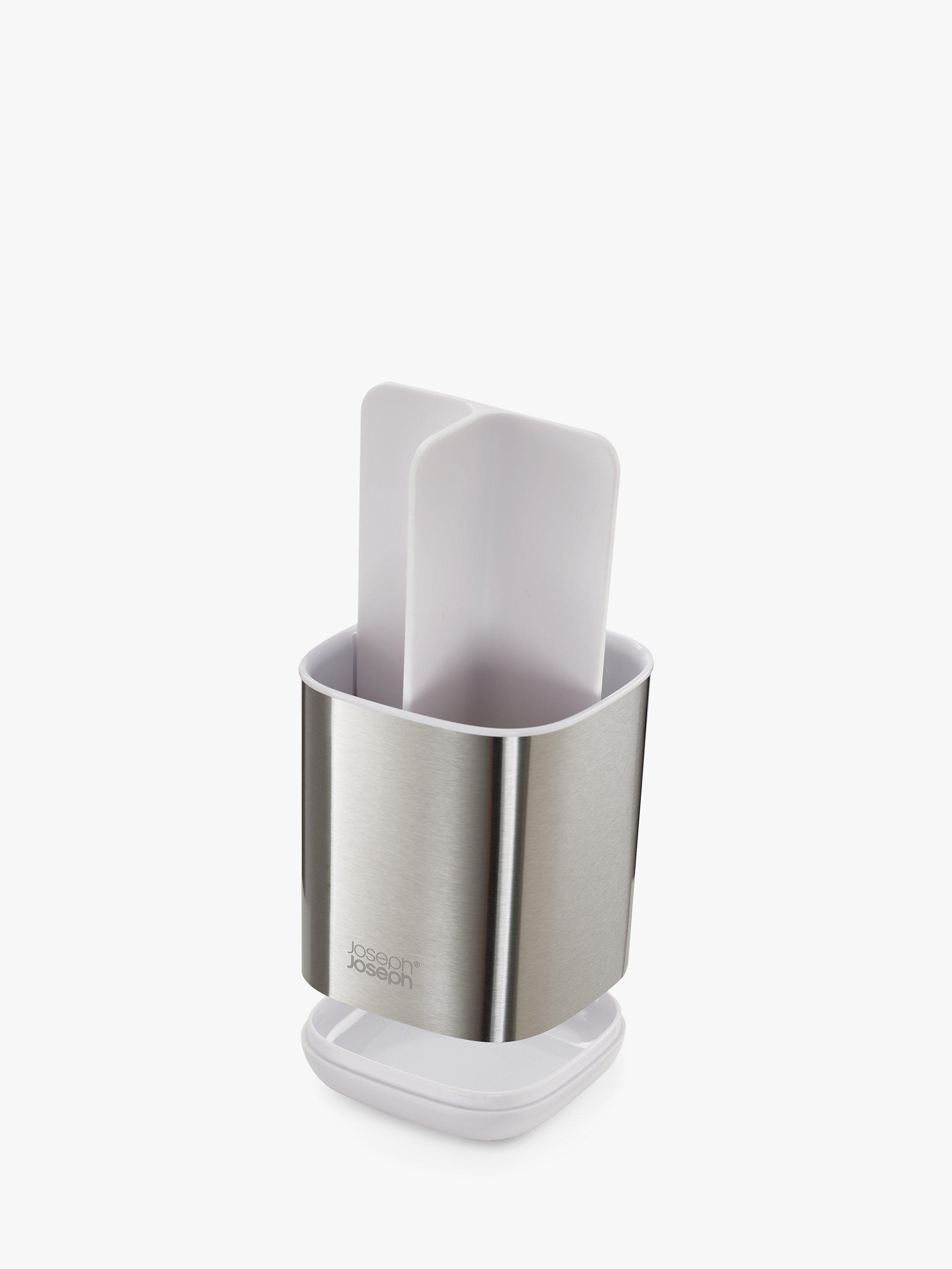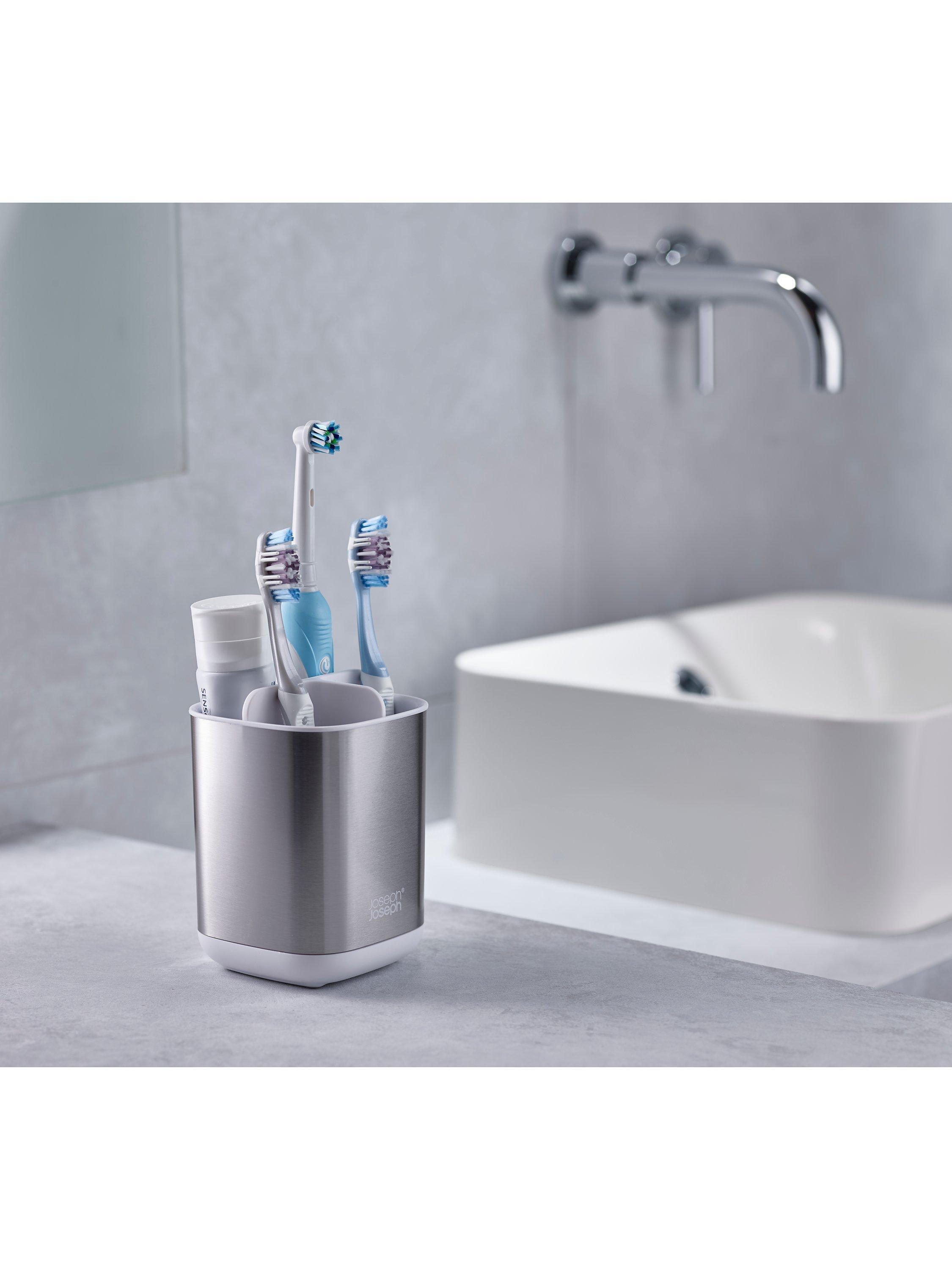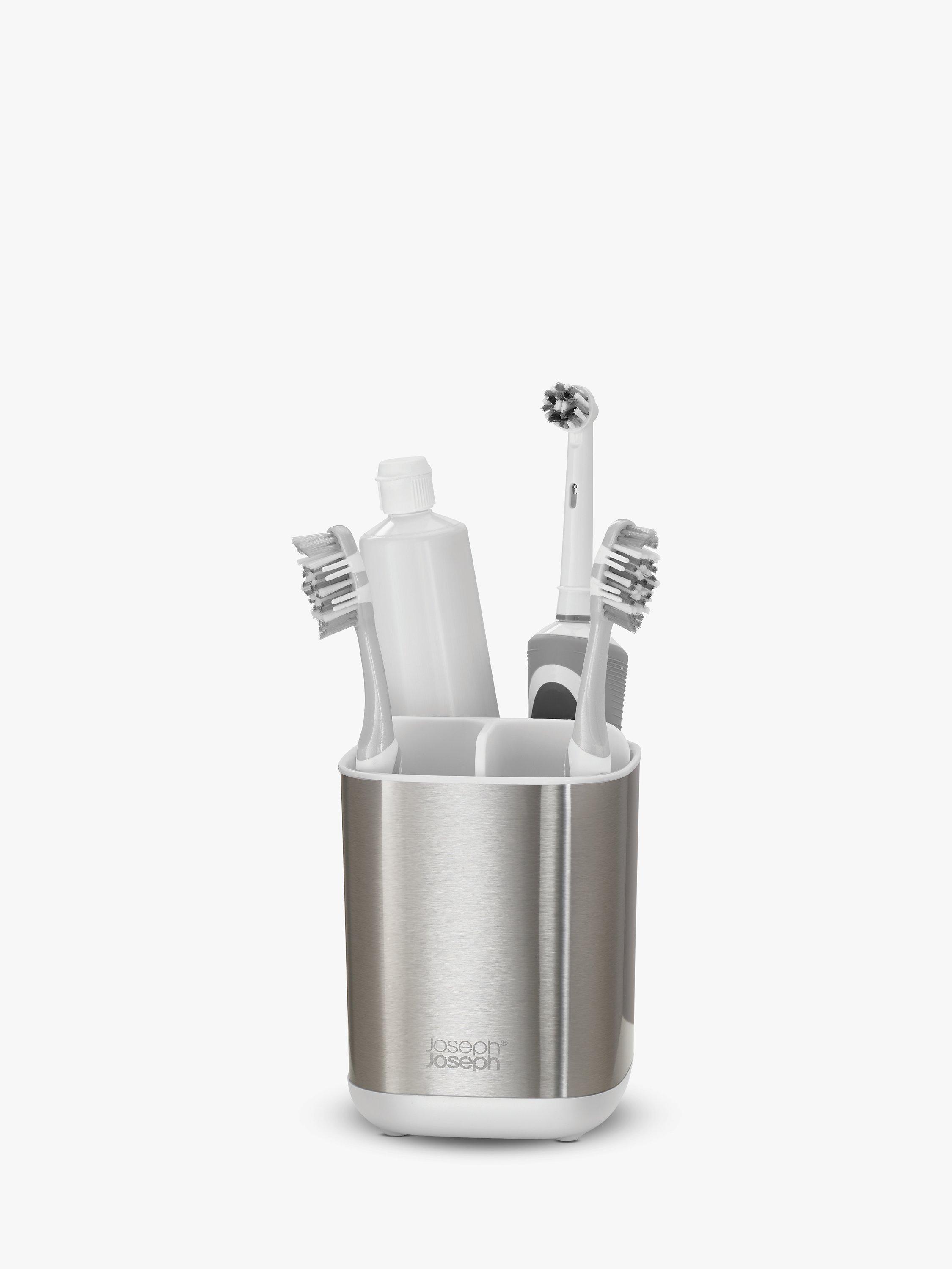 A compact toothbrush holder from Joseph Joseph with three sections for toothbrushes and toothpaste.