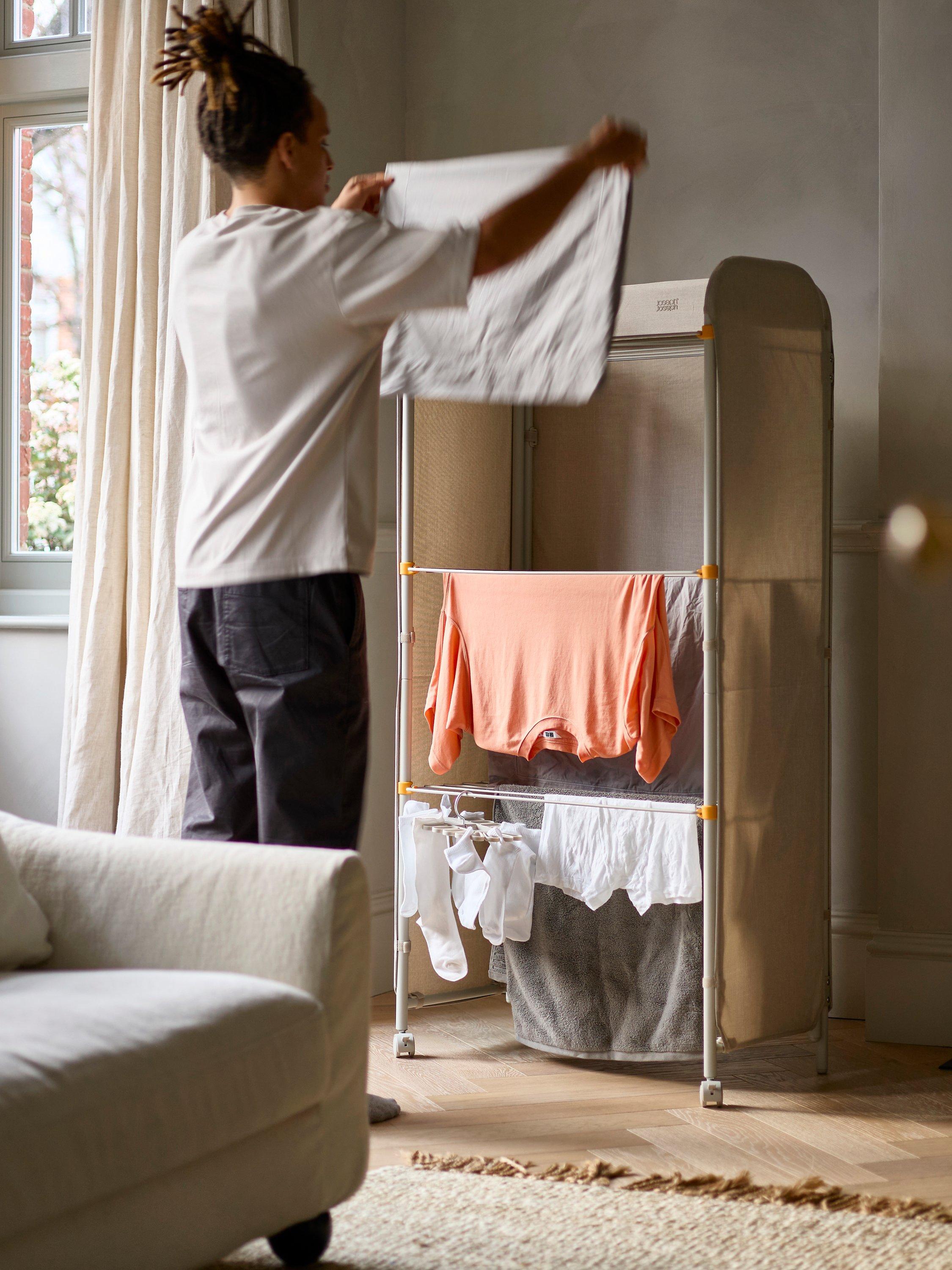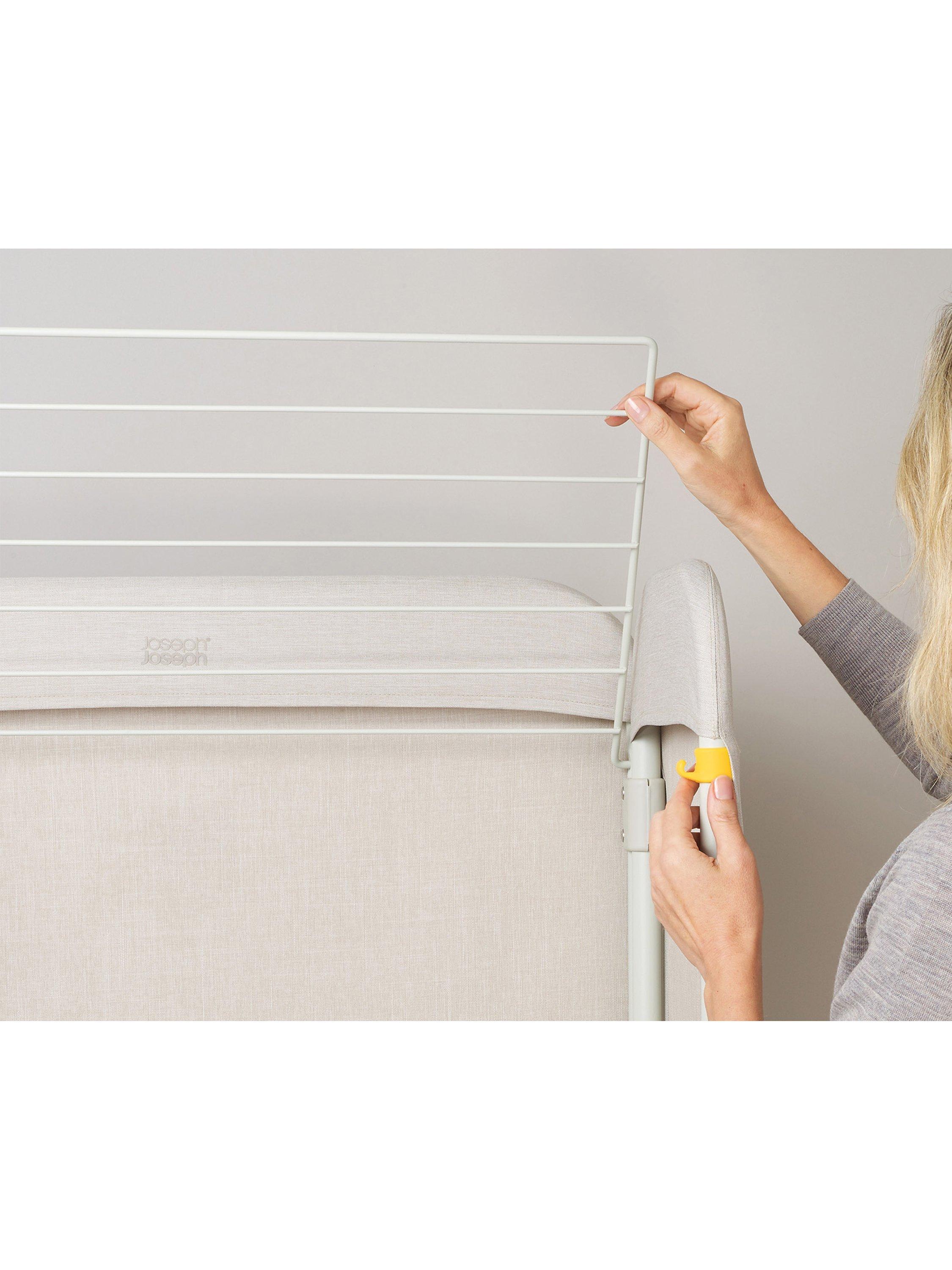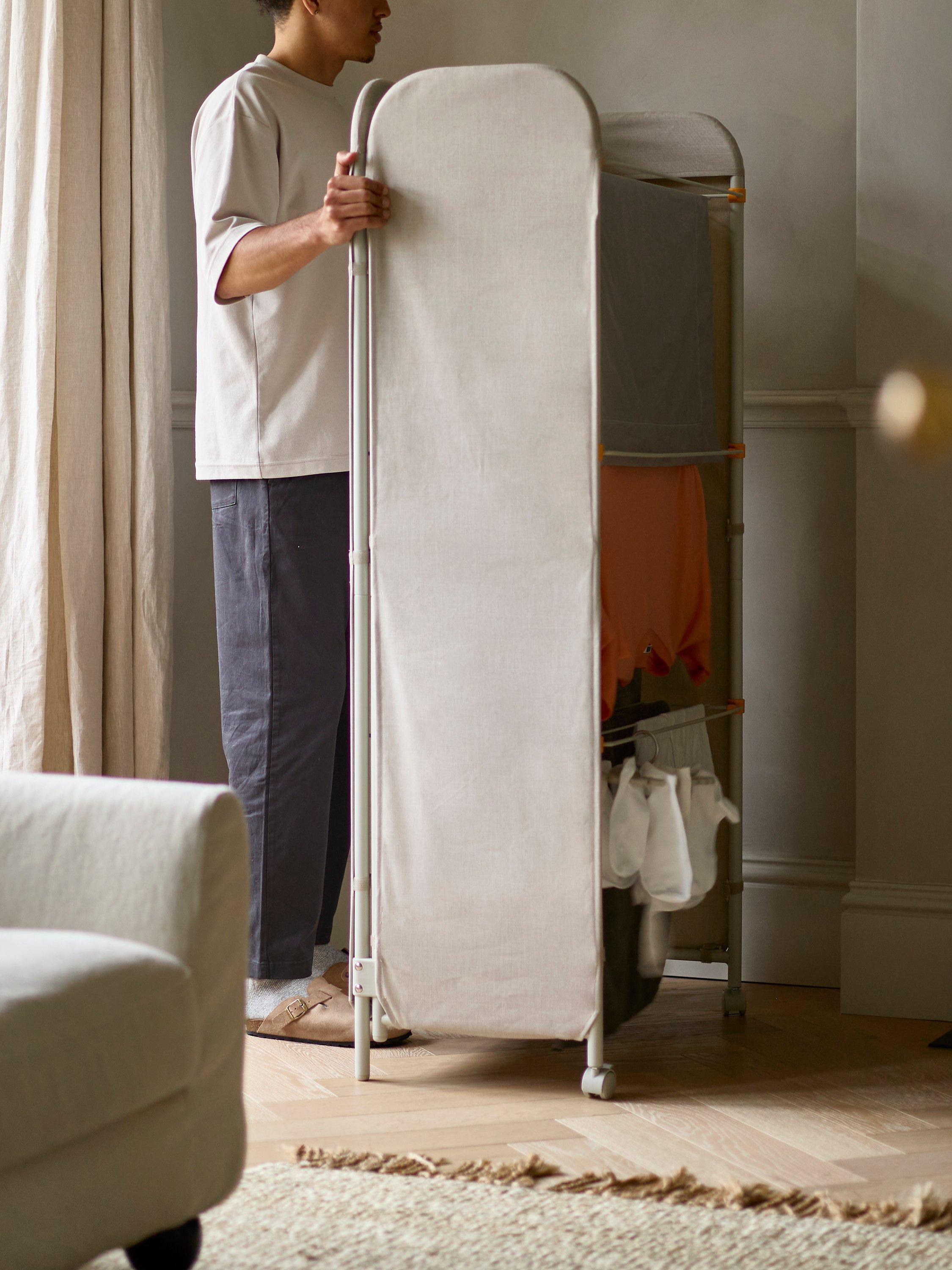 The Eclipse airer keeps unsightly washing out of sight whilst drying. It features three adaptable wire shelves suitable for drying a variety of items, including long garments, in a heavy-gauge steel construction with a stylish fabric exterior.