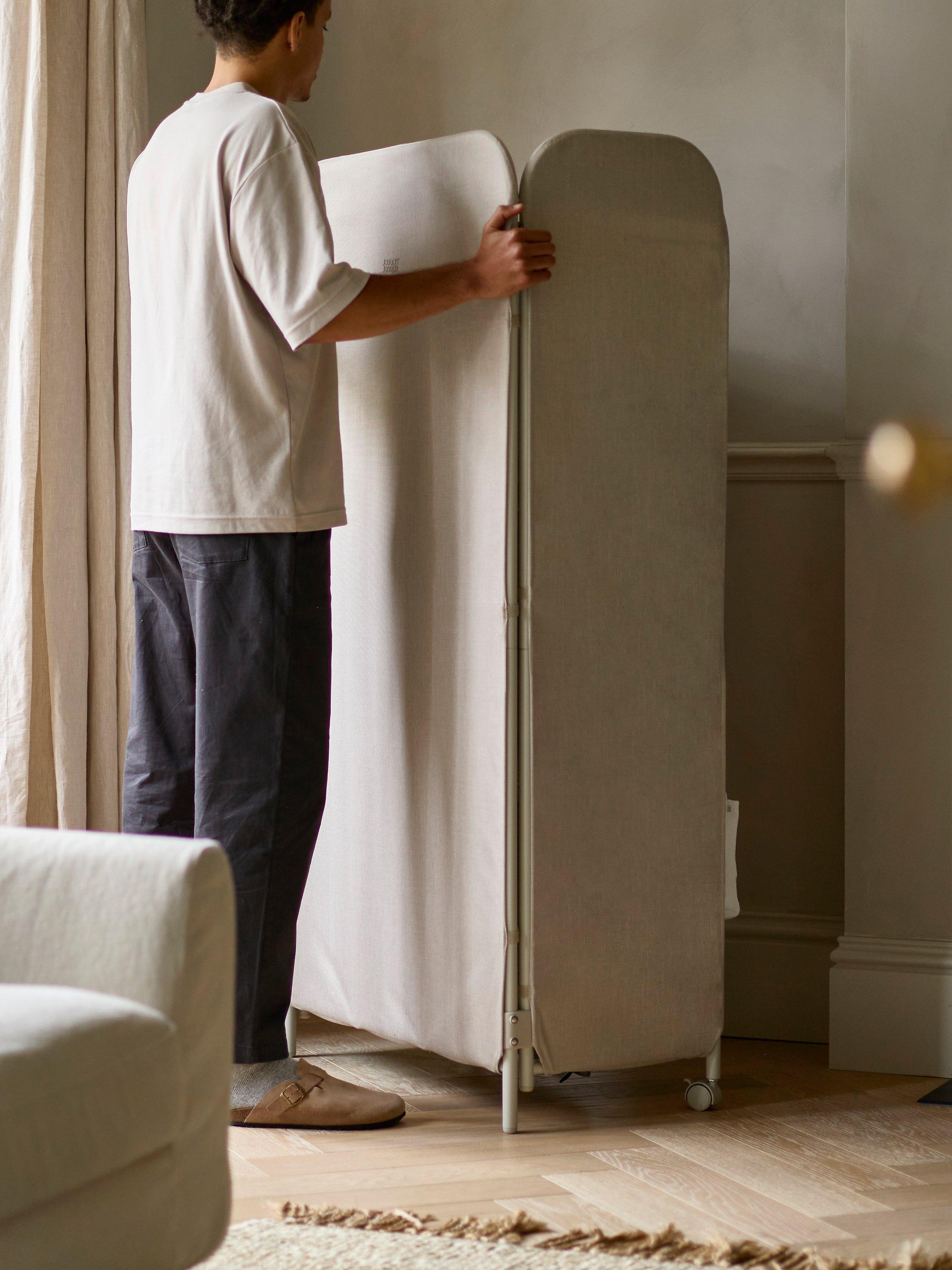 Wheels are fitted for easy movement and it folds flat for storage. The fabric cover should be ironed or steamed before assembly (avoid ironing logos).