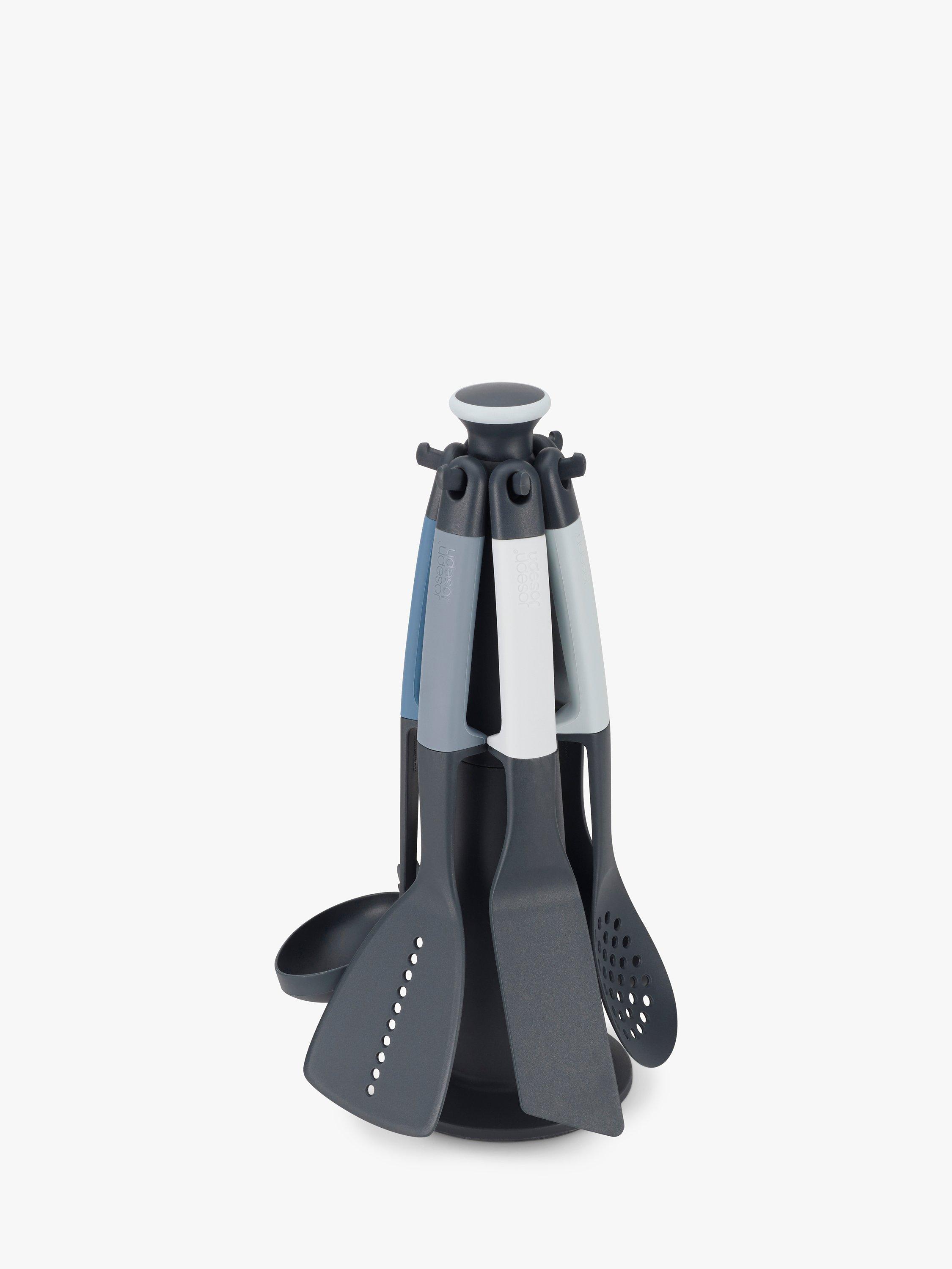 This Elevate carousel set comprises six tools from the Editions collection with a rotating storage stand to make each one handily accessible. Made from nylon, they're heat-resistant, but should not be left in cookware while cooking. The utensils are dishwasher safe for easy cleaning plastic and the carousel has a non-slip rubber base and compact design for space-saving storage. Simply twist the top of the unit to rotate for easy tool selection. Raised lips at the end of each arm prevent the utensils from falling off when the carousel is rotated.