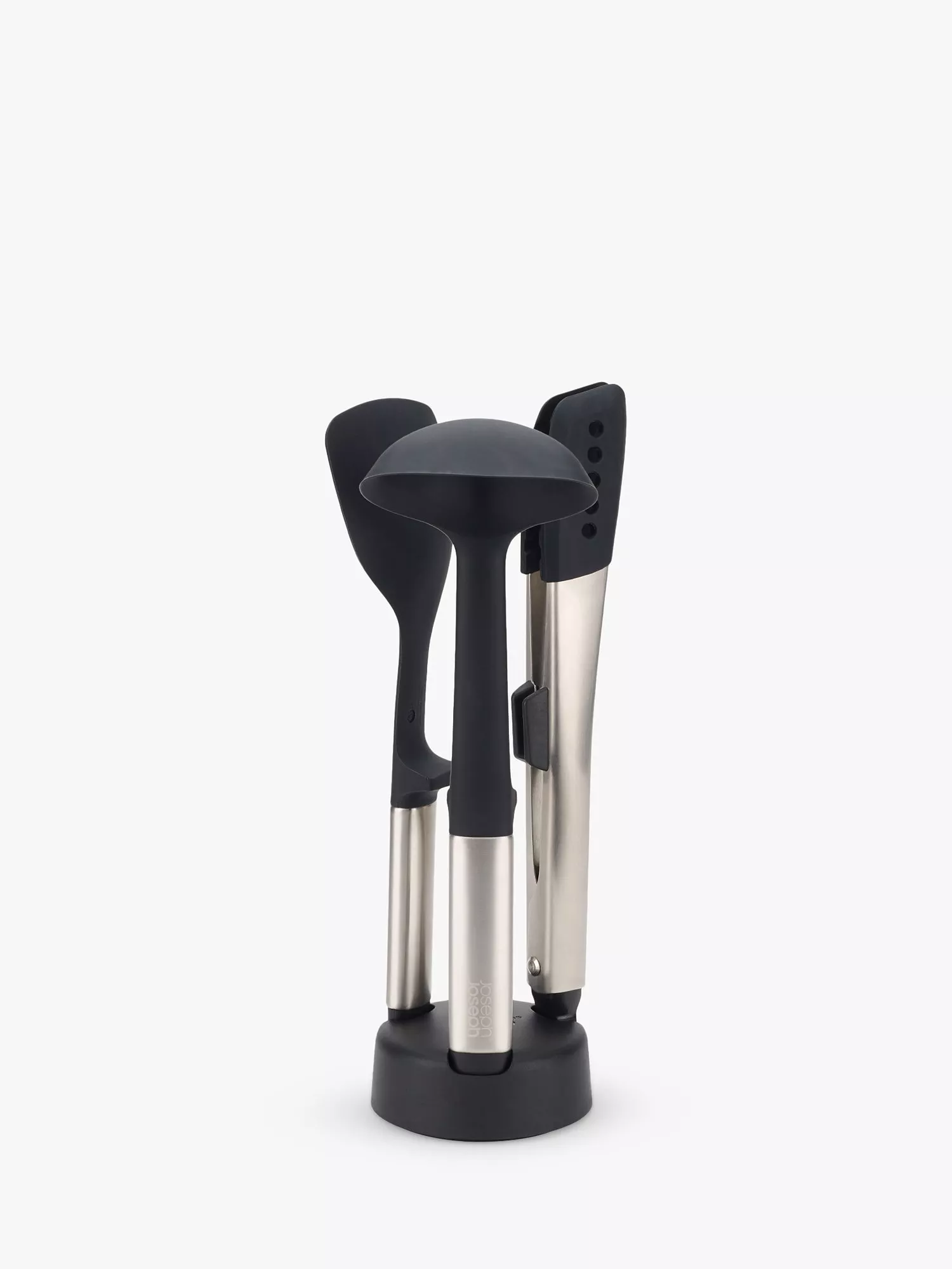 This smart 3-piece utensil set features tools with heat-resistant silicone heads, sleek stainless-steel handles and integrated tool rests that prevent the heads from touching the work surface when placed down. These not only help to improve hygiene but also reduce mess during cooking. Utensils heat-resistant up to 210ºC/410ºF; Tongs heat-resistant up to 270ºC/520ºF; suitable for non-stick cookware. The set includes a solid turner with a wide head that's ideal for lifting and tossing food; a ladle with a flat front edge that makes scooping and scraping from pans easier and a pair of tongs for gripping and lifting food easily. All the tools fit neatly into a compact stand that provides highly organised storage on the worktop.