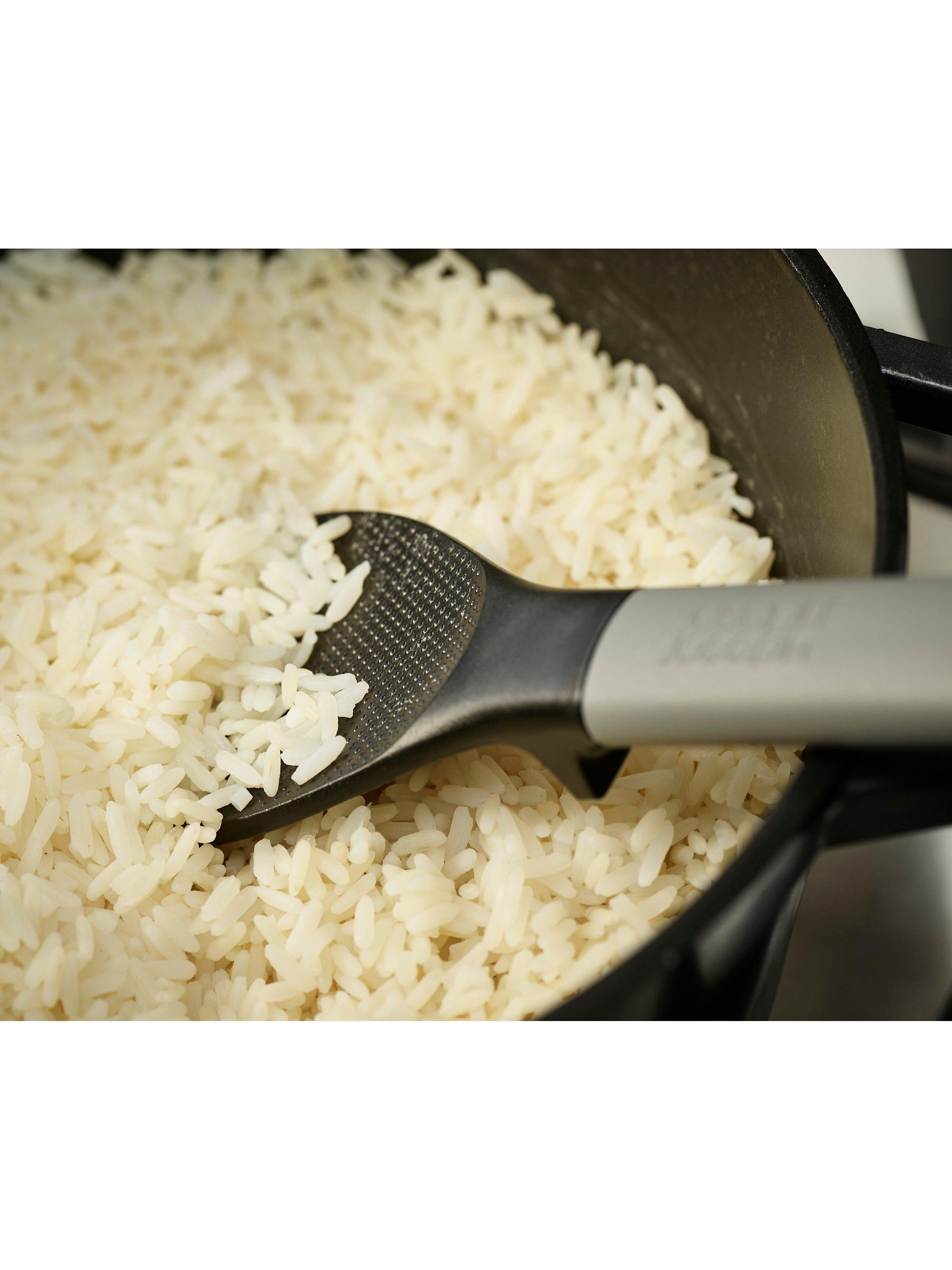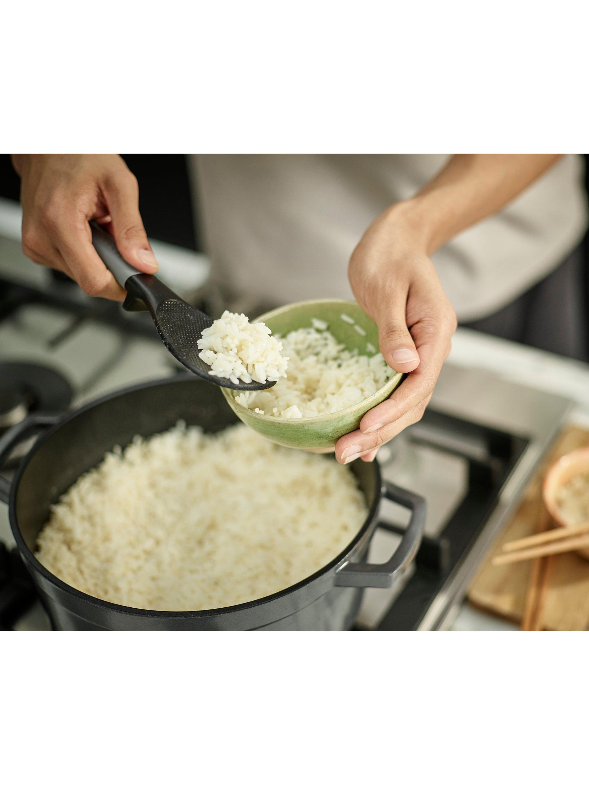 Whether you're using a rice cooker or your favourite pot, this compact utensil is perfect for gently fluffing and serving cooked rice without damaging the delicate grains. The wide, flat head makes it easy to scoop rice onto a plate or into a bowl and the textured surface helps prevent the grains from sticking to the spoon. The comfortable handle features, an integrated tool rest designed to prevent the head from touching the worktop when placed down, not only improves hygiene but also helps reduce mess. Heat-resistant up to 200°C/392°F, it's also suitable for use with non-stick cookware.