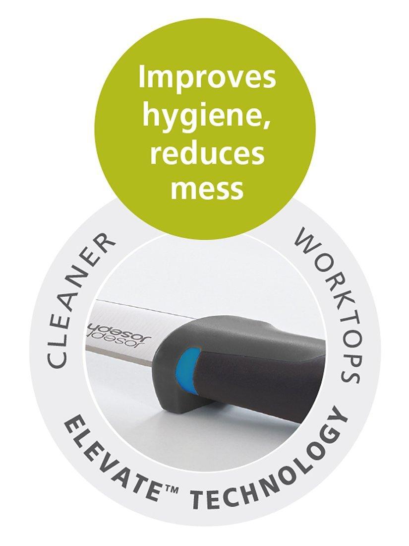 Joseph Joseph's Elevate™ range of kitchen utensils and knives are designed for more hygienic food preparation that creates less mess. Each tool has an innovative weighted handle with an integrated tool rest, ensuring that, when an Elevate™ utensil is placed down, its head is always raised up and doesn't drip on the work surface.