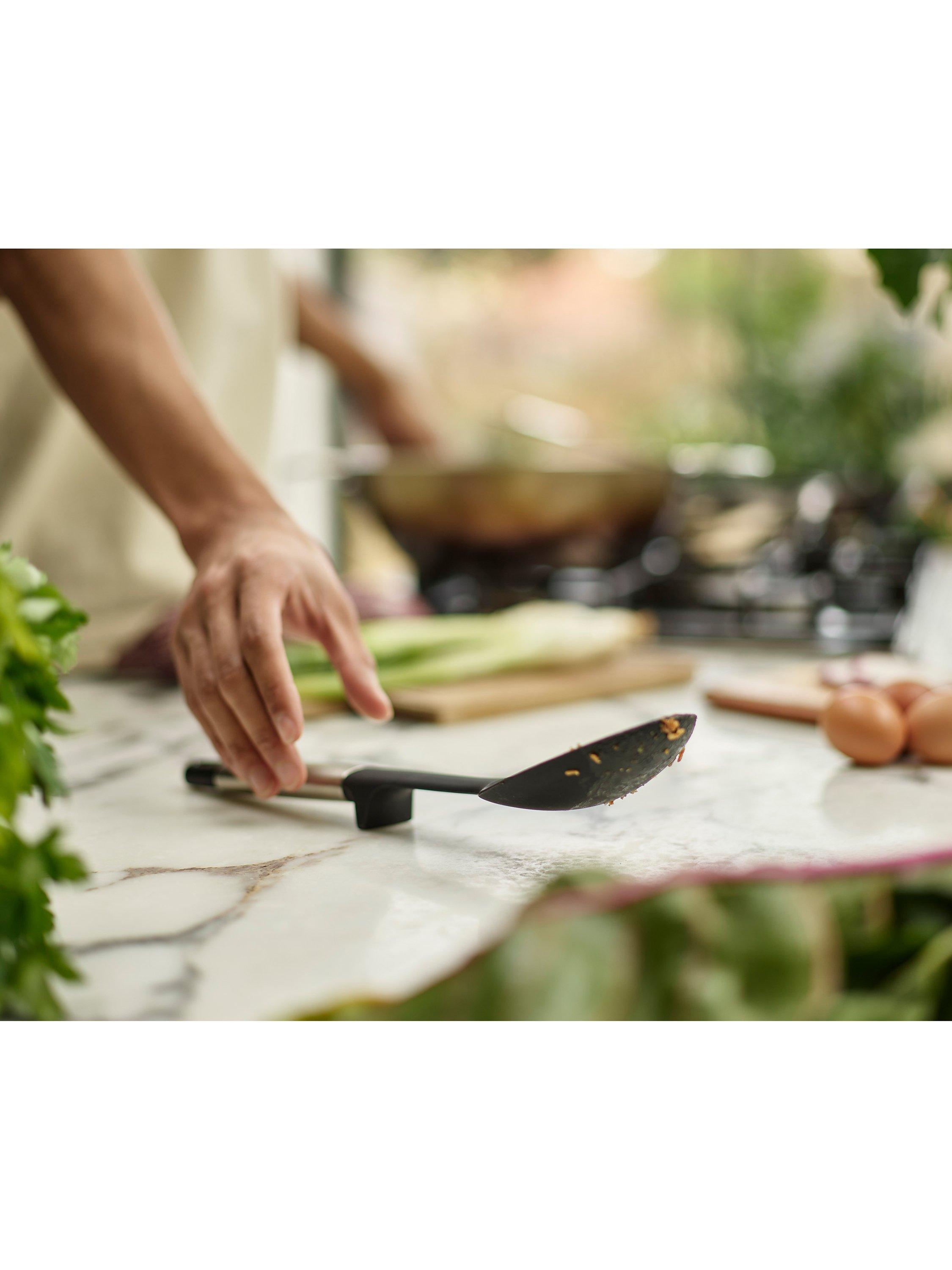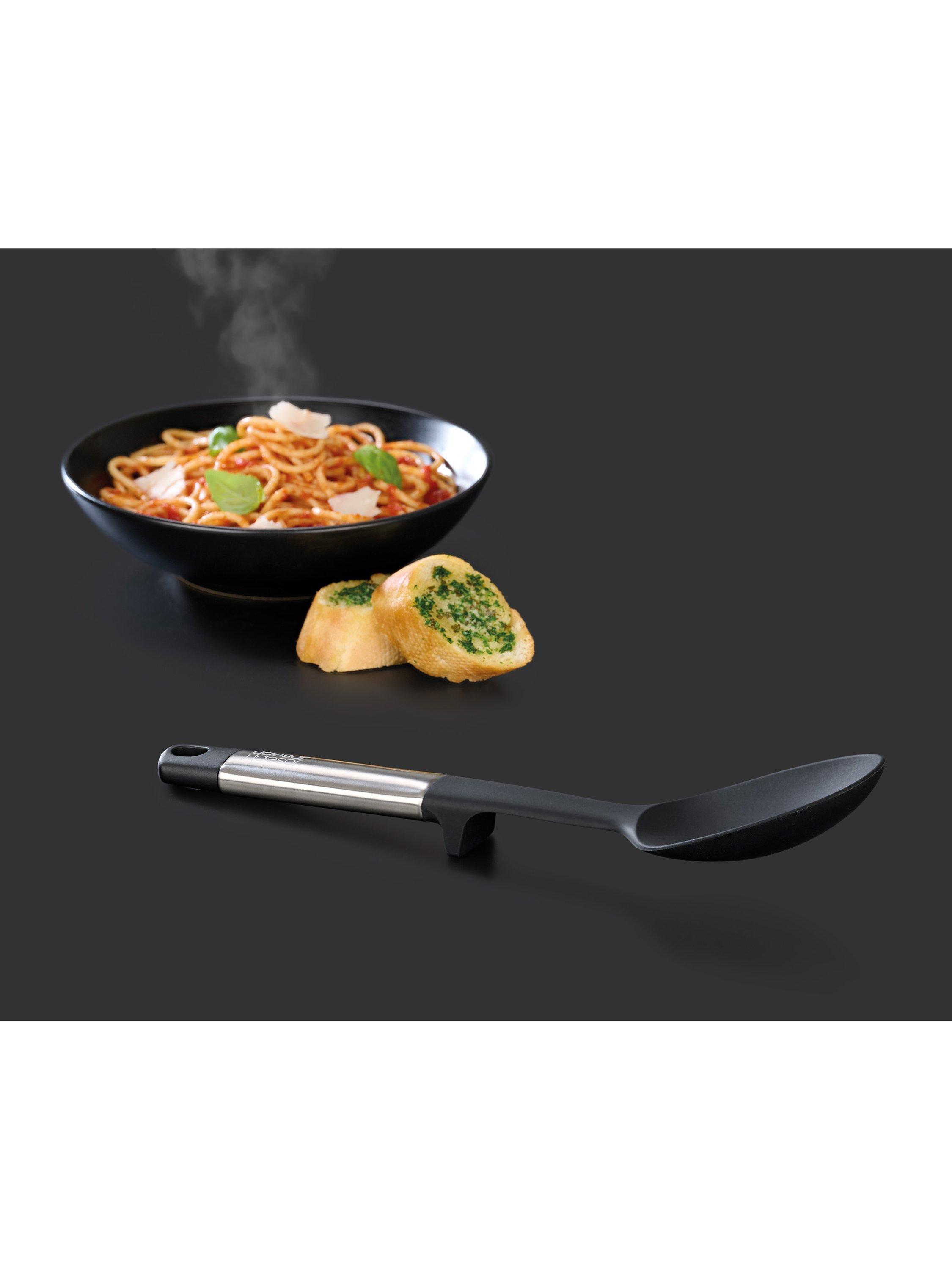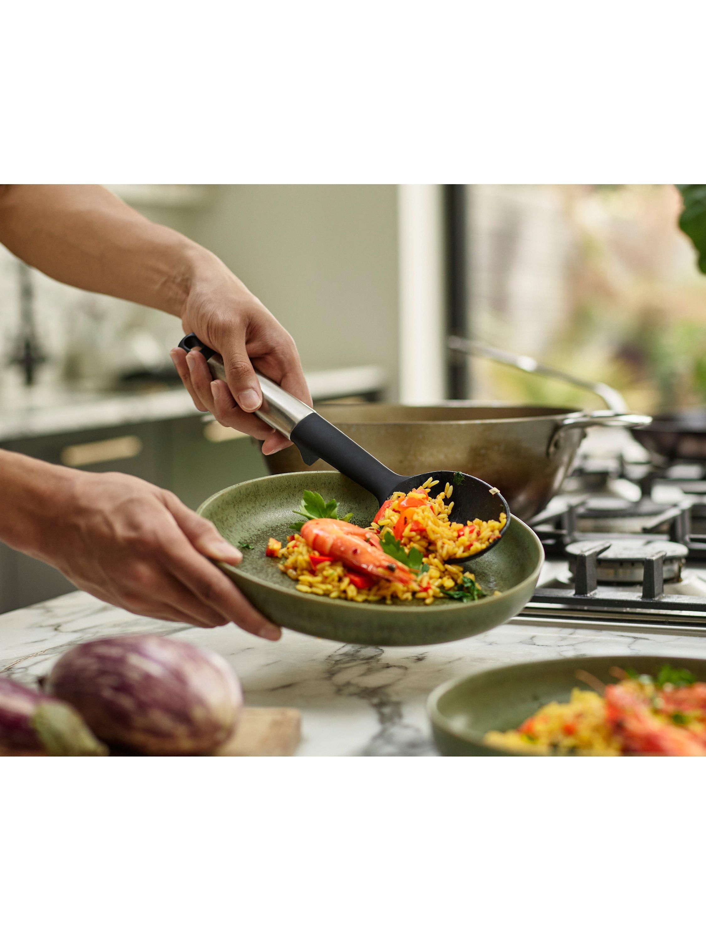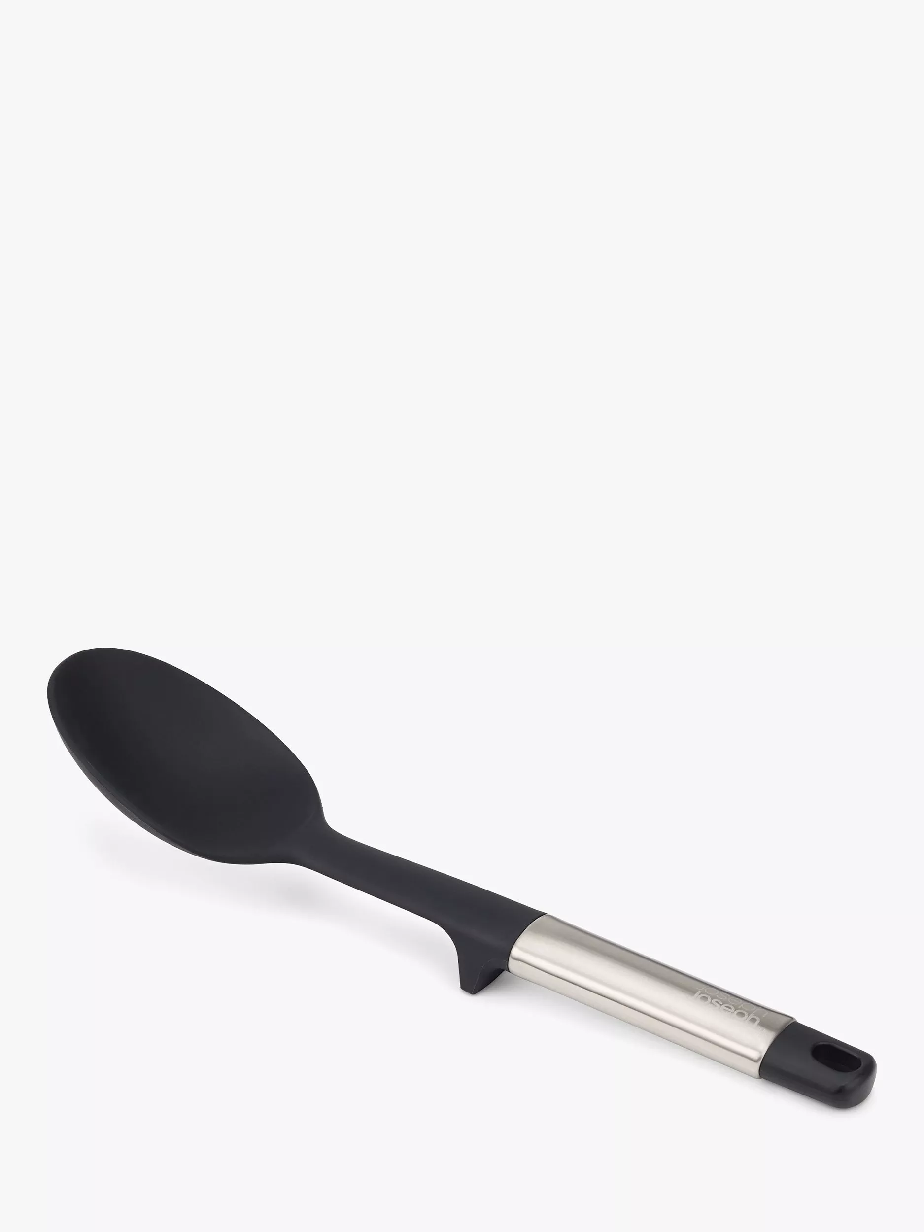 Made with a large silicone head for stirring food, this solid spoon has a sleek stainless steel handle with an integrated tool rest to prevent the head from touching the worktop when placed down. This not only improves hygiene but also helps reduce mess during cooking.
