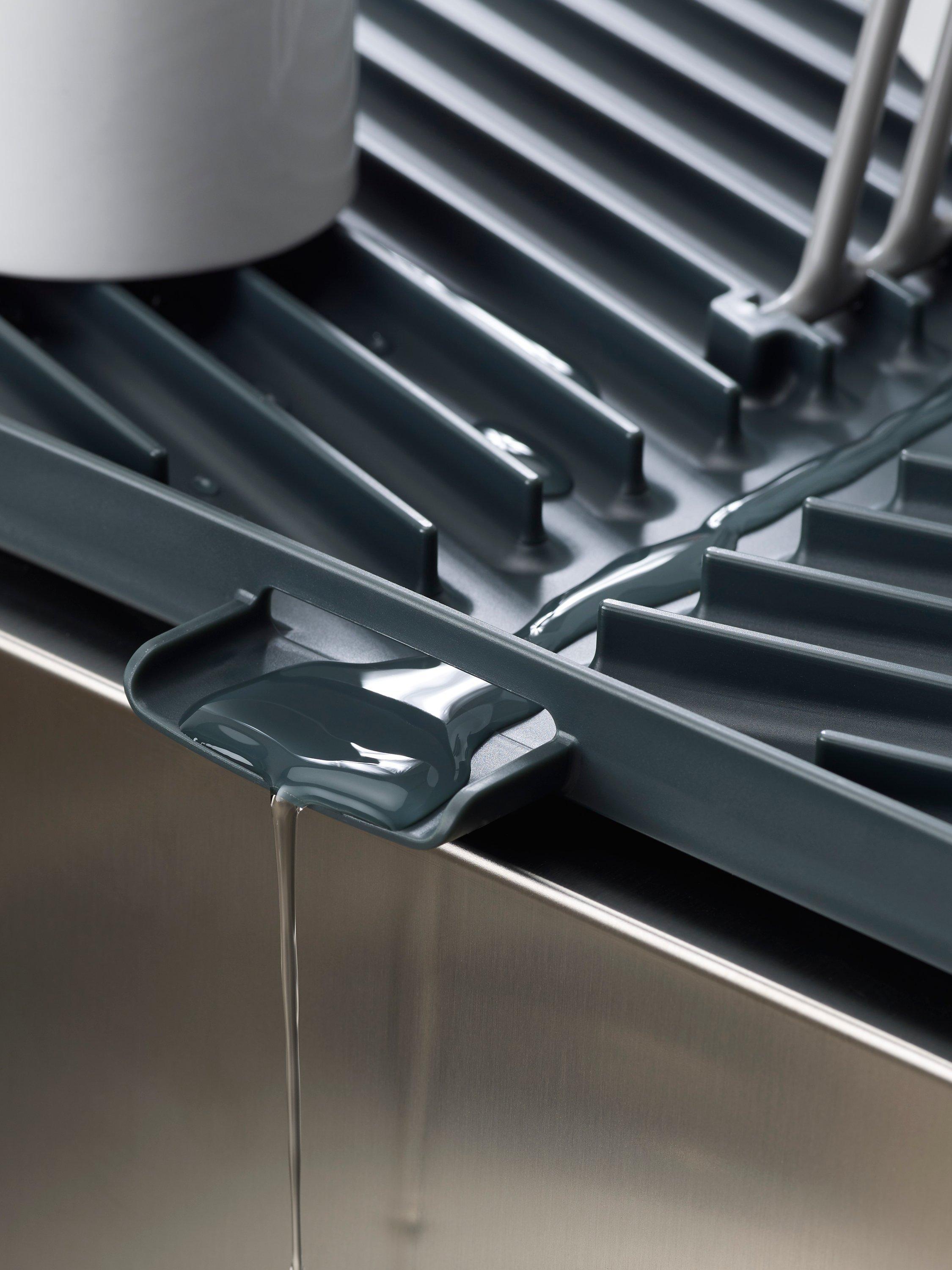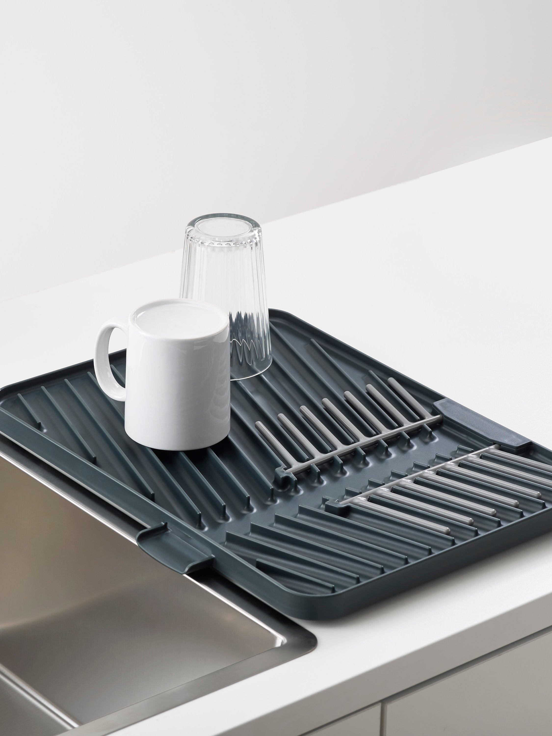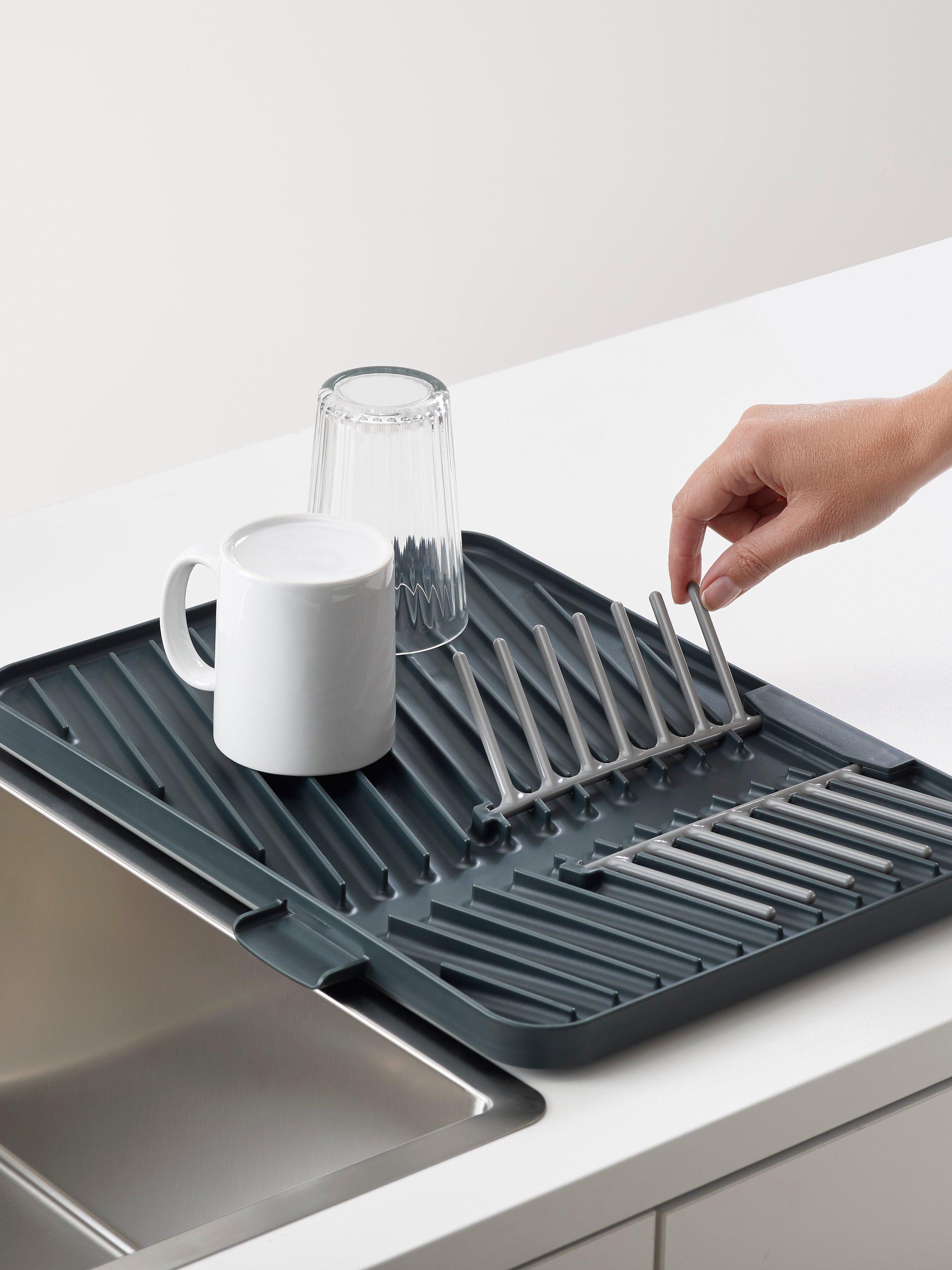 This clever dish rack from Joseph Joseph means you can create additional draining space pretty much anywhere. It's reversible, and both sides have sloping ribs that channel the water down and out, so you can avoid water being trapped in upturned cups and bowls. One side has a spout which will drain the water straight back into the sink and there is also a flip up plate rack that holds up to 6 dinner plates.