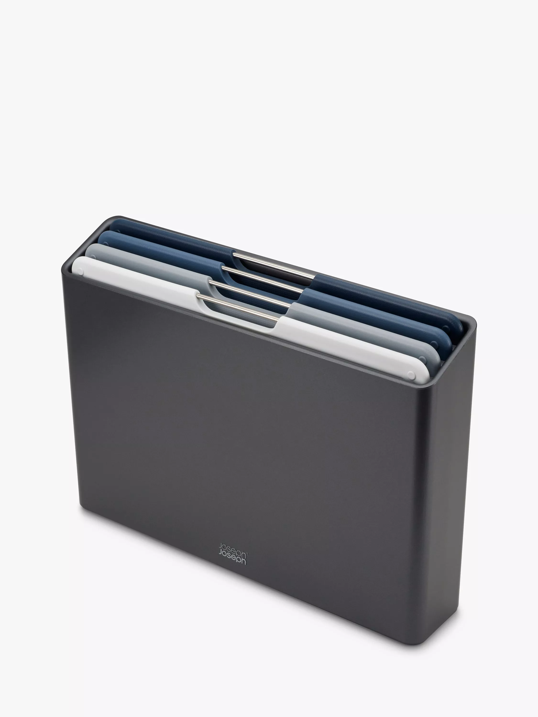 A set of four large Folio chopping boards from Joseph Joseph that nest together for compact storage. The four boards are colour-coded to help prevent cross-contamination and they're knife-friendly with textured cutting surfaces on both sides.
