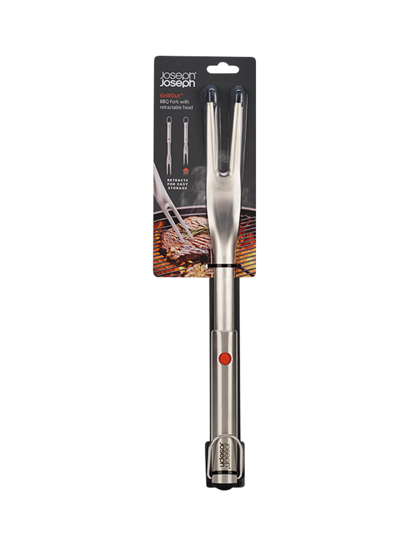 This premium barbecue fork is made of durable, rust-resistant stainless steel and features a clever, retractable head for compact storage. Simply pull the head out to its full length before using and then push the red button to retract for compact storage.