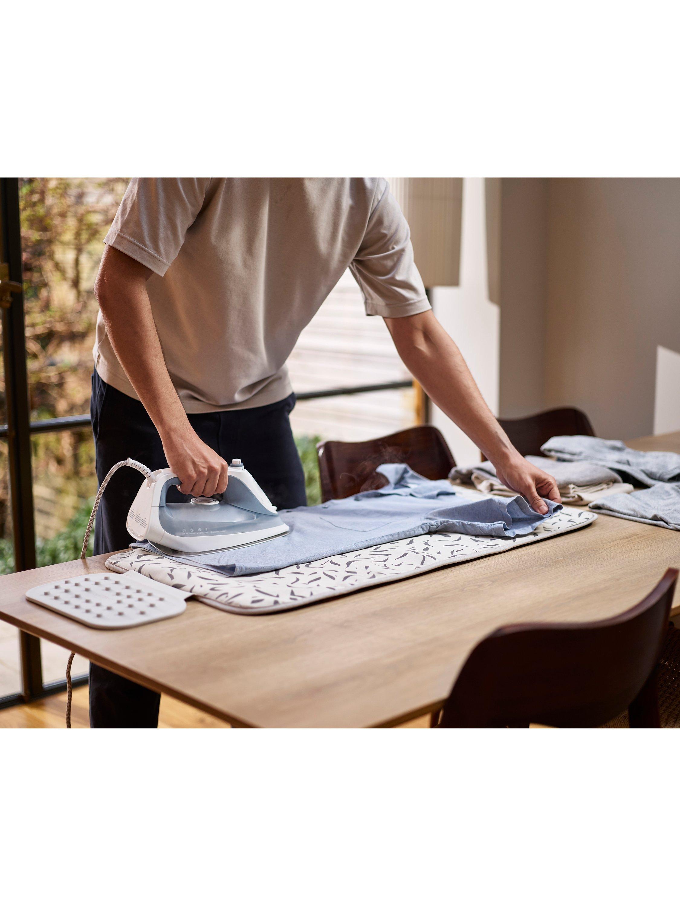 This handy mat enables quick and easy ironing on any flat surface.