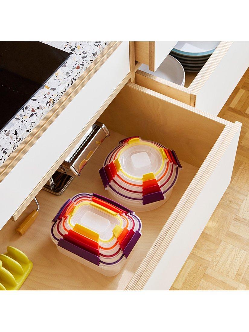 Most storage containers take up precious cupboard space when not in use and usually require the lids and bases to be stored separately, which makes finding and pairing them a hassle. With the unique design of Nest Lock from Joseph Joseph, container bases nest neatly inside each other, and lids clip conveniently together for efficient, space-saving storage.