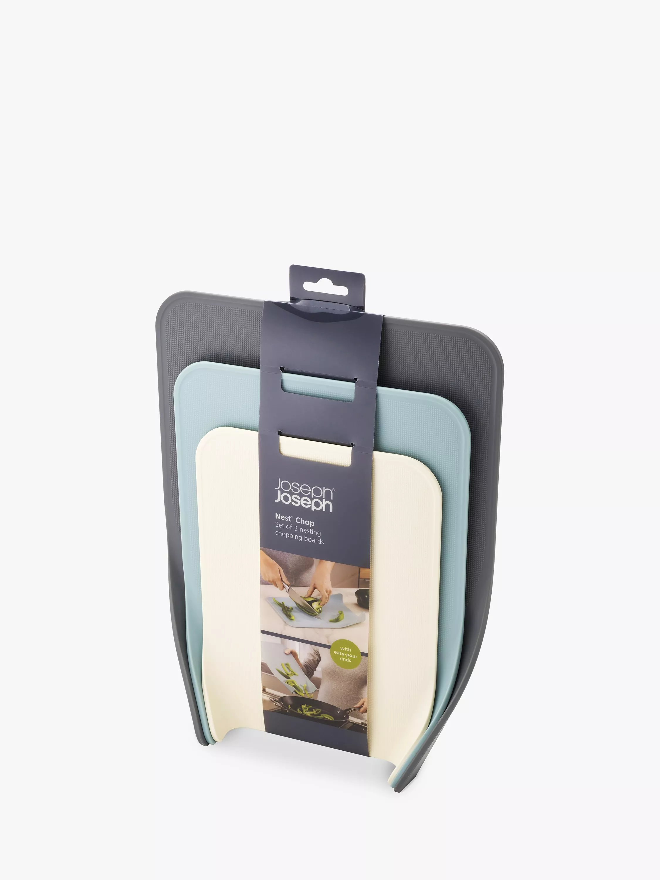 These self-supporting set of 3 boards nest together for compact storage. The folded corners form a chute, down which chopped food or waste can be neatly guided. They include integrated anti slip feet for stable cutting.