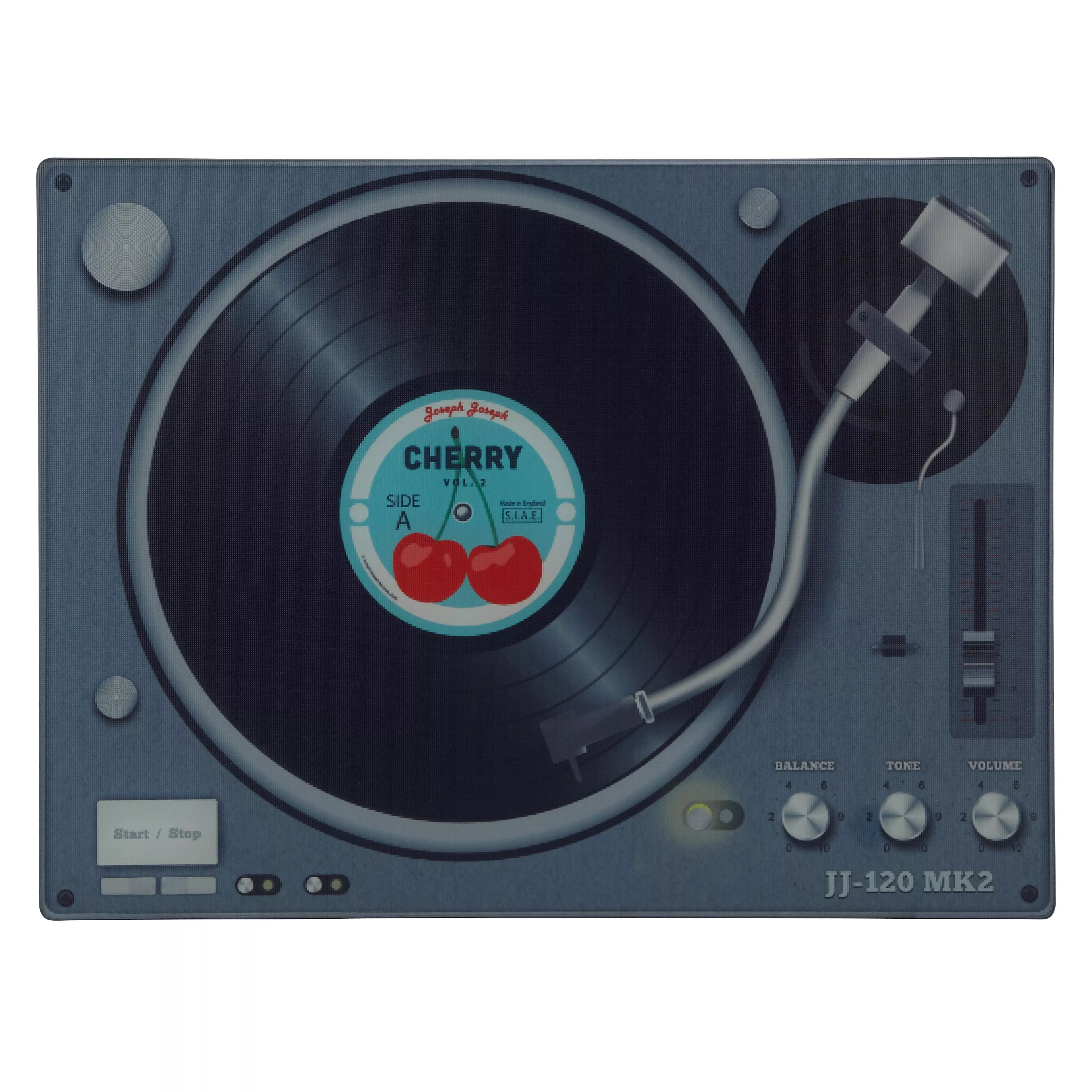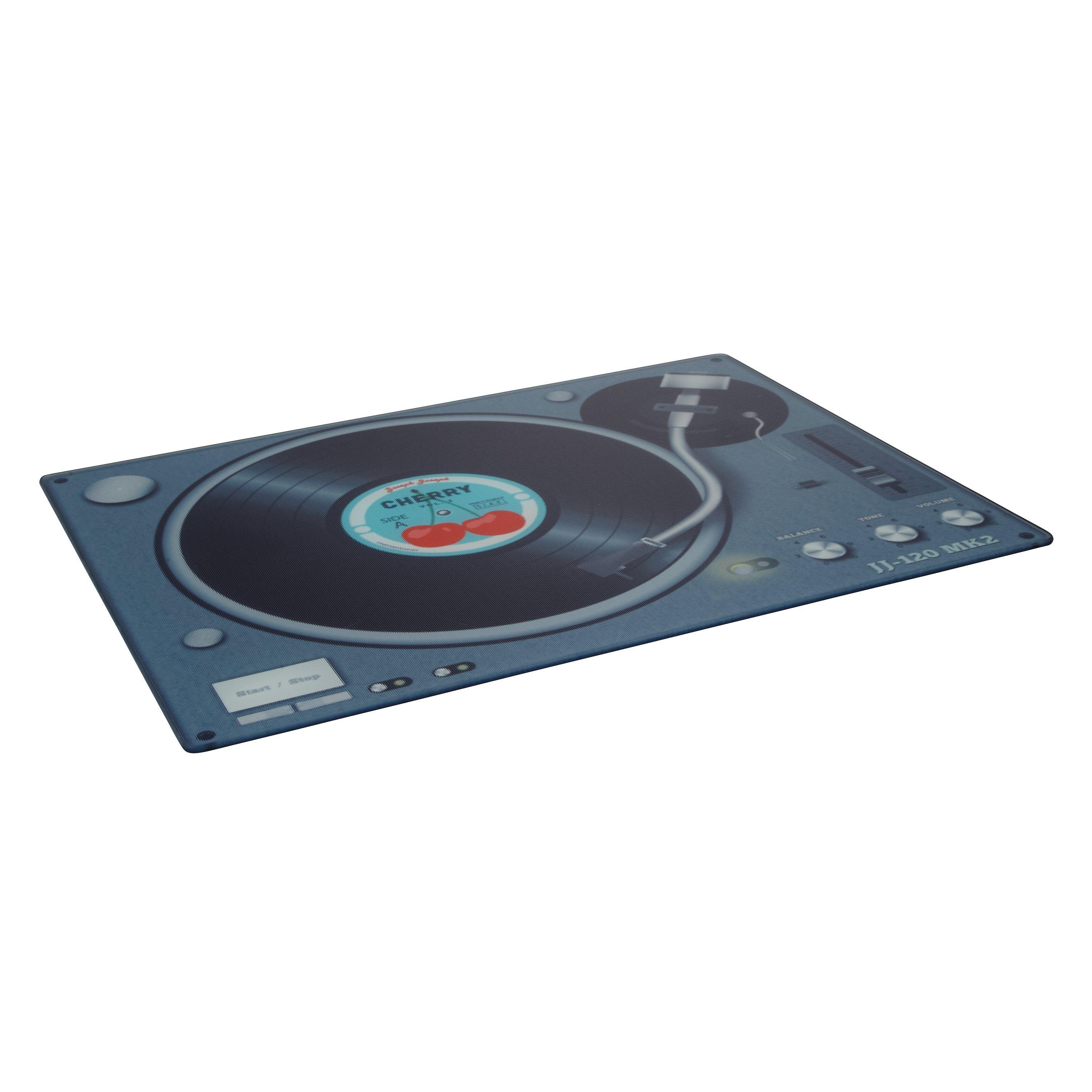 Crafted from toughened glass for durability, it features record player detail and non-slip rubber feet on the base.