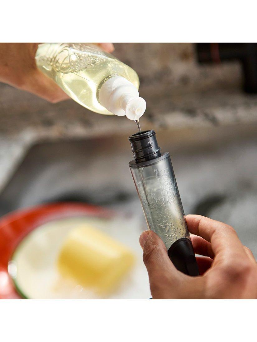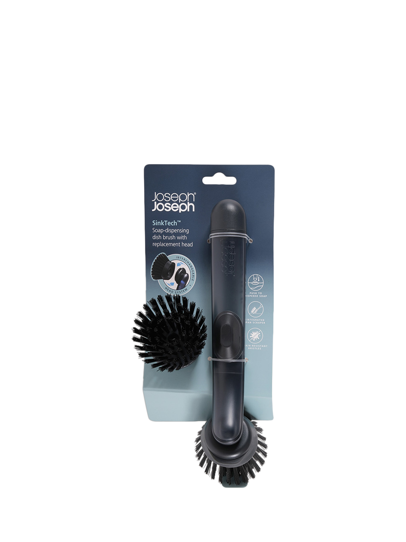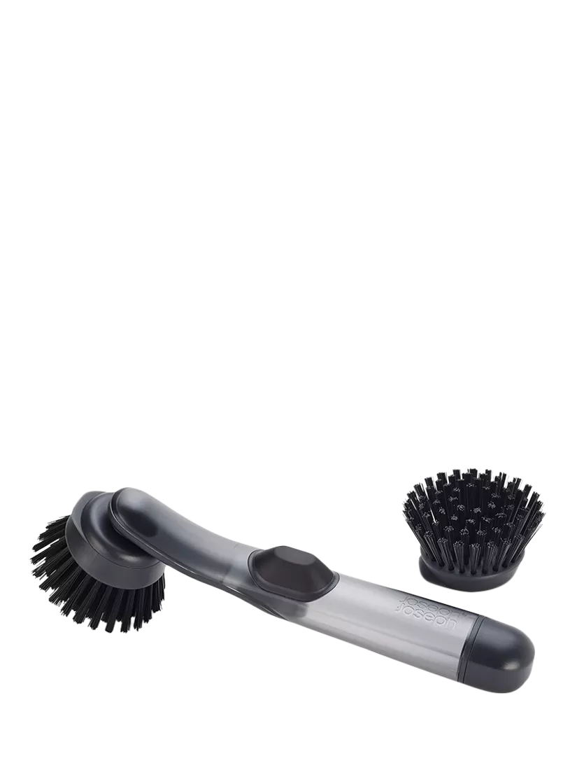 This refillable soap-dispensing dish brush is part of the Joseph Joseph SinkTech washing-up system, which includes a range of interchangeable heads, handles and accessories that extend its lifespan and make dishwashing easier. It features durable, stain-resistant bristles that deliver an effective clean each time, an integrated pan scraper for stubborn stains and comes with a replacement brush head.To release soap into the bristles, there's an easy-push button located on the handle. To refill, simply twist off the tip of the brush handle and add the required amount of liquid soap.