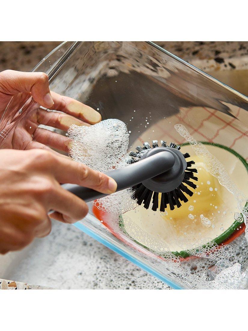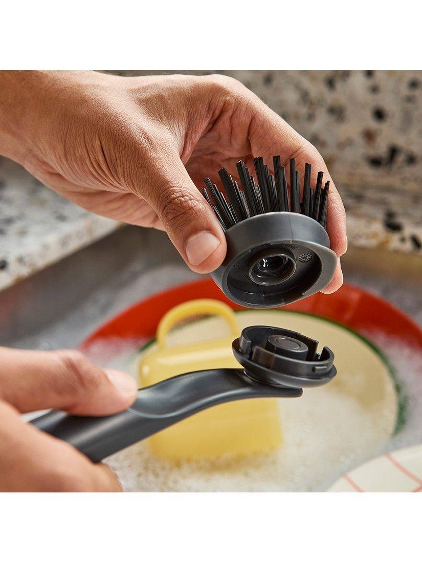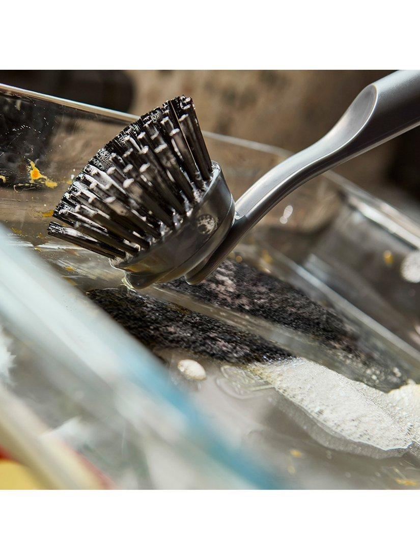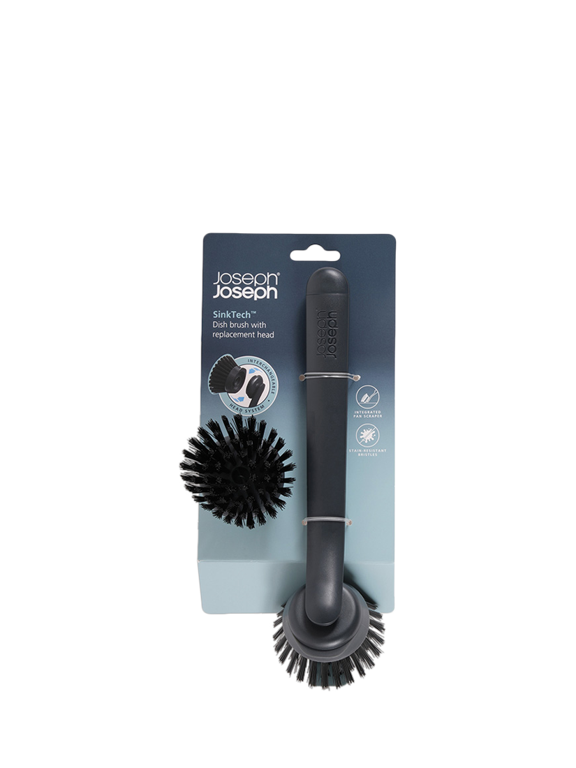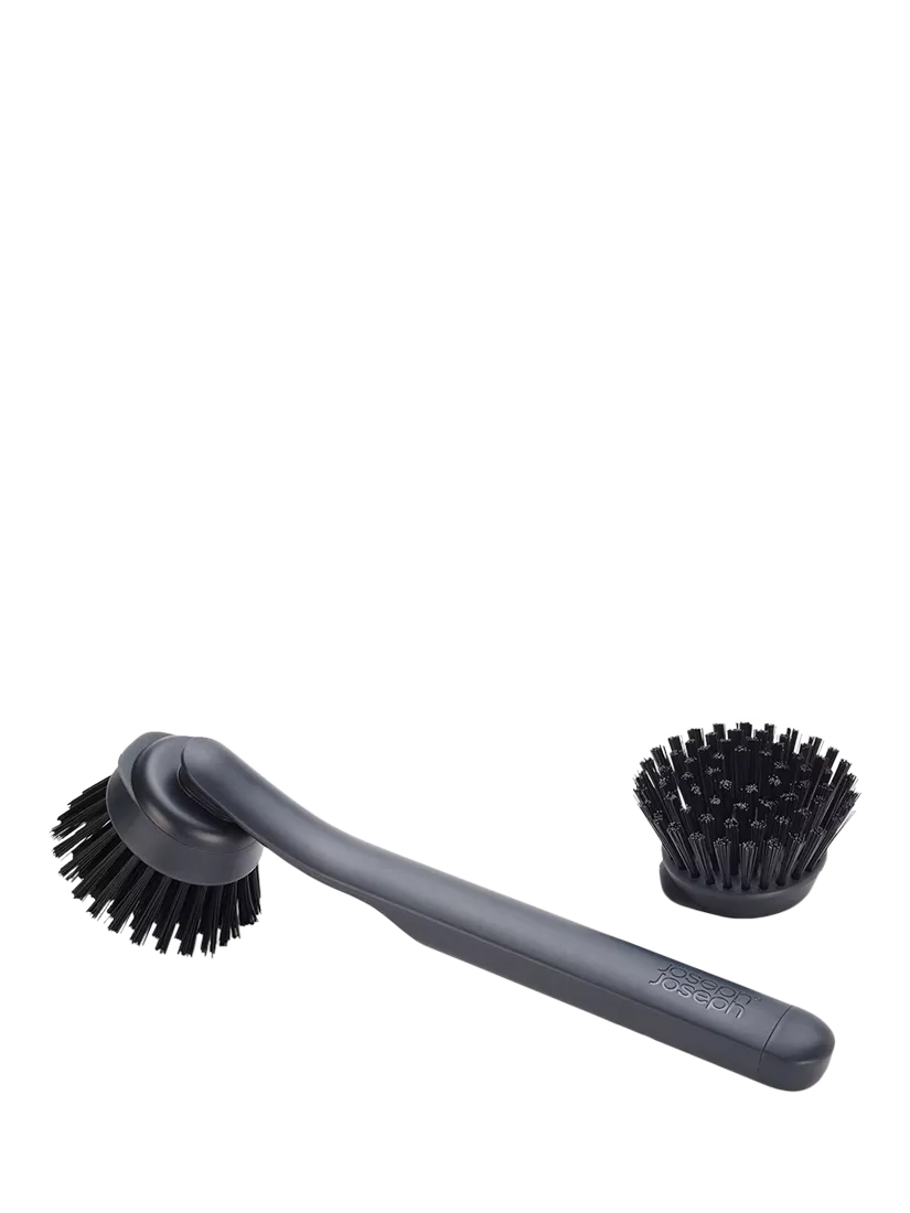 This washing up brush features durable, stain-resistant bristles that deliver an effective clean each time, an integrated pan scraper for stubborn stains and comes with a replacement brush head.