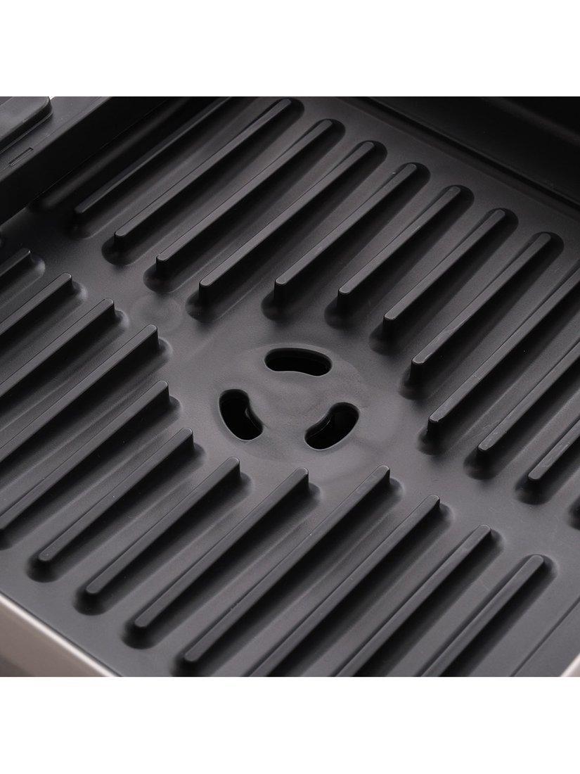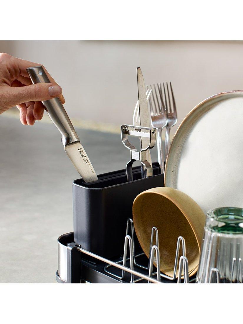 Ribs on the base prevent water becoming trapped under cups and glasses and it features a spout that can be positioned in three different ways to drain directly into your sink. The rack also includes a removable cutlery pot for easy cleaning with a dedicated knife slot for safer drying of sharp blades.