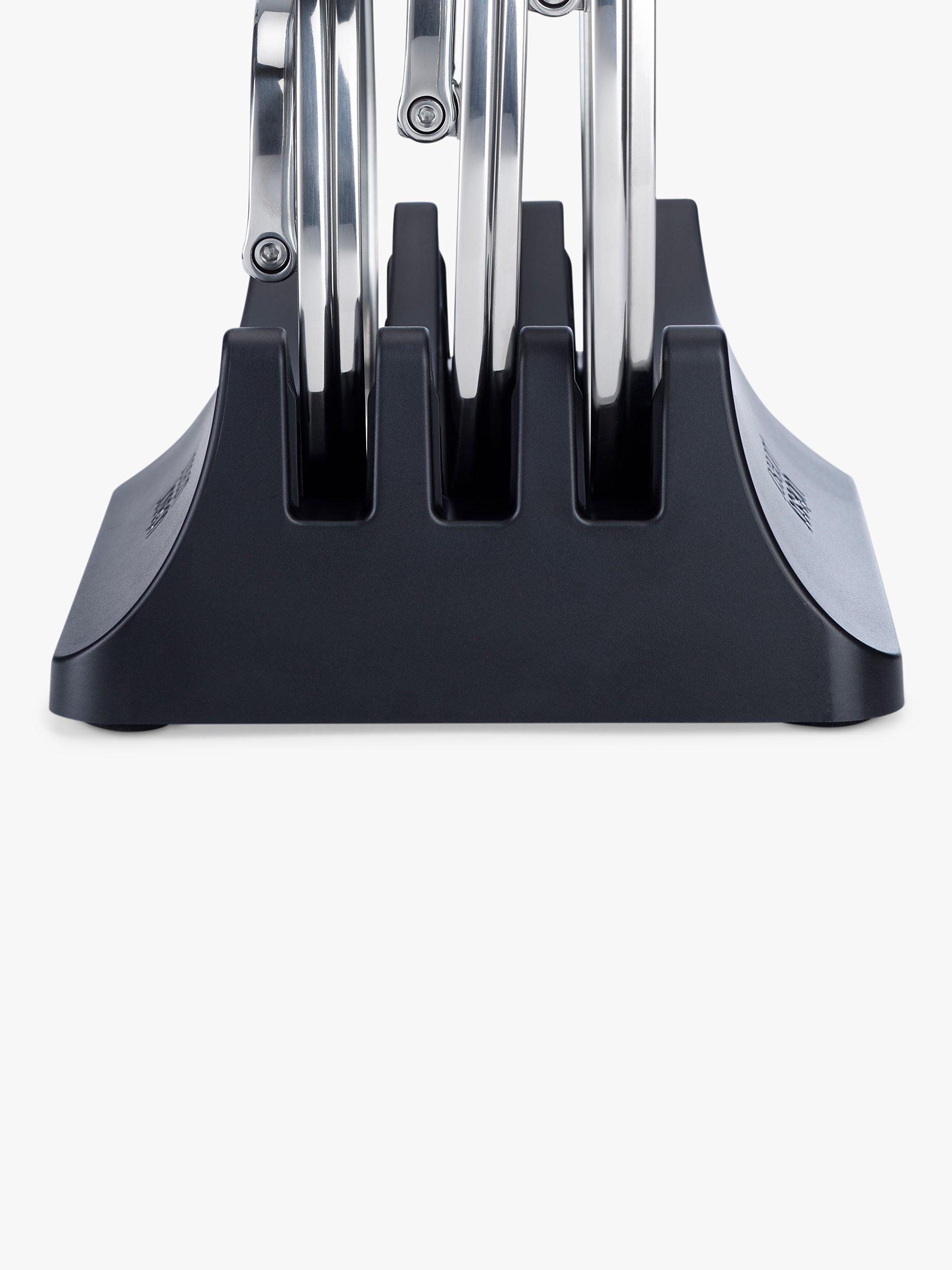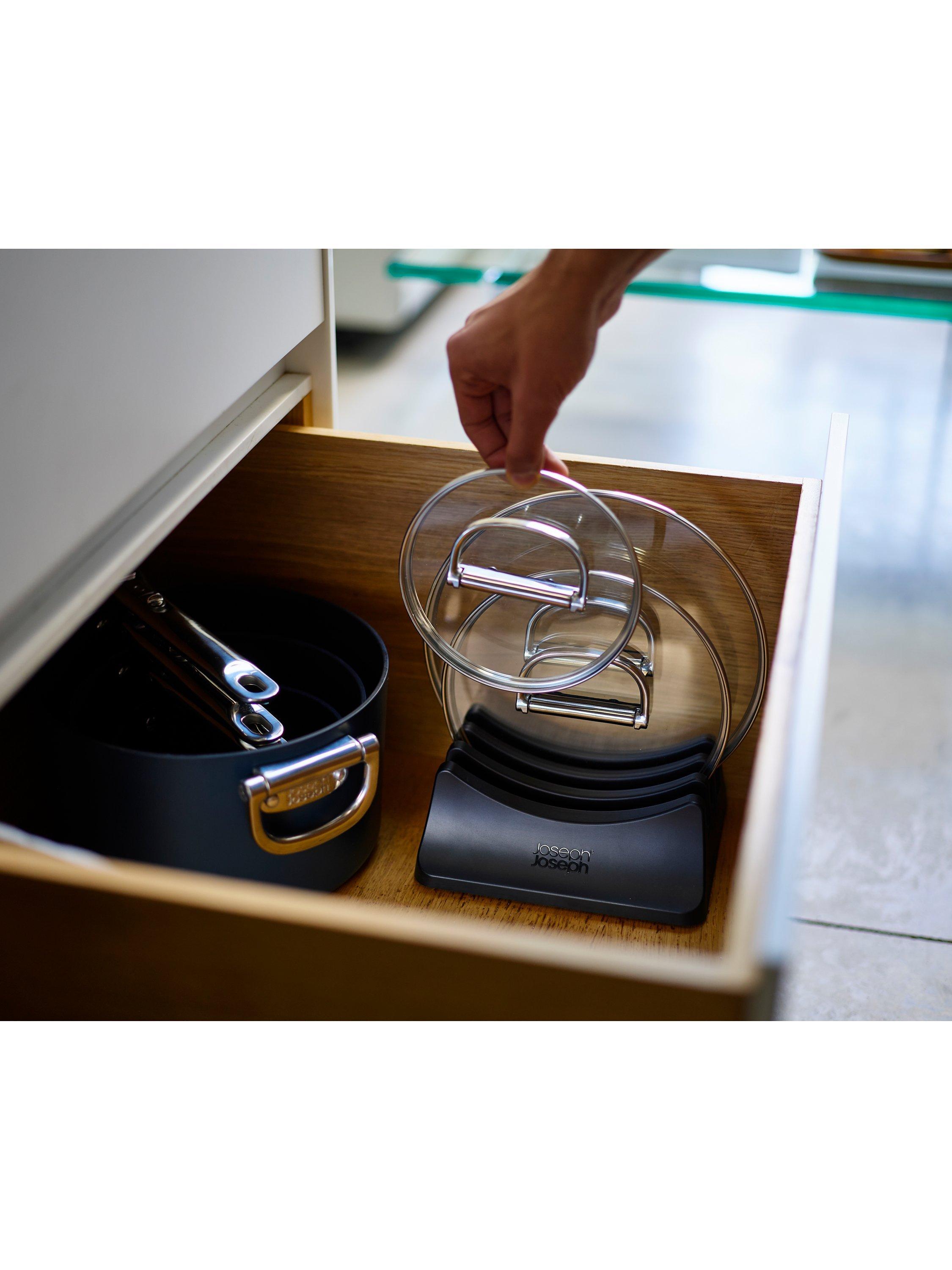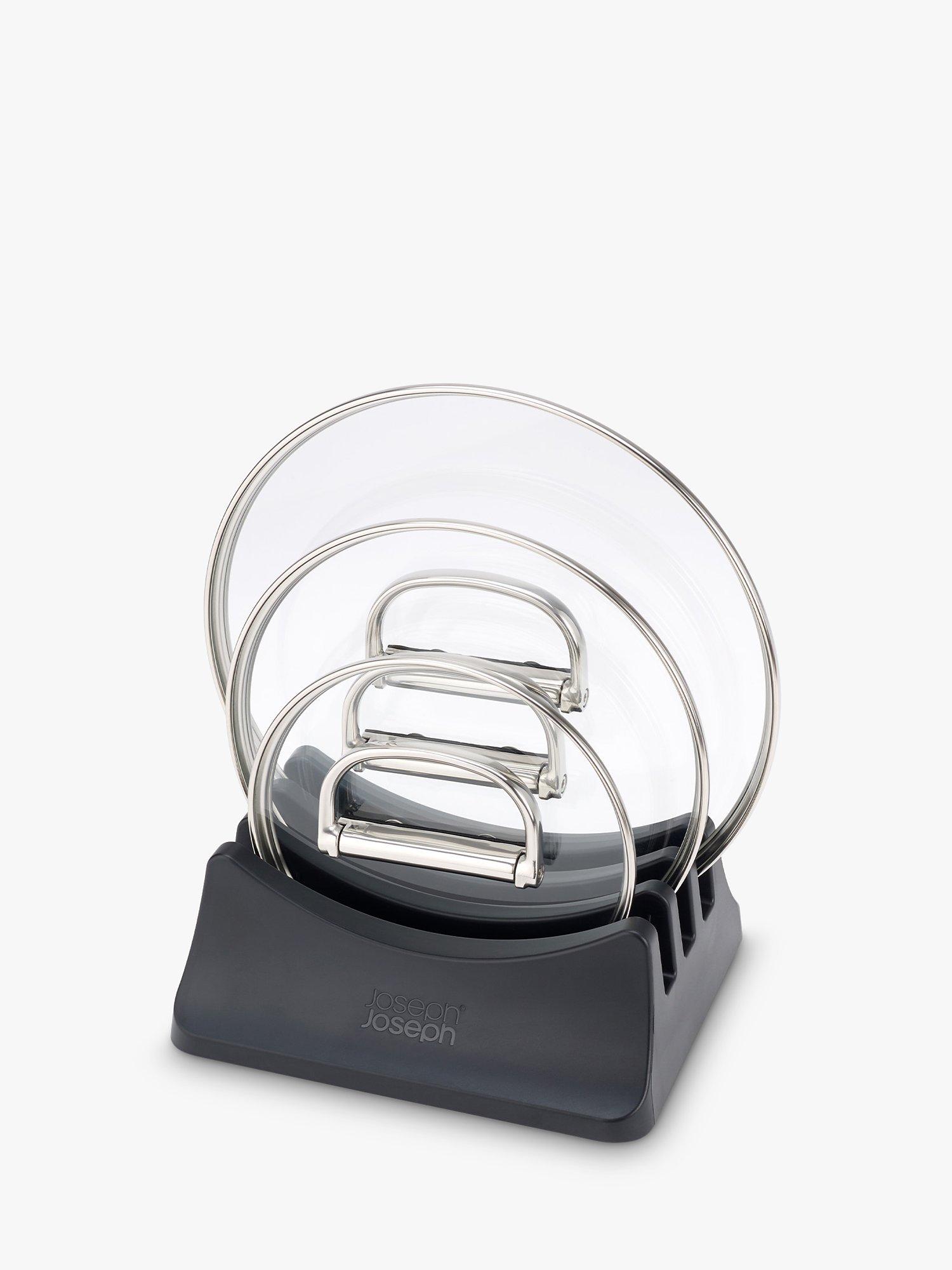Pan lid stand specifically designed to hold Joseph Joseph Space cookware lids. With its sturdy base and non-slip feet, it can securely store up to three glass lids of different sizes, keeping drawers and kitchen cupboards organised and ensuring you can find exactly the right lid when you need it.