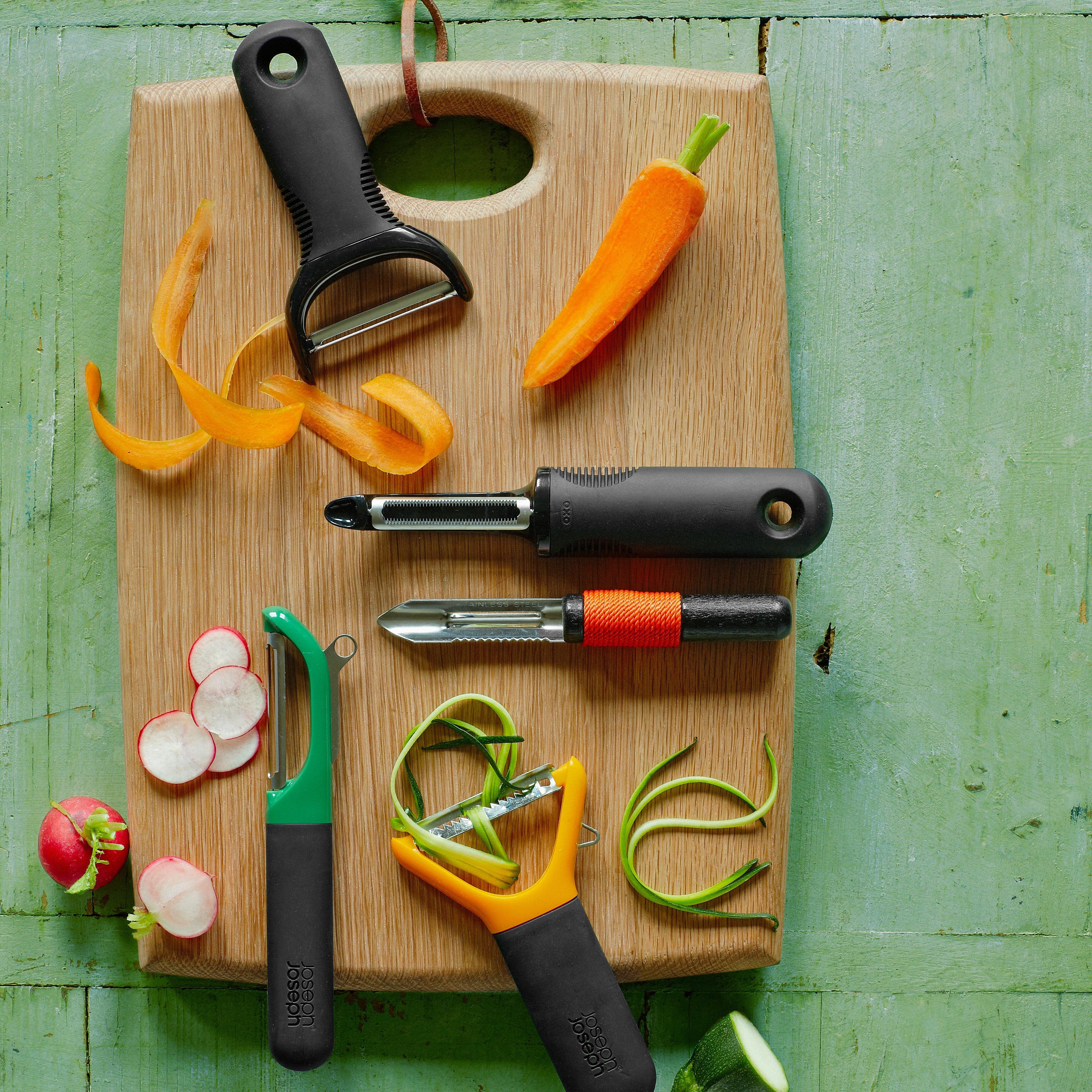 Suitable for right- and left-handed users alike, this vegetable peeler features an ergonomic and easy-grip handle, and a scraper for removing vegetable dirt.