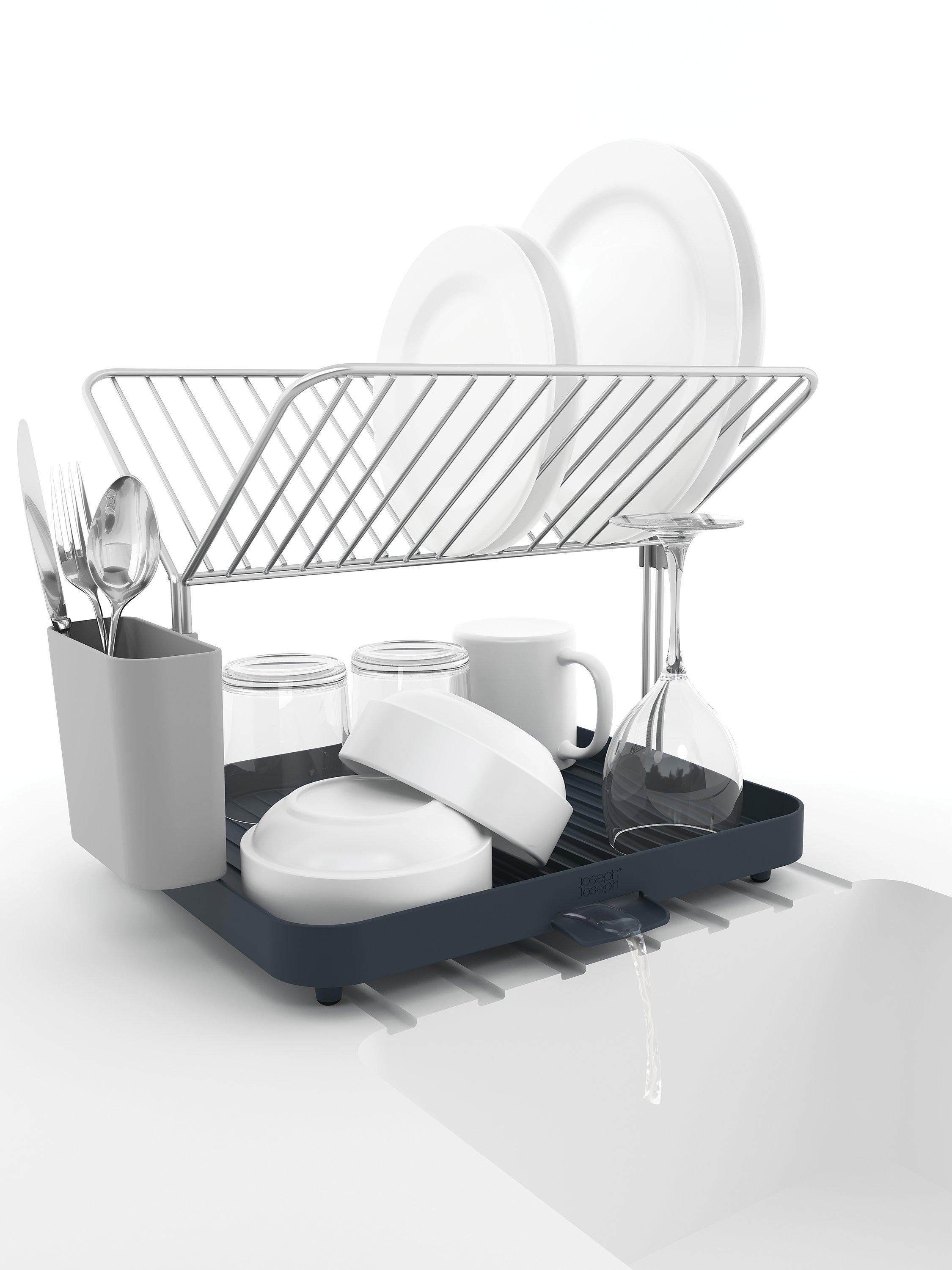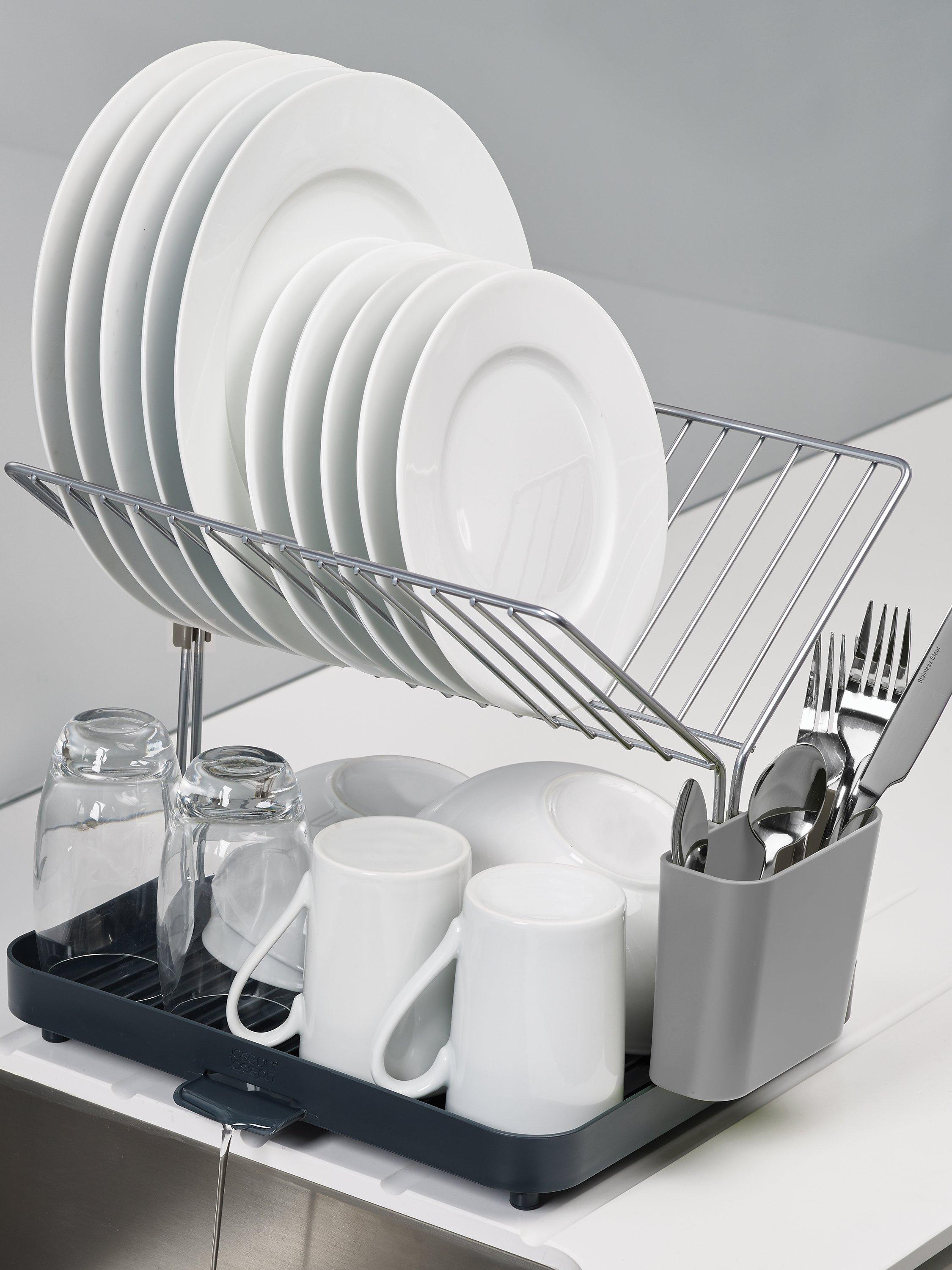 The large self-draining utensil pot that clips onto the side means you can drain everything for four full place-settings in a very small space. The base features sloping ribs to allow water to drain freely, a fixed draining spout for emptying into the sink and non-slip feet. The whole unit dismantles for easy cleaning.