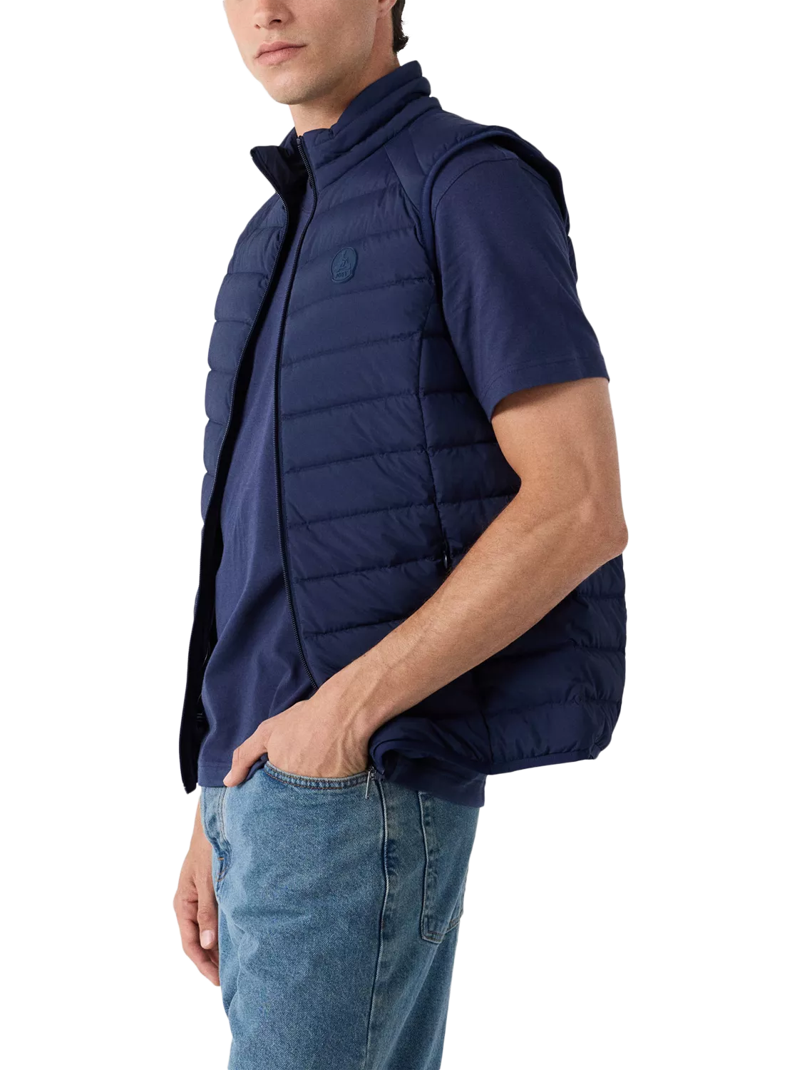 A sleeveless down jacket in a polyamide fabric. It features 2 invisible zip side pockets and contrasted colour piping inside.