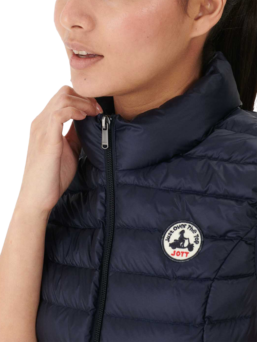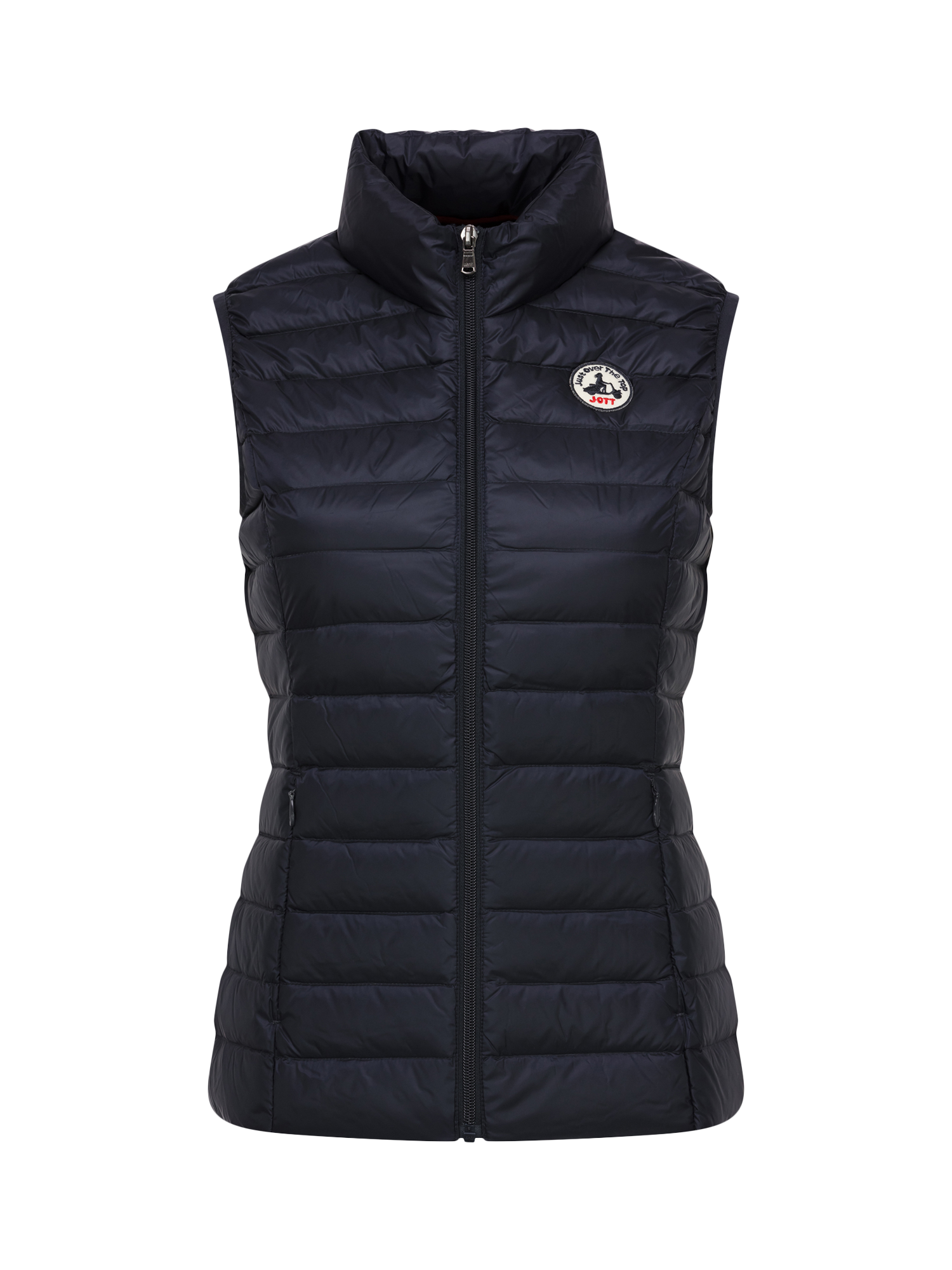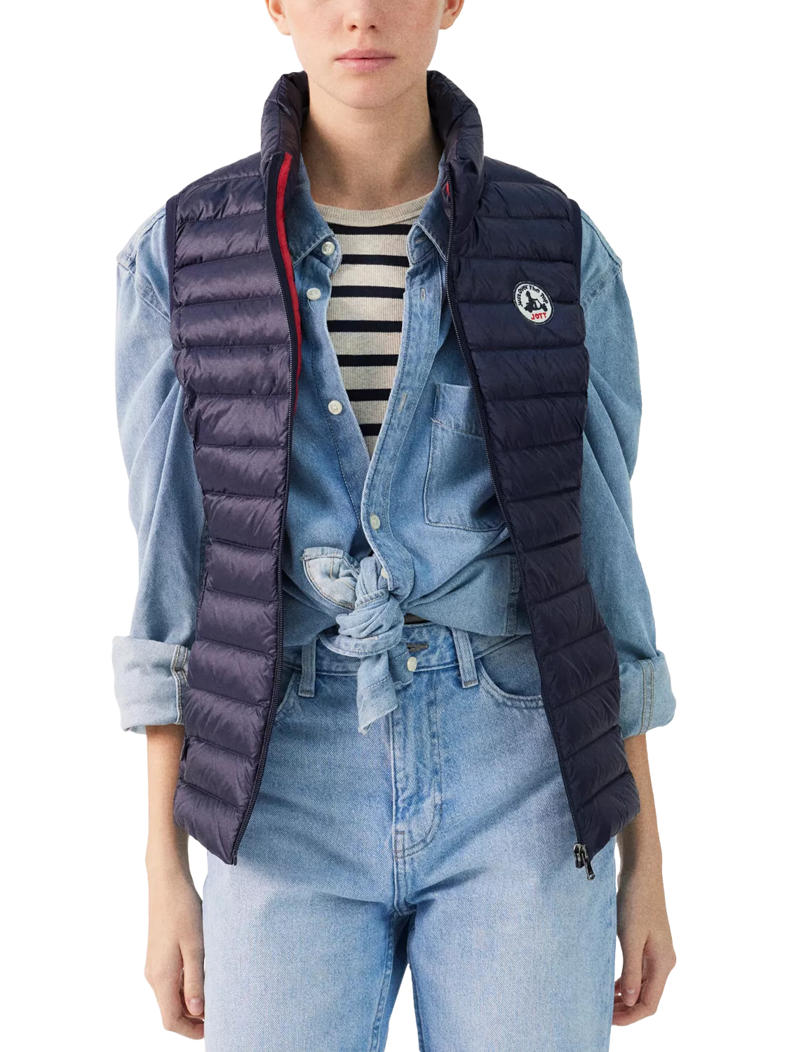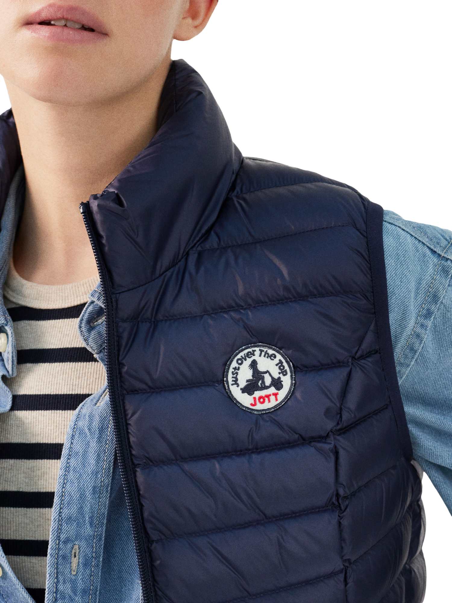 A sleeveless down jacket in polyamide fabric. It has 2 invisible zip side pockets and contrast colour piping inside.