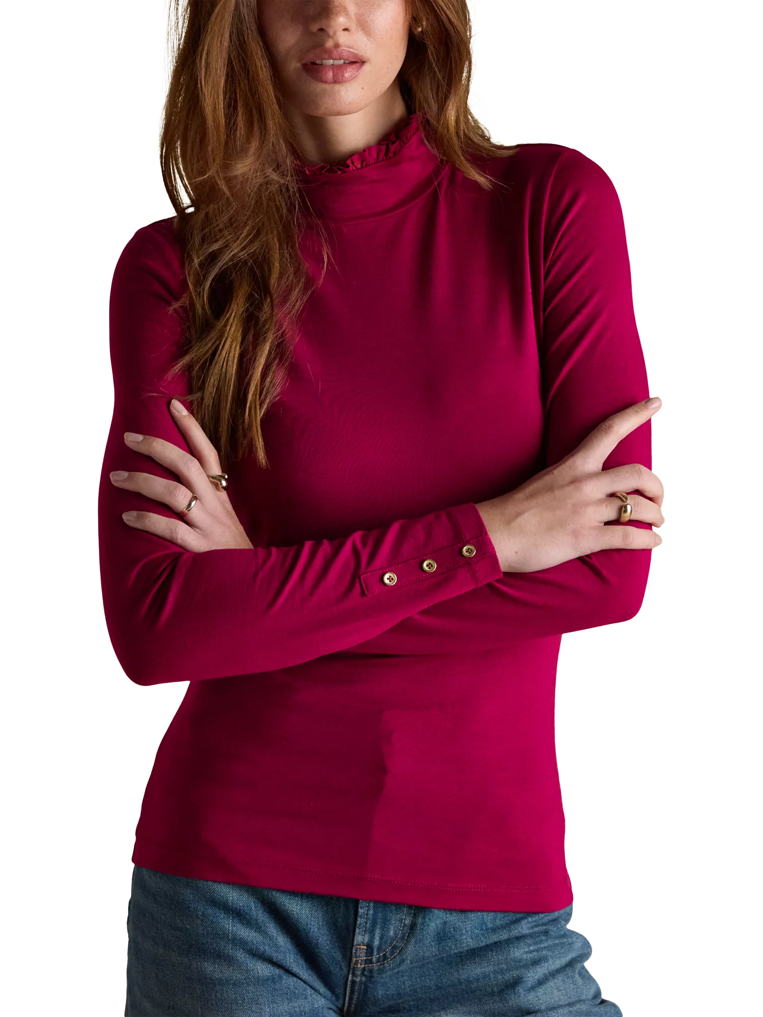 With a slim fit that hugs the body, the Amy jersey roll neck is the perfect base layer to build your outfits around. But it's certainly not without its details. The long sleeves feature five metal accent buttons, and the neck is trimmed with a woven frill - we think it'll look quite the part popped out of a knit.