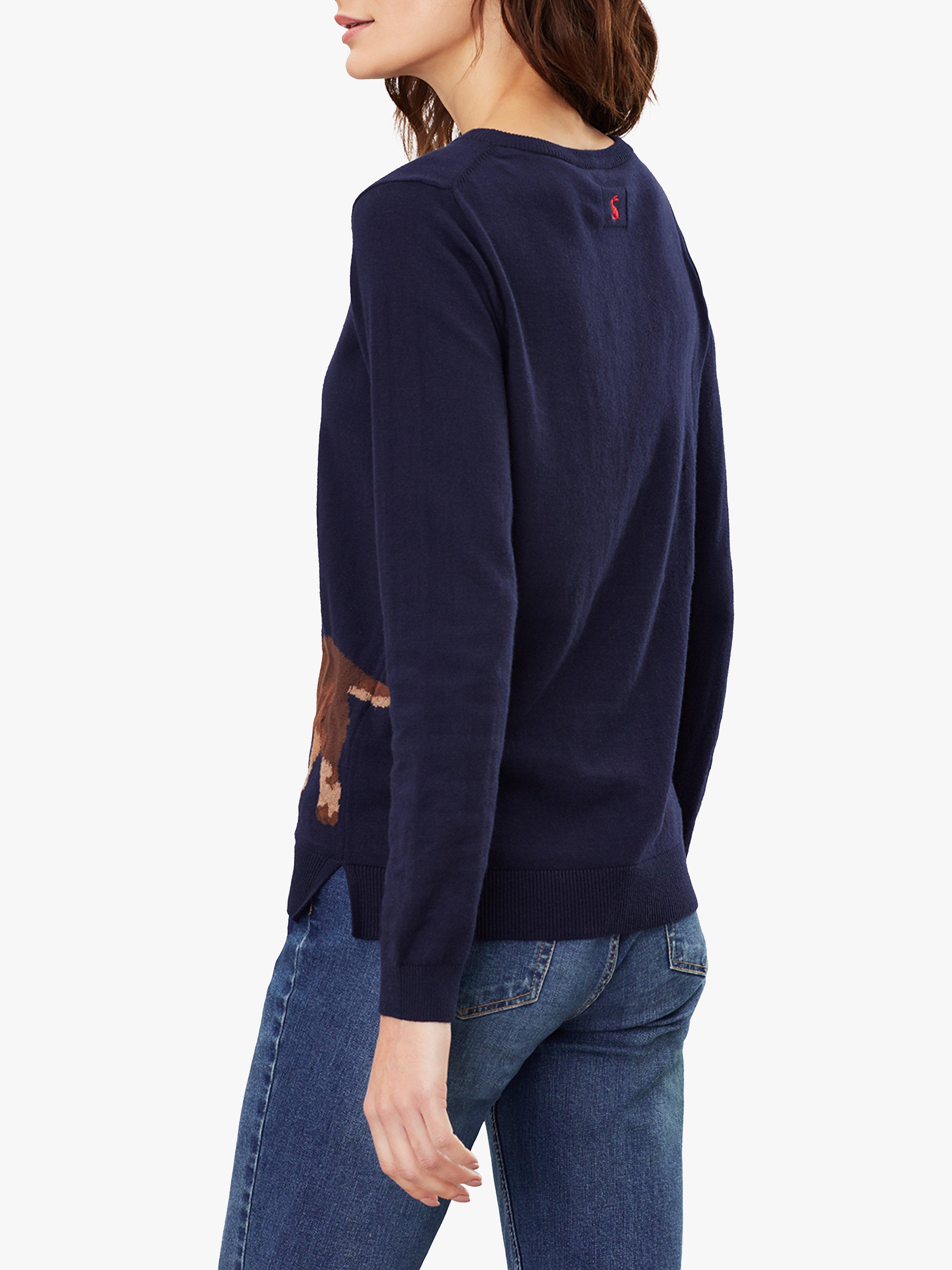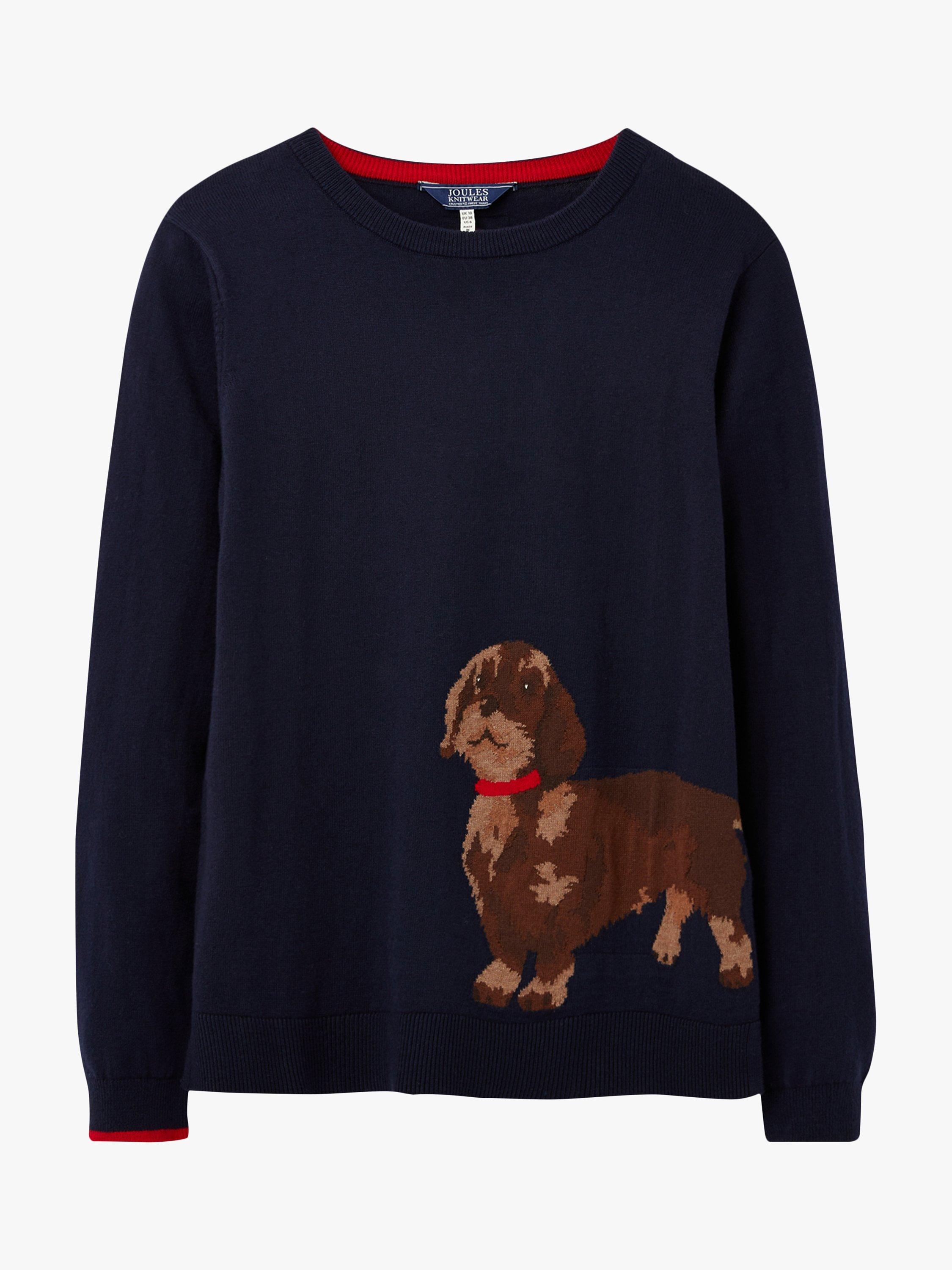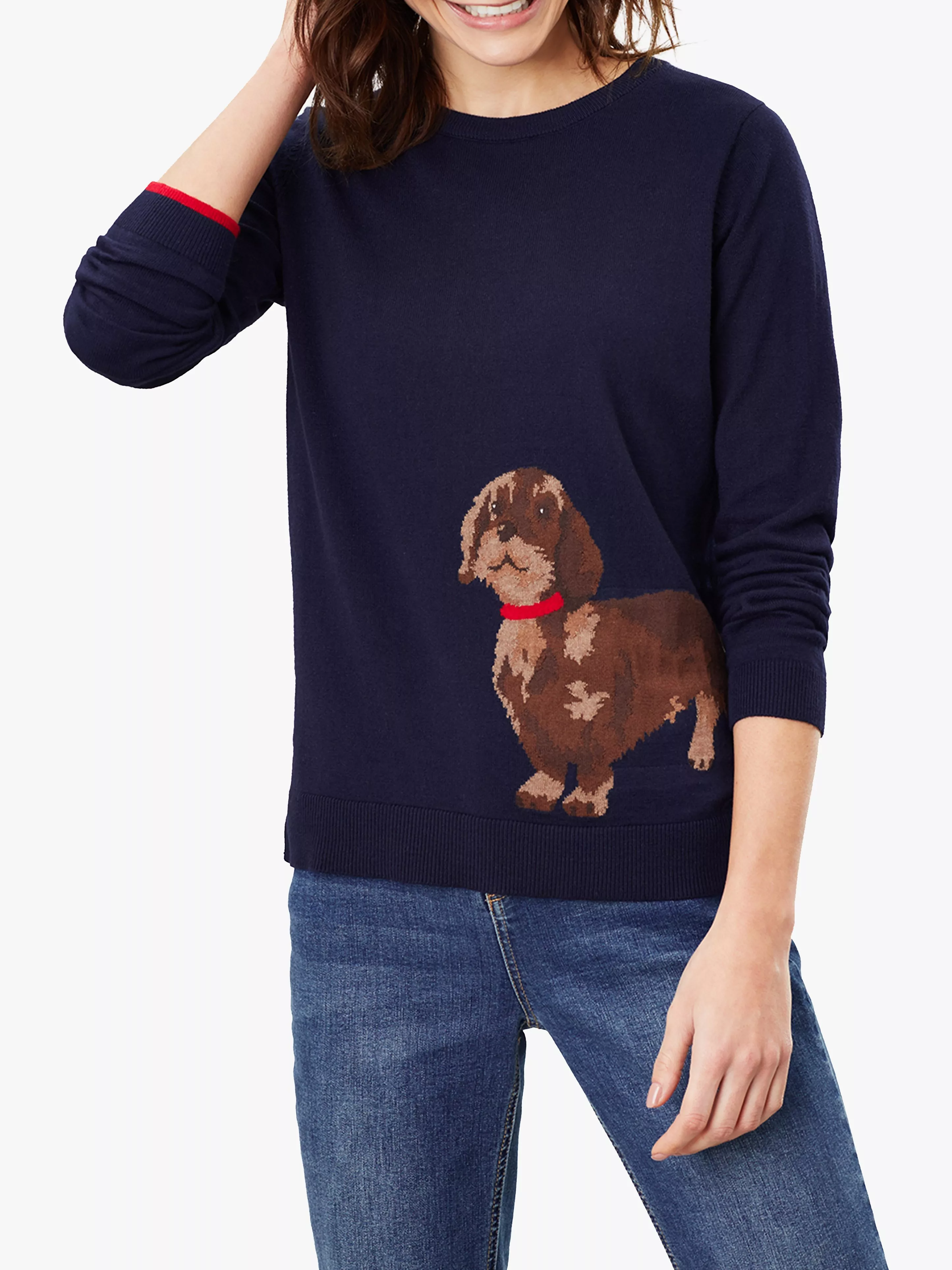 Beat the chill without compromising on style by layering up in this cosy Bess jumper from Joules. Framed by flattering dropped shoulders and an elegant round neckline, it showcases Joules signature attention to detail with side-seam ribbing, contrast back-neck detailing and hare embroidery on the chest - complete with a playful dachshund intarsia, it looks great paired with denim or layered under waxed jackets on wintery weekend walks.