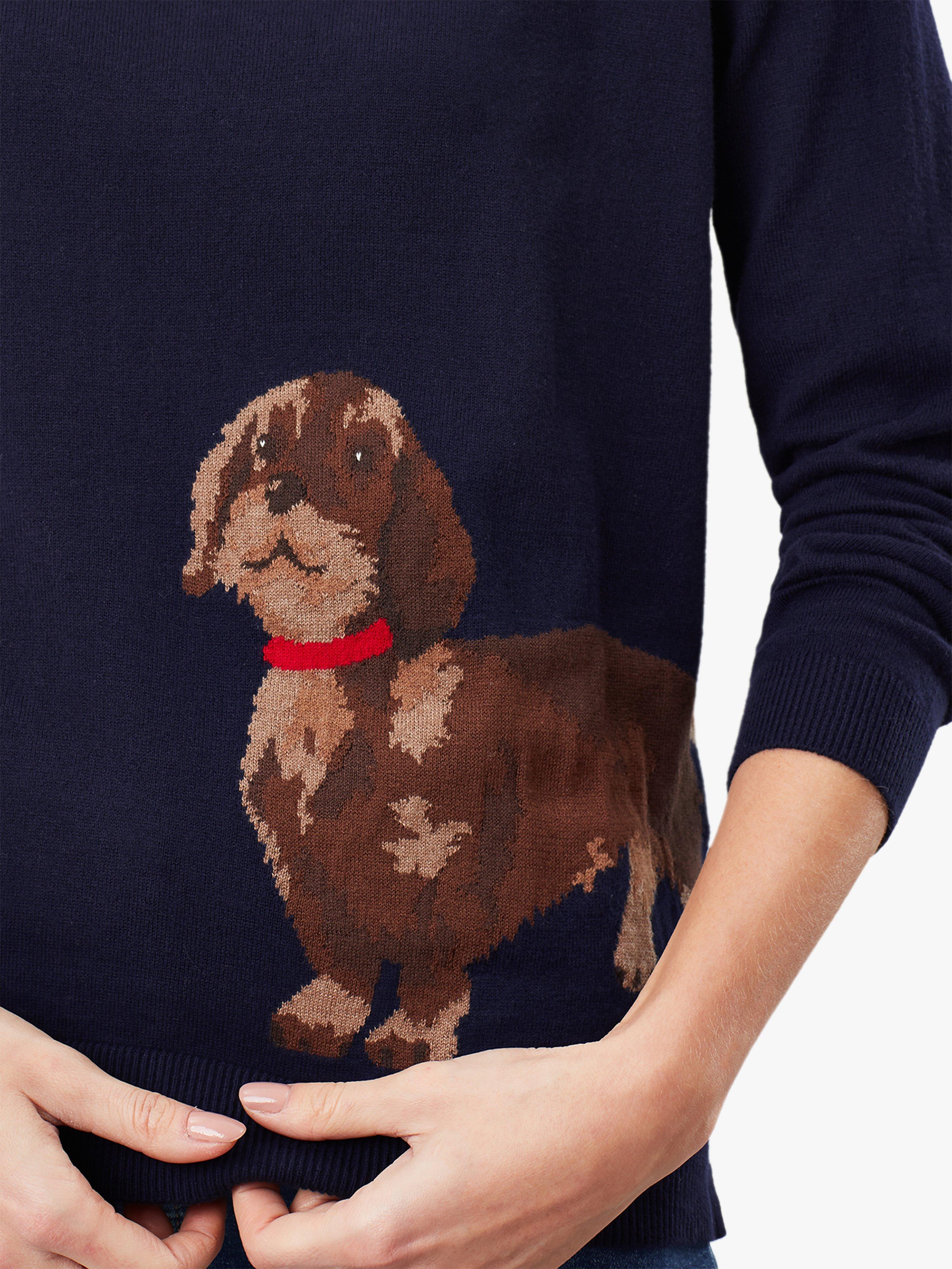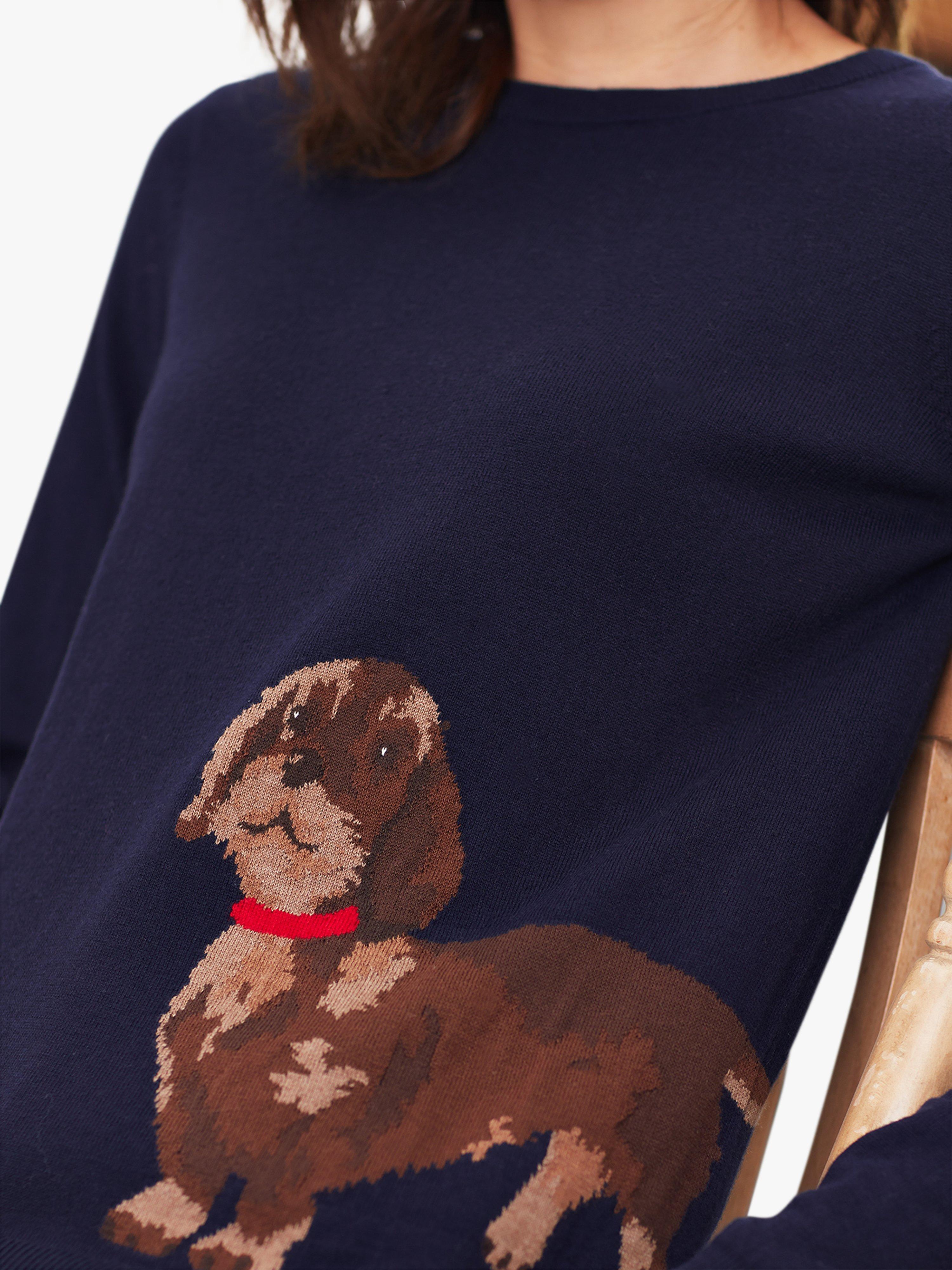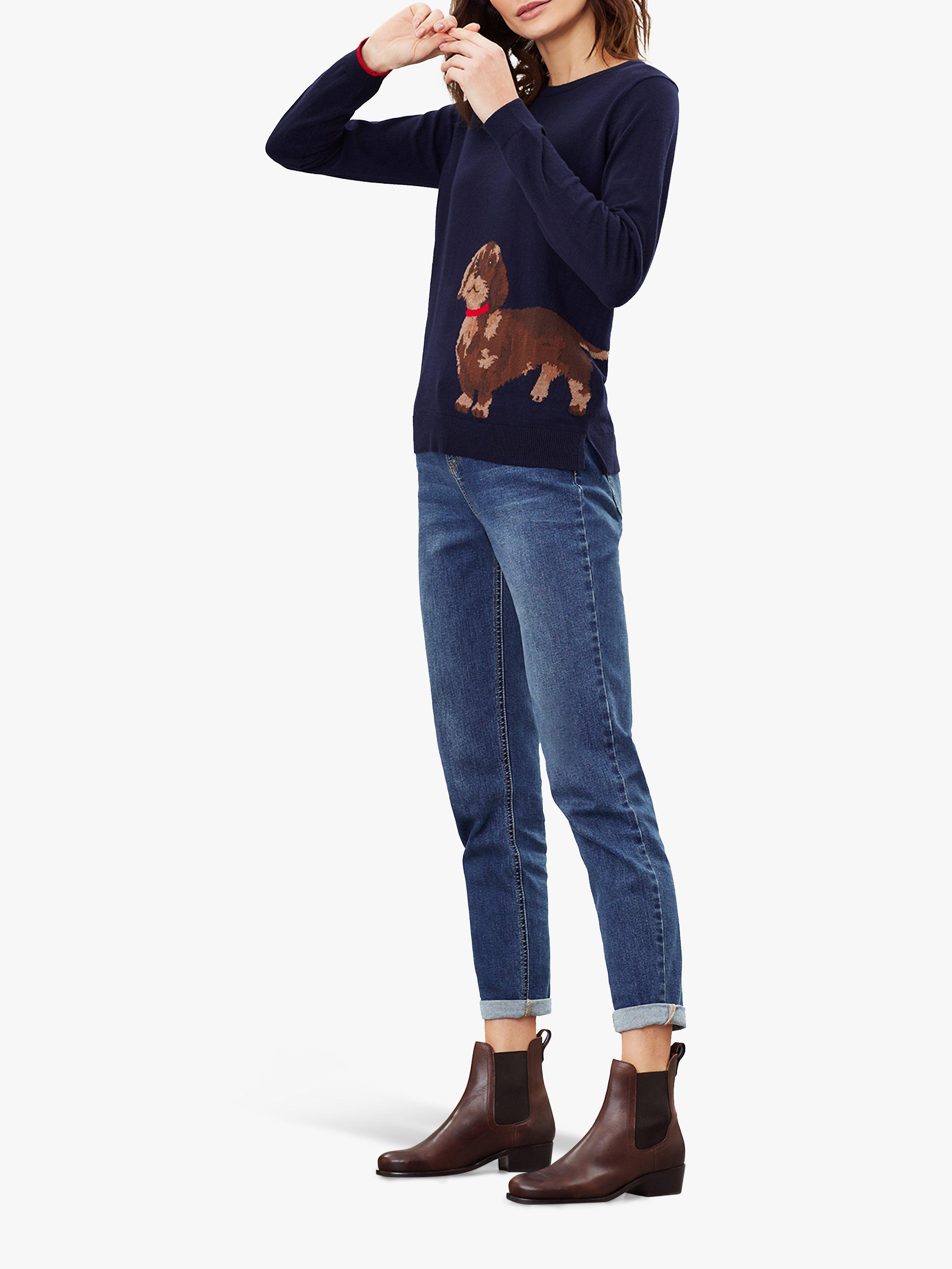 Beat the chill without compromising on style by layering up in this cosy Bess jumper from Joules. Framed by flattering dropped shoulders and an elegant round neckline, it showcases Joules signature attention to detail with side-seam ribbing, contrast back-neck detailing and hare embroidery on the chest - complete with a playful dachshund intarsia, it looks great paired with denim or layered under waxed jackets on wintery weekend walks.