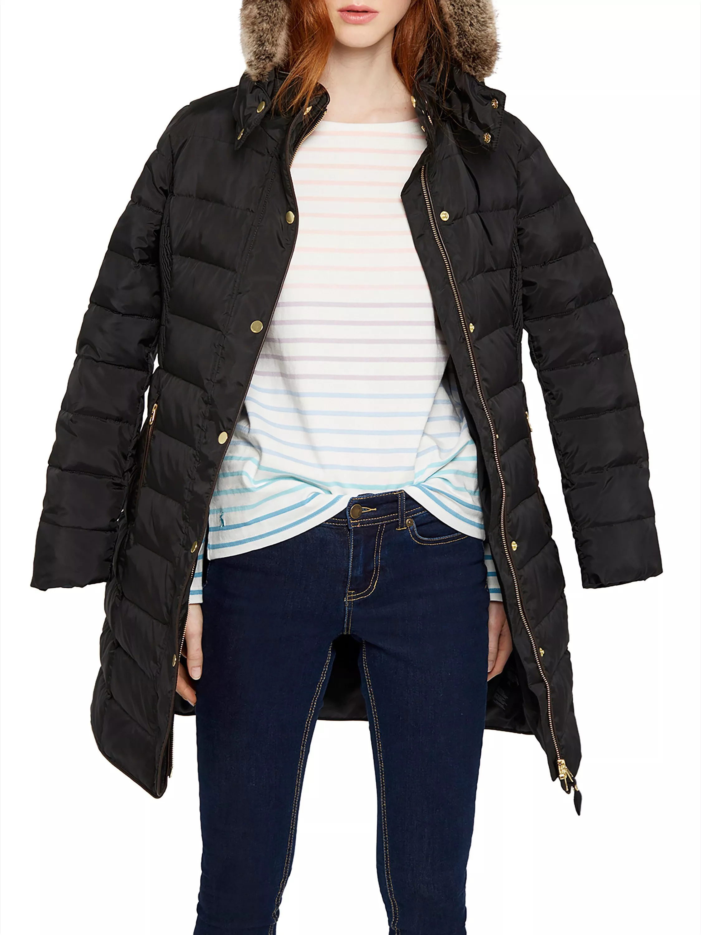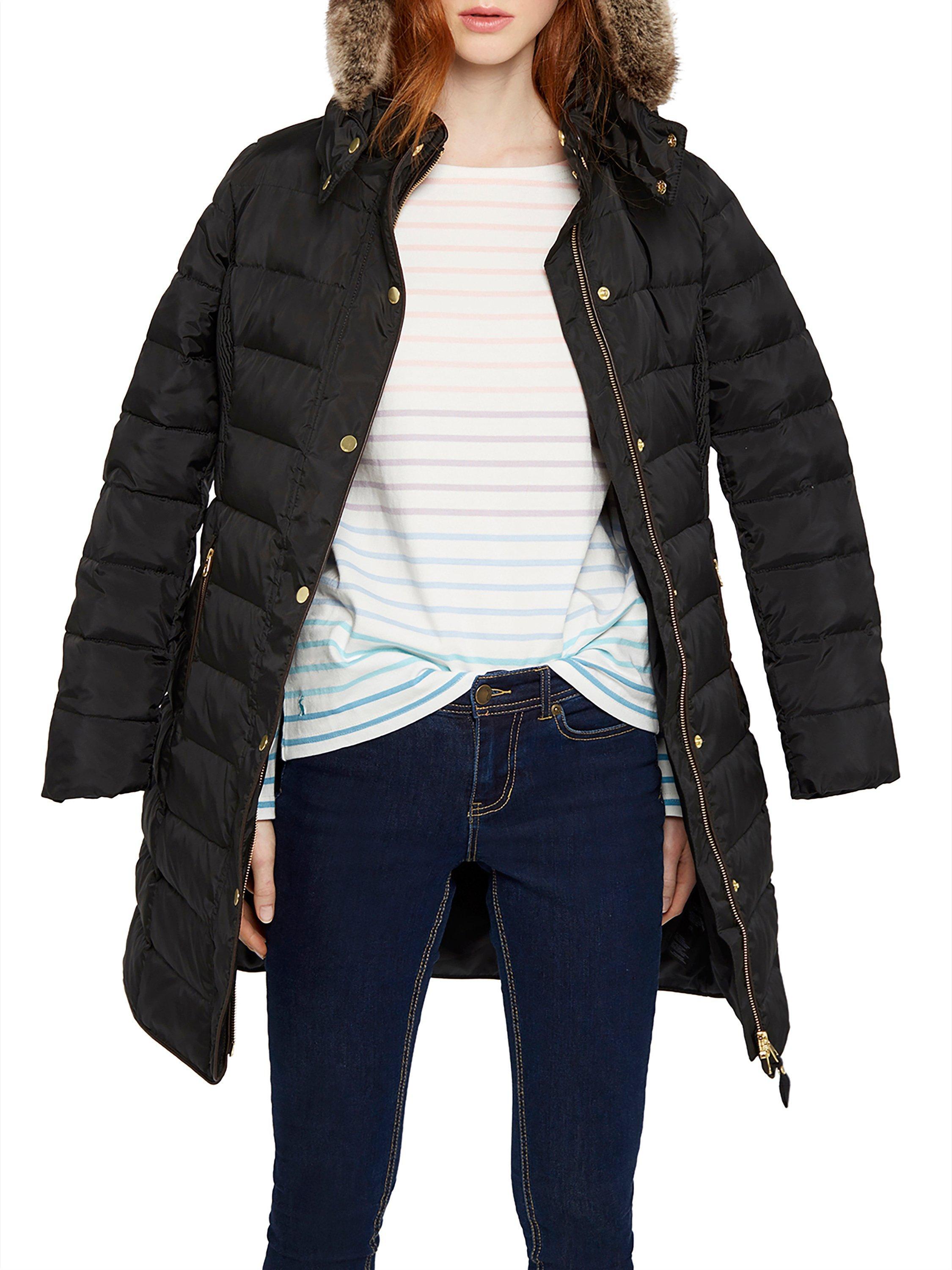 Padded with an imitation down and down fabric for superb warmth and comfort, this mid-length design features a detachable faux fur lined hood to help you create different outfits, a zip and popper fastening, gathered side detail, and front pockets.