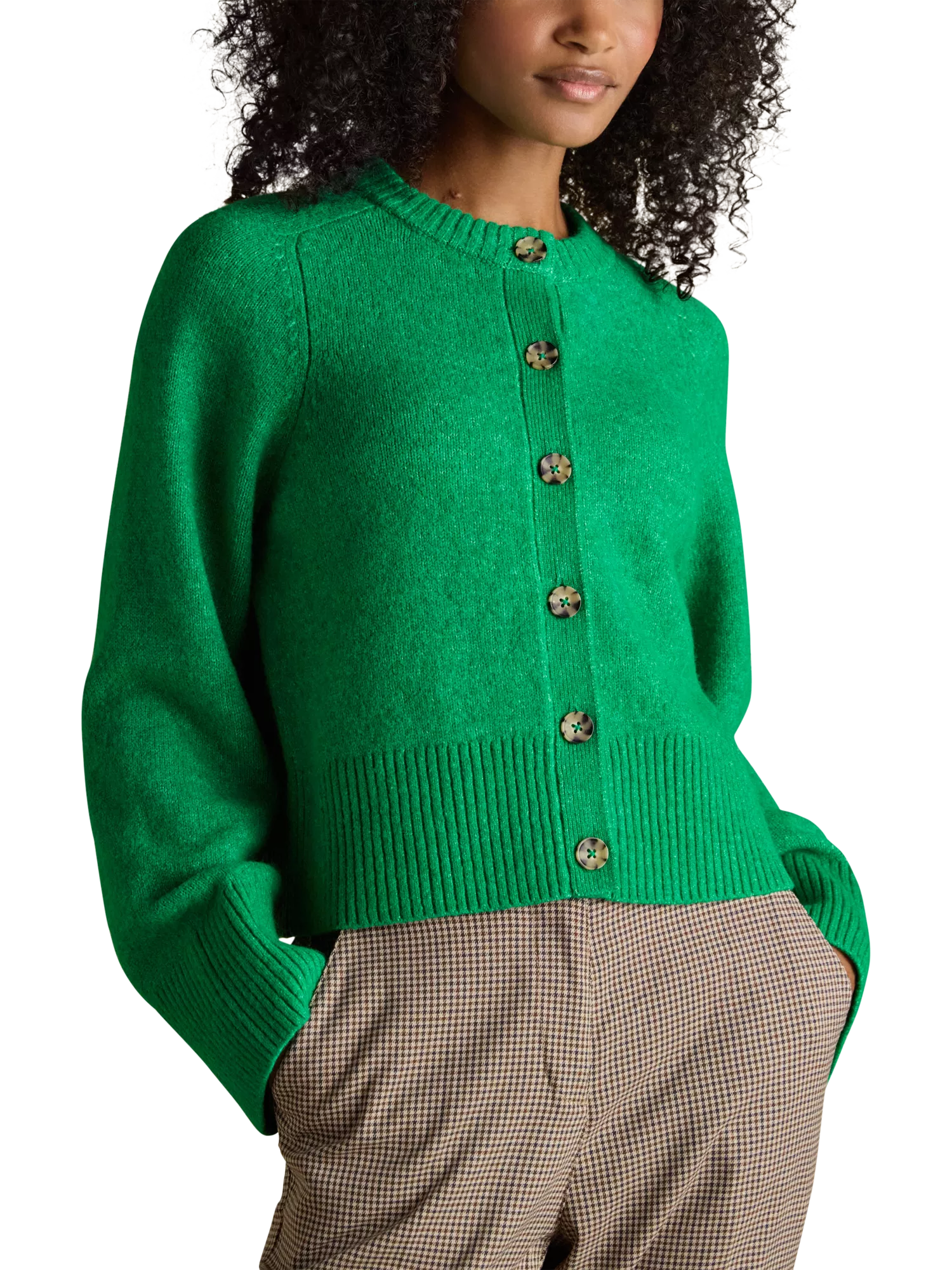 An easy-to-wear relaxed-fit cardigan. The round neckline lends itself to layering over a statement collared shirt or blouse, or can be worn open over a t-shirt or fitted top for a different look.