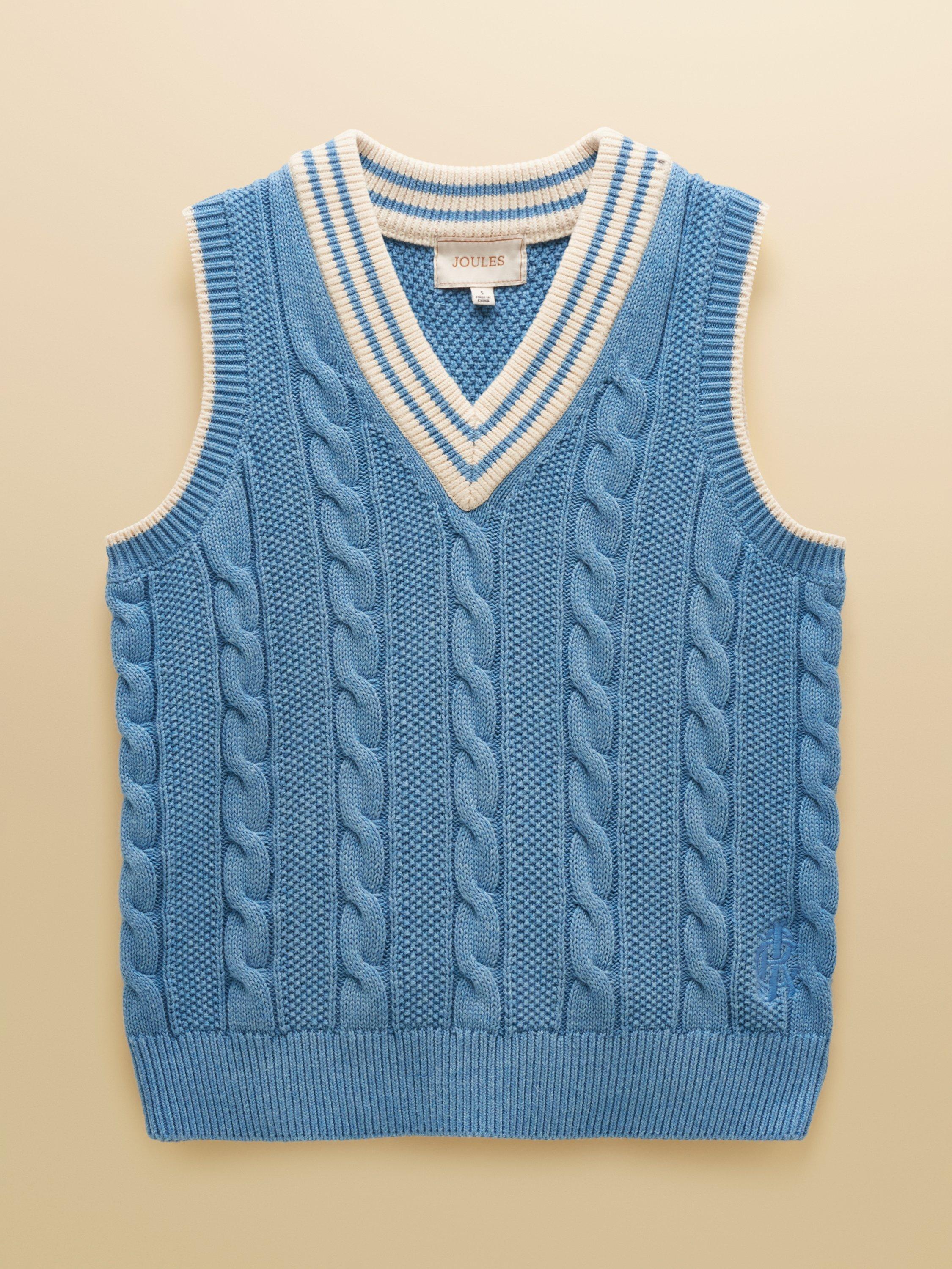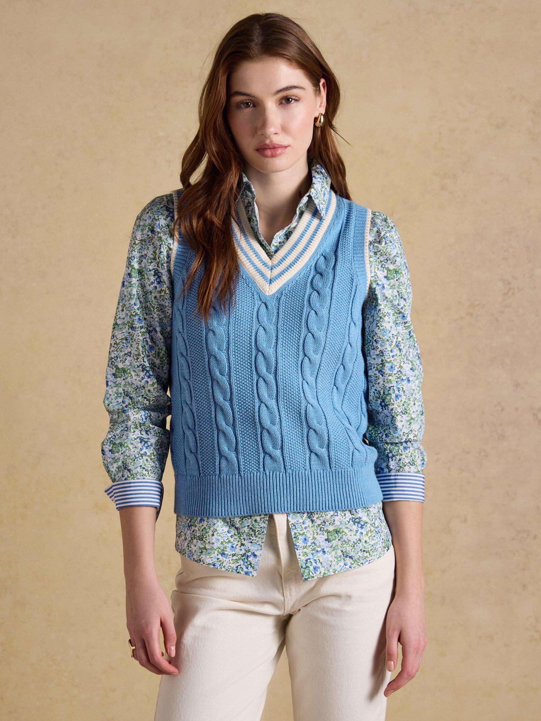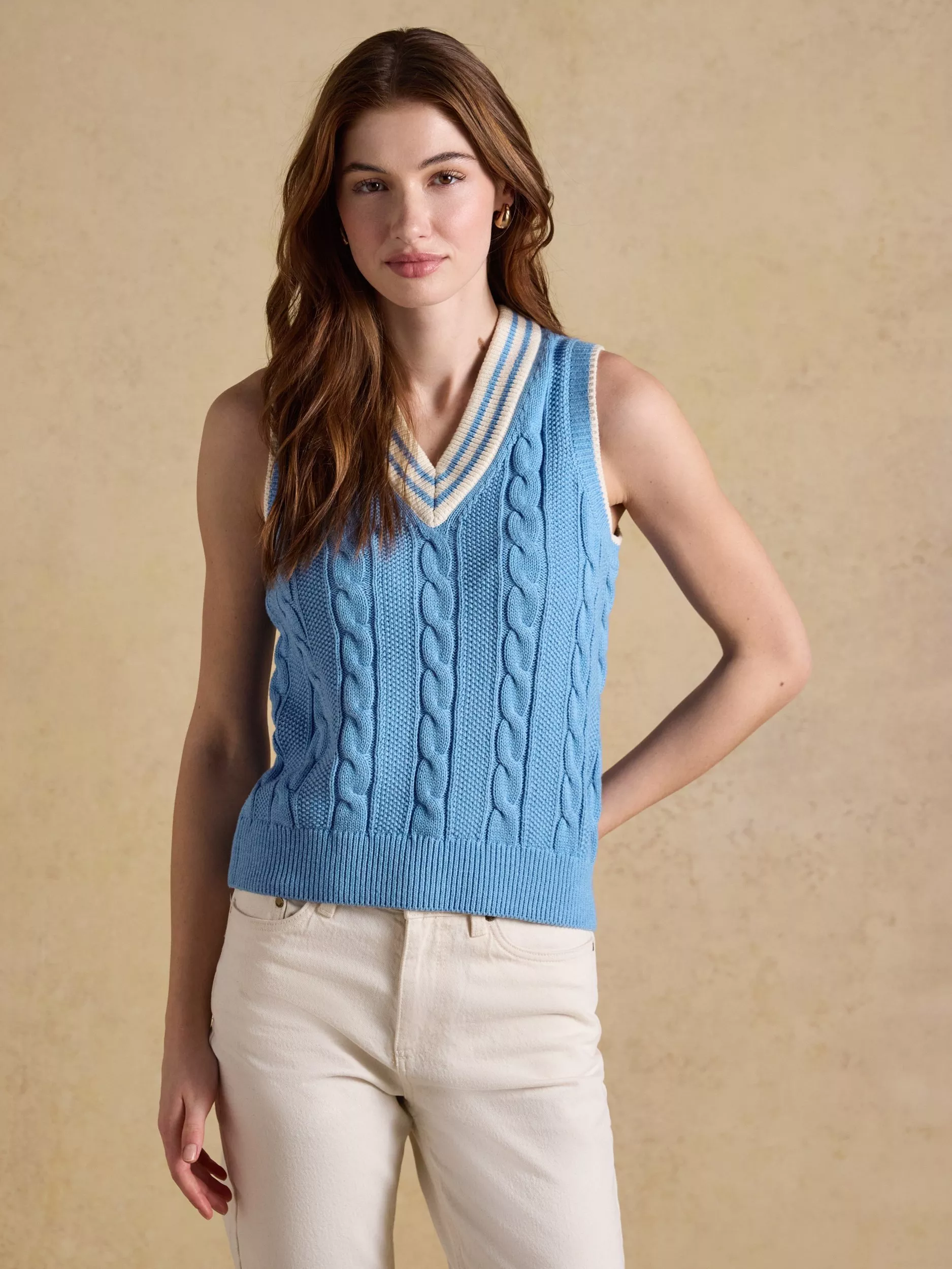 Drawing style influence from the world of cricket, this cable knitted tank will help you achieve a sporty look this season. It carries details synonymous with the sport, including a deep ribbed V-neck with contrasting stripes, and uses a classic cable knit technique on the body and sleeves, along with a textured moss stitch throughout. Its 100% cotton construction makes it an enduring piece that will live long in your wardrobe. It's completed with a ribbed hem with striped detailing and works well on its own or with a shirt or top layered underneath.