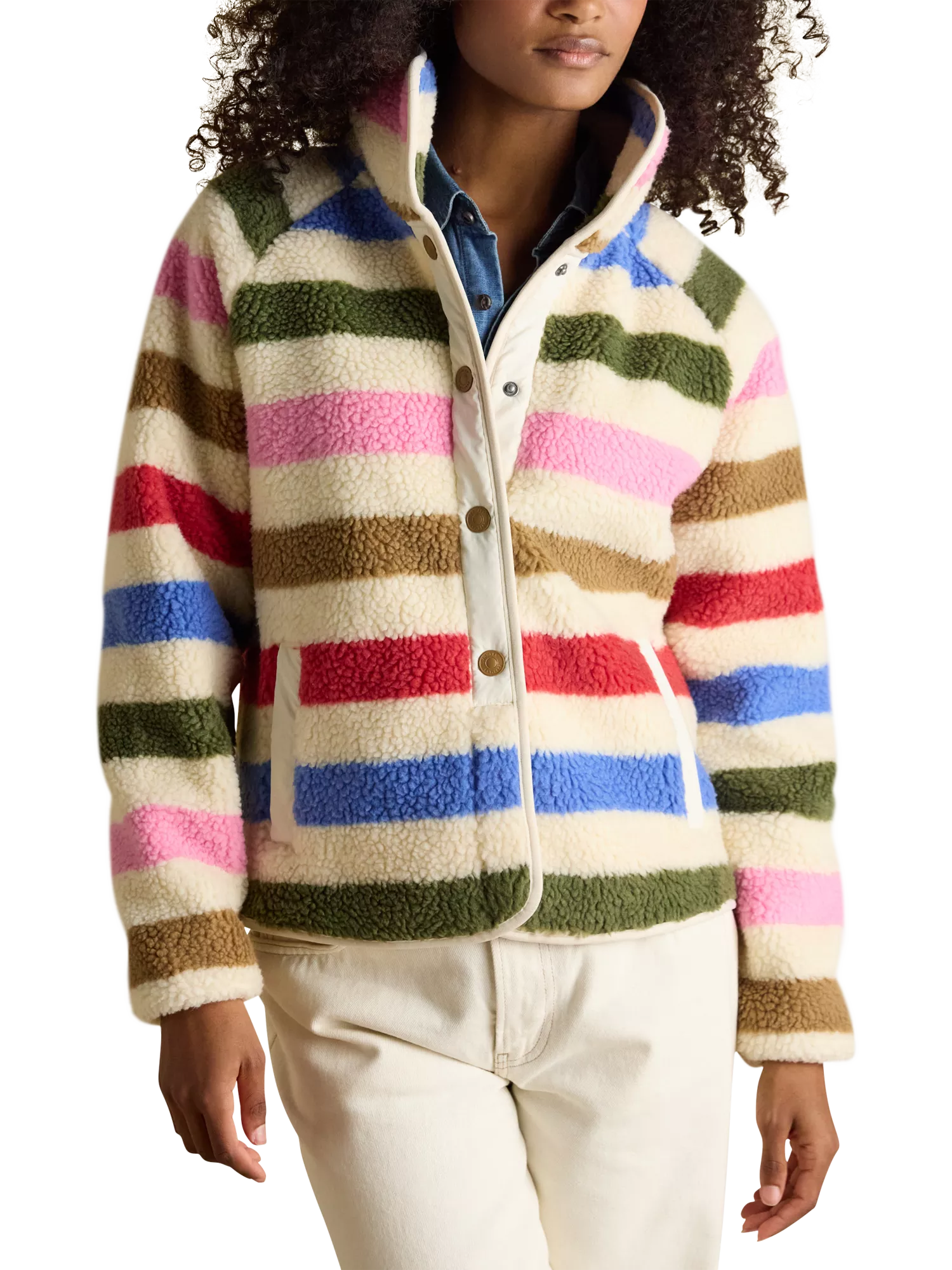 Cosy meets contemporary in this fleece, your new go-to layer for chilly-day comfort with a heritage twist. Made from soft-touch stripe borg fleece, this piece is as tactile as it is eye-catching. Designed with thoughtful detail throughout, it features a funnel collar (that can be worn as a funnel neck or folded down to a traditional collar), raglan sleeves, and a full-length popper fastening, where only the top half is exposed for a clean, structured look. The top popper is Joules-branded, adding a subtle signature finish. The front woven placket and woven welt pockets enhance its elevated feel, while elasticated binding at the hem, collar, cuffs, and placket edge ensures a snug, stylish fit. Turn around and you’ll find a hidden delight — a patch with embroidered Joules branding at the back collar, adding a touch of fun and personality.