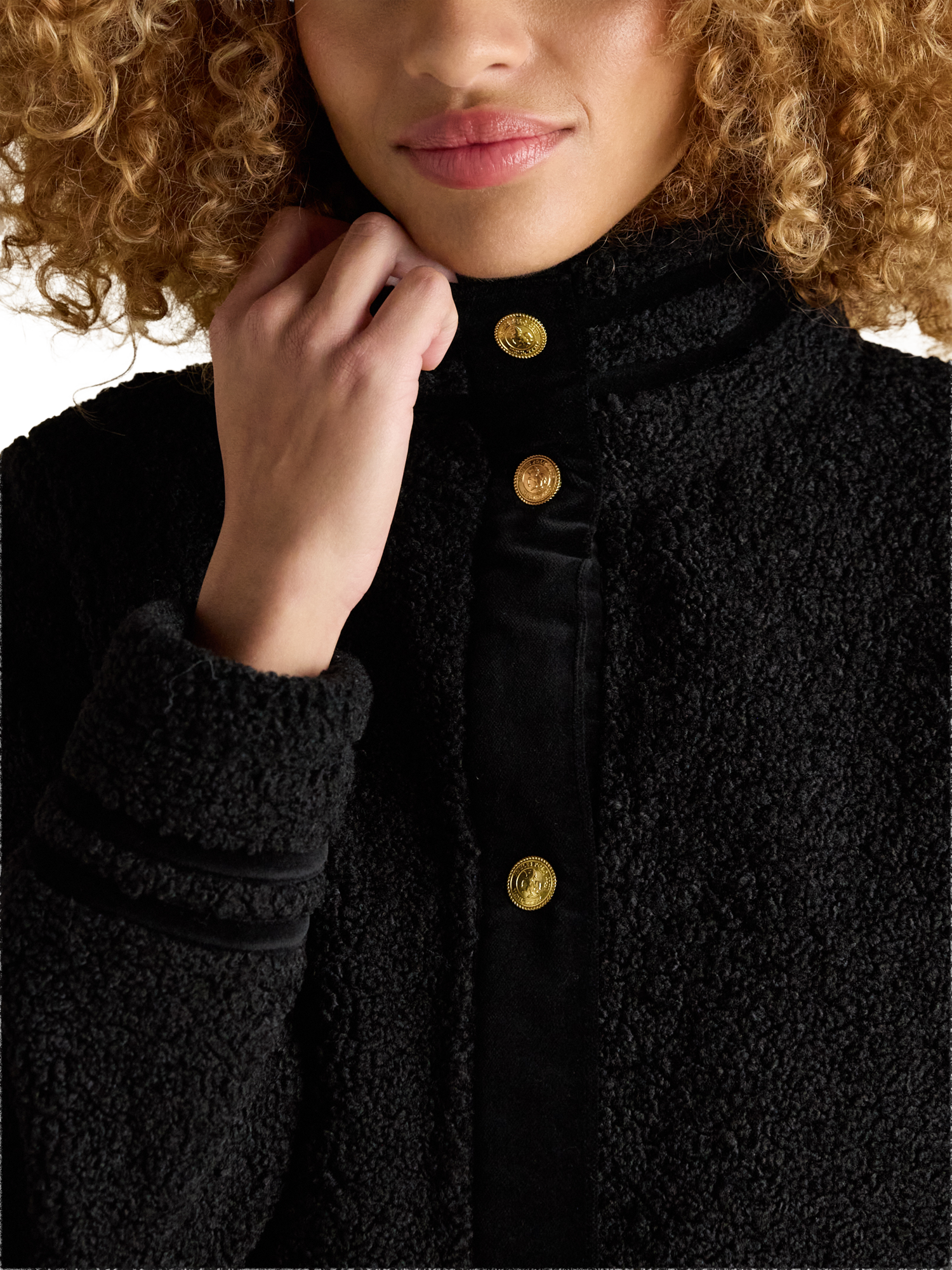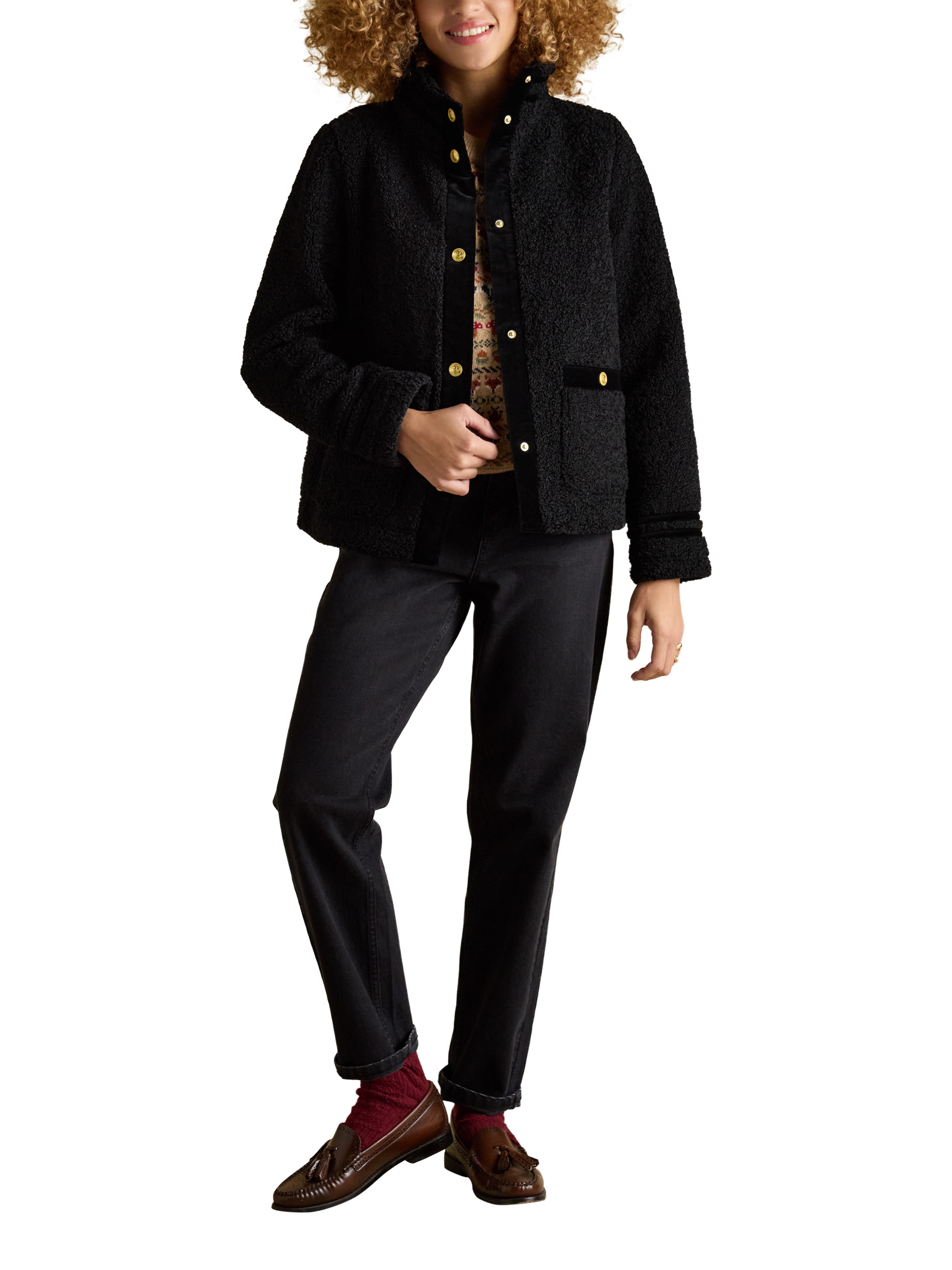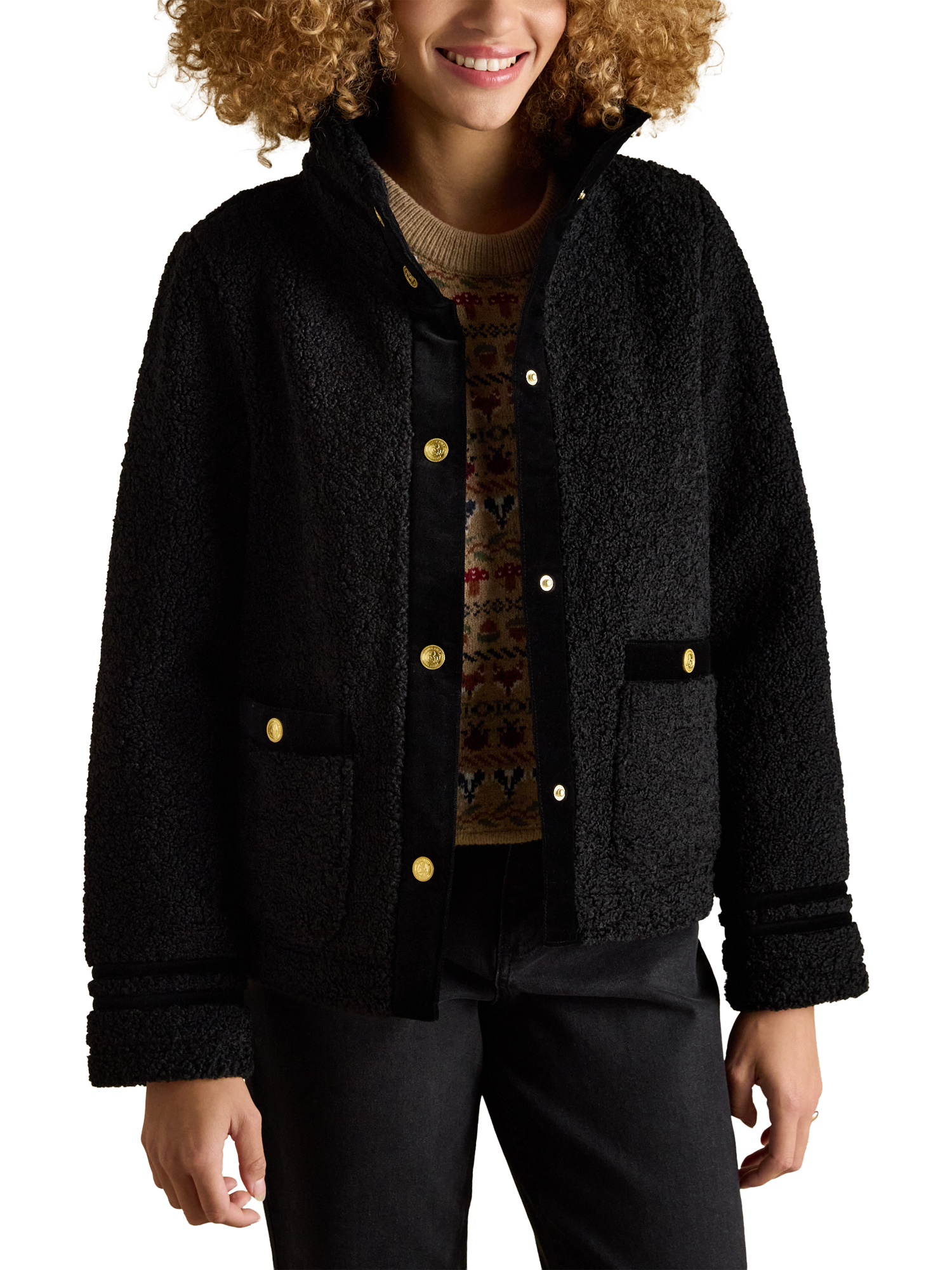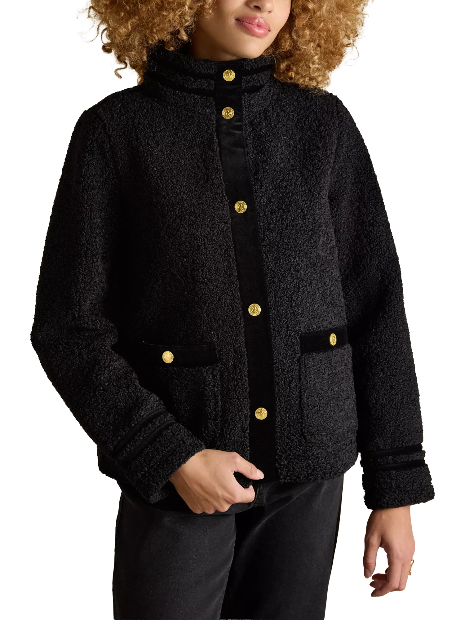 The Fleur fleece jacket has a boxy fit with an upstanding funnel neck for a distinctive look, and its high shine gold poppers and velvet trims to the neck, placket, cuffs and pockets add an elevated element.
