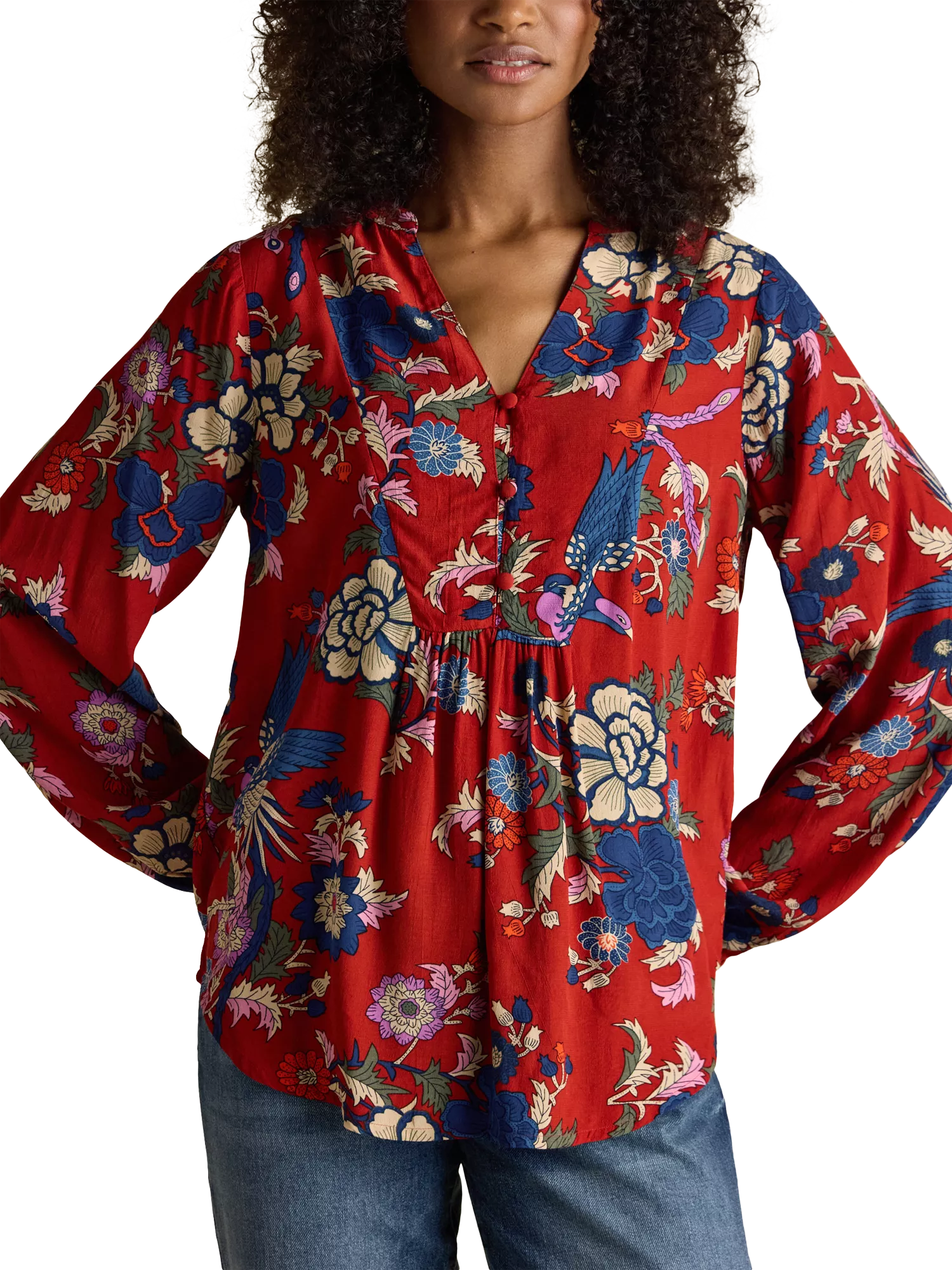 A shirt blouse by Joules. Featuring a V-neck and long sleeves, its printed with florals. A great piece for everyday.