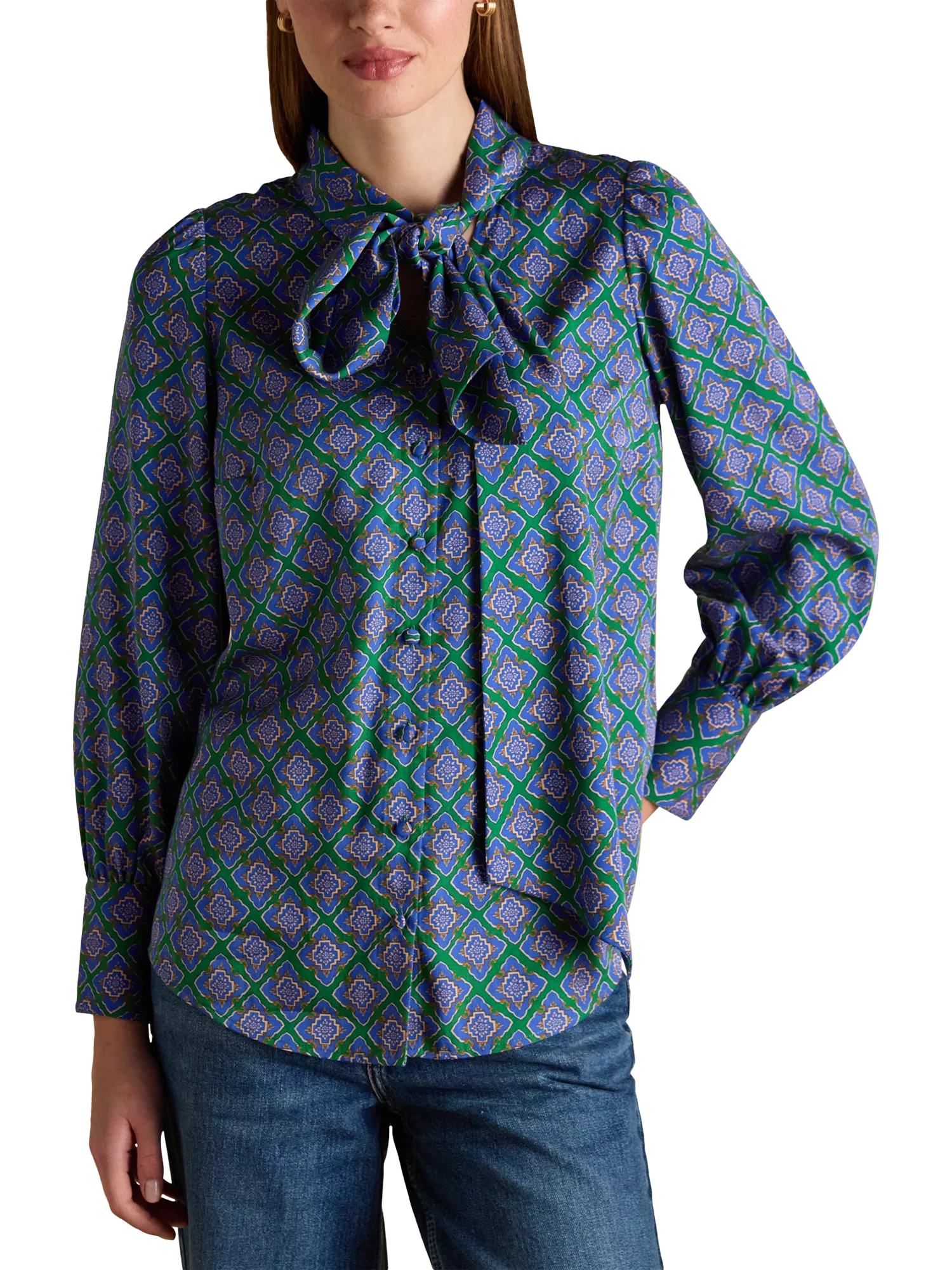 Long sleeve tie neck shirt with four buttons on the deep cuffs in a blue and green geometric pattern.