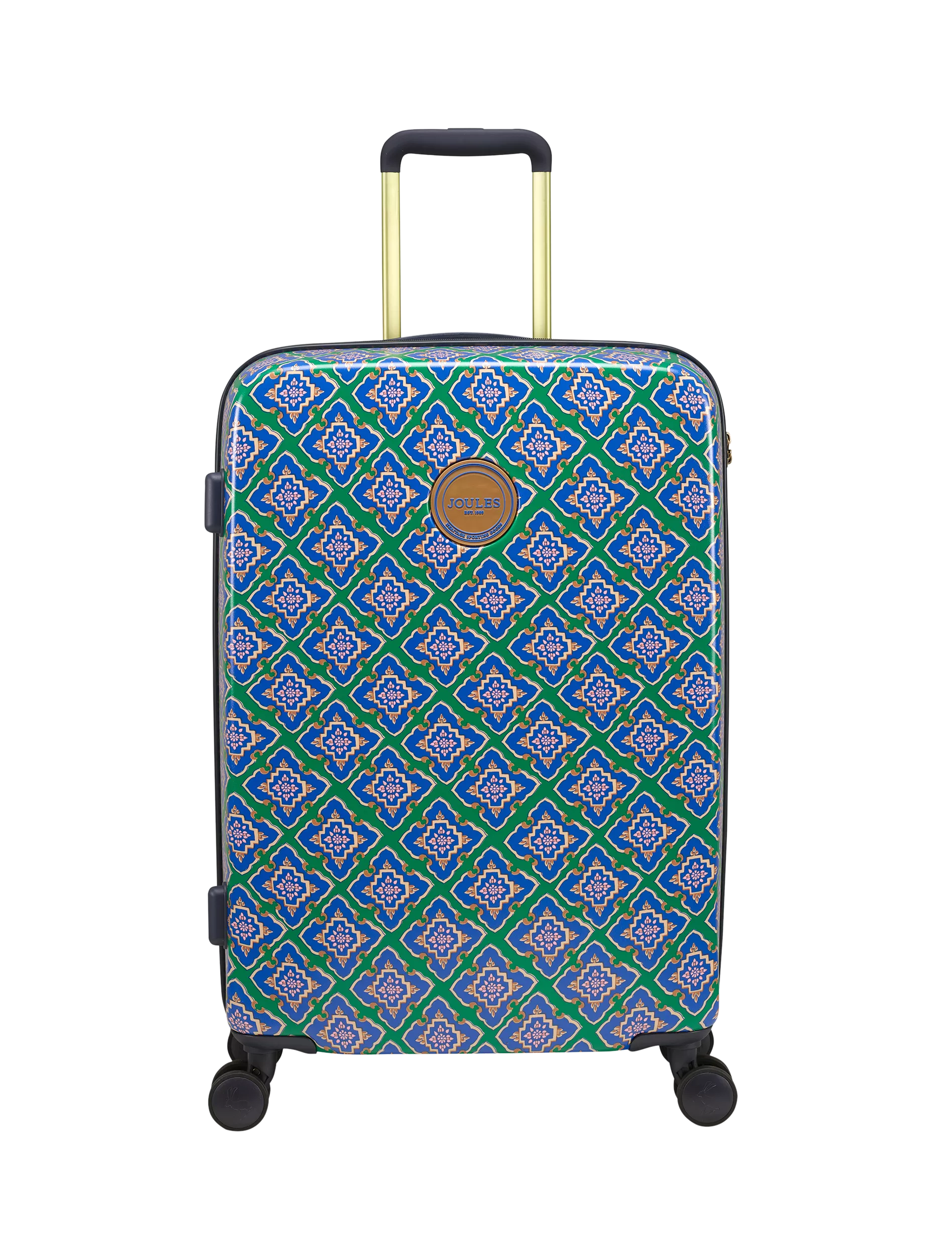 This medium ultra-lightweight hard shell case is perfect for trips and will offer protection for your belongings as soon as you start packing. It's adorned with an artful unique-to-Joules hand-drawn Tile Diamond print and has a super smooth exterior with a matte finish, a high gloss recessed branding plate to the front and features a practical top carry handle with the brand's signature logo. Its antique gold-toned trolley system comprises four zip pockets and branded hardware that adds to its overall appeal. Four rolling spinner wheels aids its smooth manoeuvrability and it's finished with branded matte wheel caps and an integrated TSA lock for secure international travel.