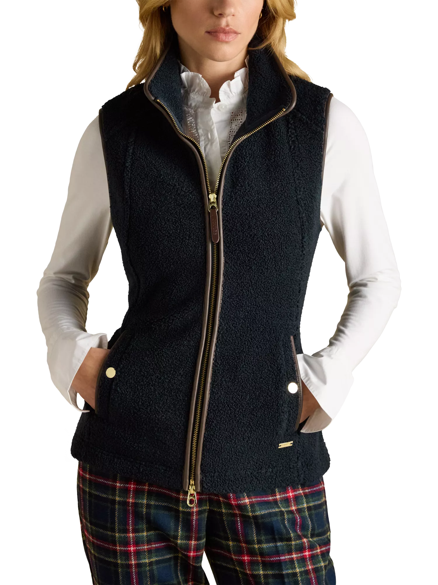 The countryside Heritage gilet has been developed to elevate your wardrobe. Crafted from luxury borg fleece to a classic profile with an internal waist adjuster to sculpt your silhouette, it’s topped with a practical zip fastening that leads to its warming stand collar. With stylish contrast faux leather trims, popper pockets, classic Joules embroidery at the back neck, and signature engraved hardware to finish, it’s bound to be an item you’ll continue to reach for. Perfect for layering or as a standalone piece.