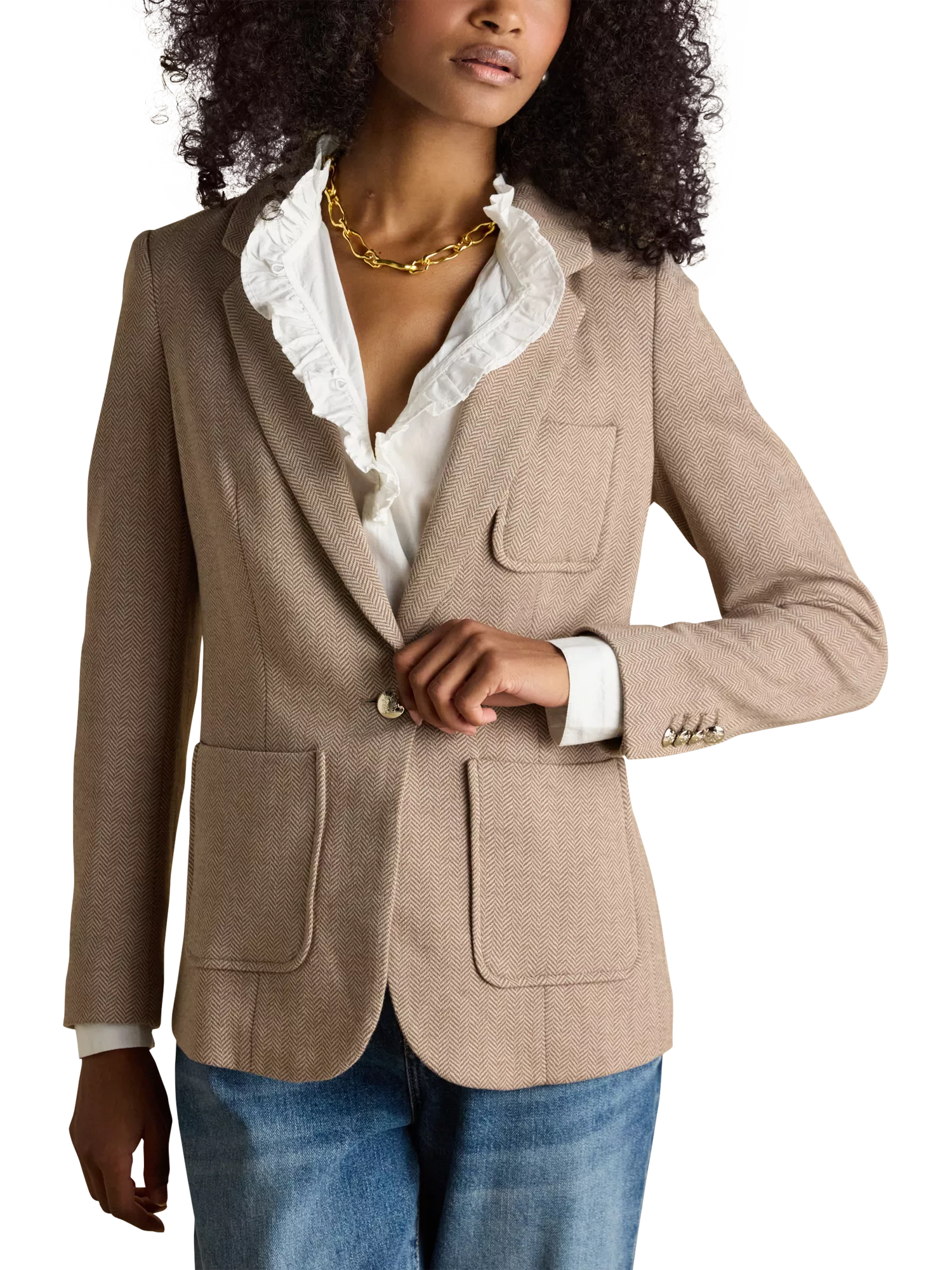 This preppy piece carries a collegiate appearance through its neat structured fit, soft cotton jersey fabric and single-button fastening. It features two front pockets with a classic single chest pocket, kissing buttons to the cuffs and a lapel collar. The colour palette will elevate any outfit, while its subtle padding to the shoulders creates a feminine shape. It's finished with a chain hanging loop to the back neck and Joules branded undercollar embroidery which is revealed when you pop the collar.