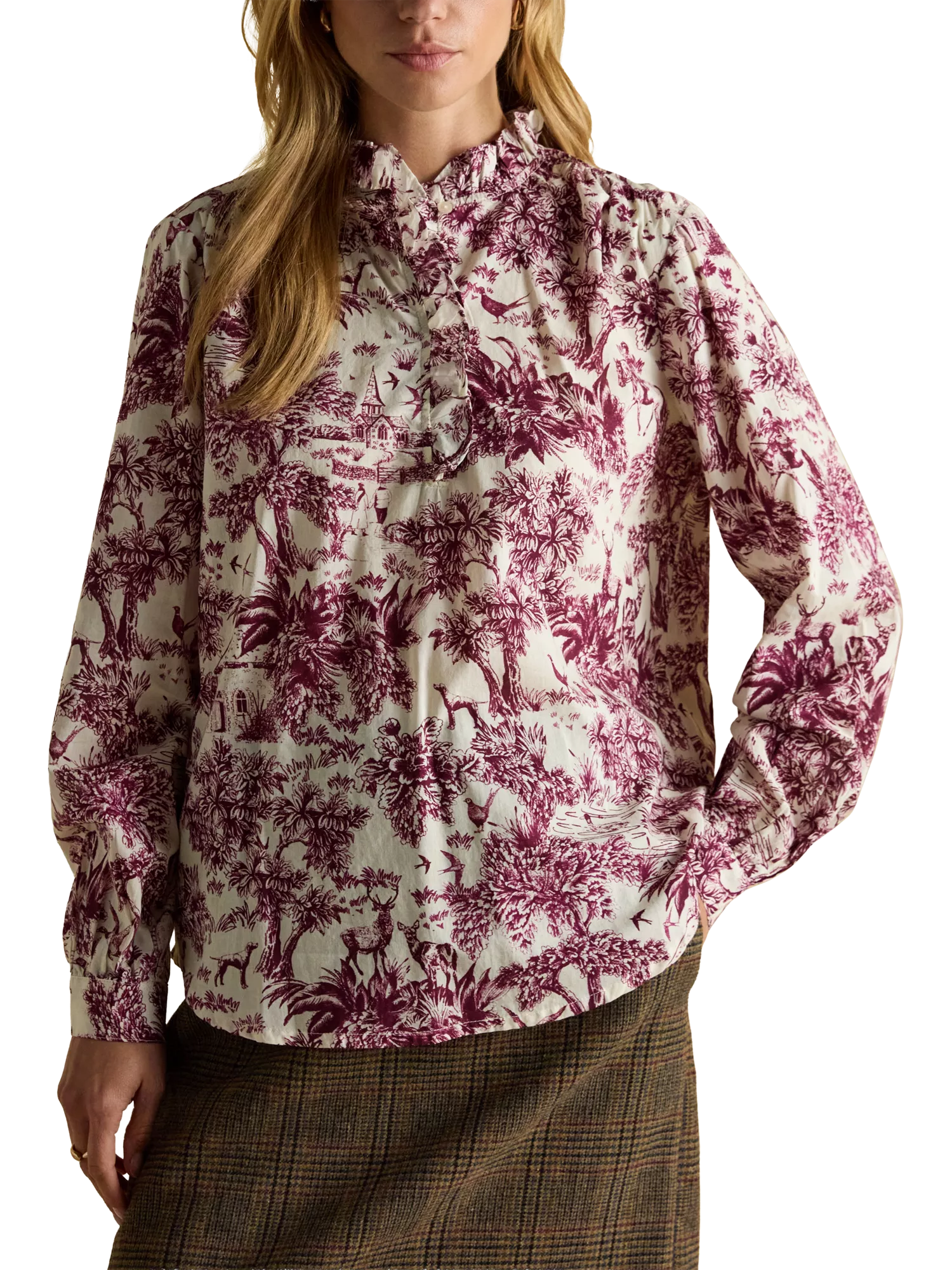 This long sleeve blouse, crafted from pure cotton, offers comfort and a playful pattern. Its ruffled high neck adds a smart touch, making it ideal for adding interest and confidence to your day-to-day style.