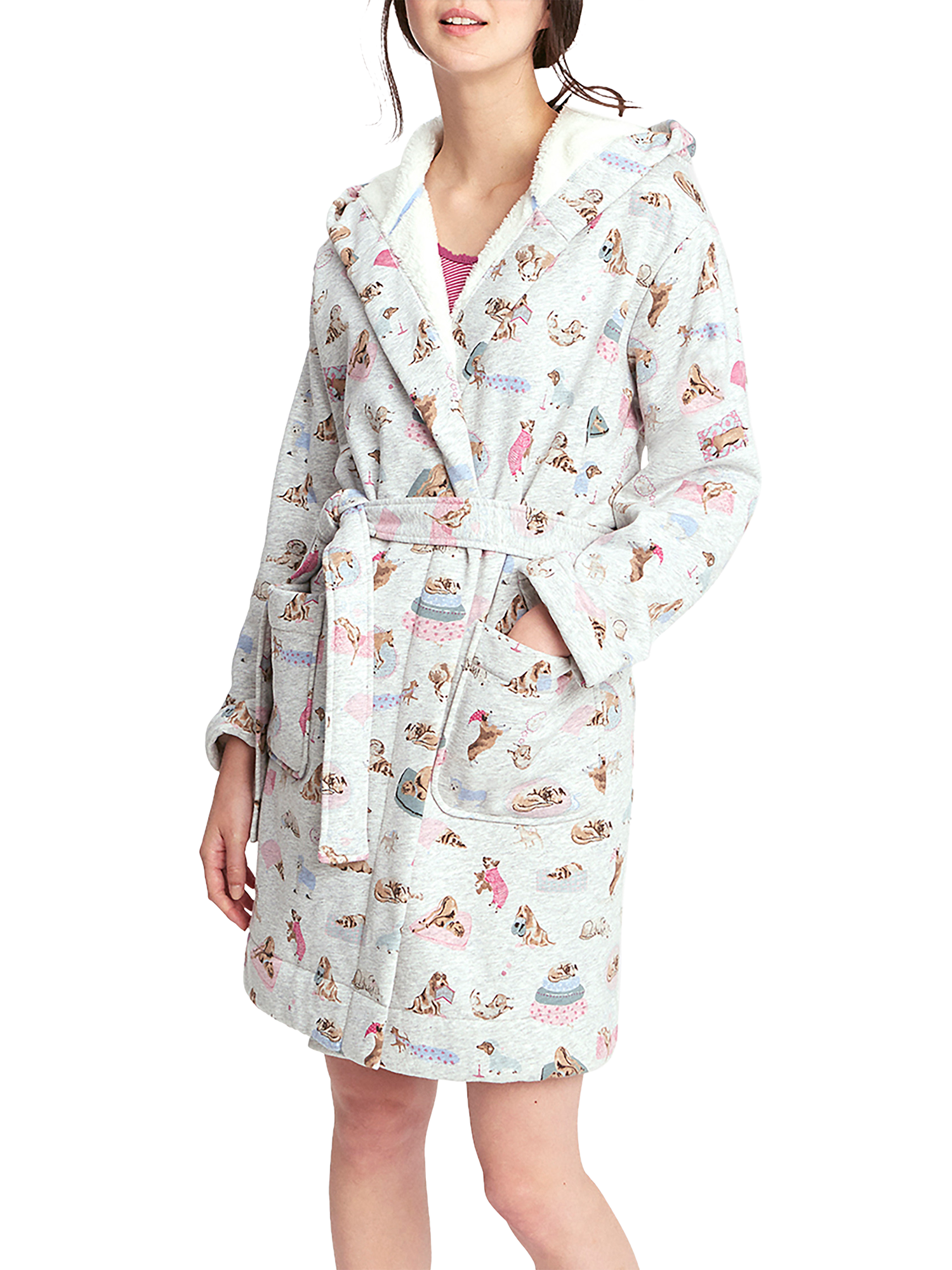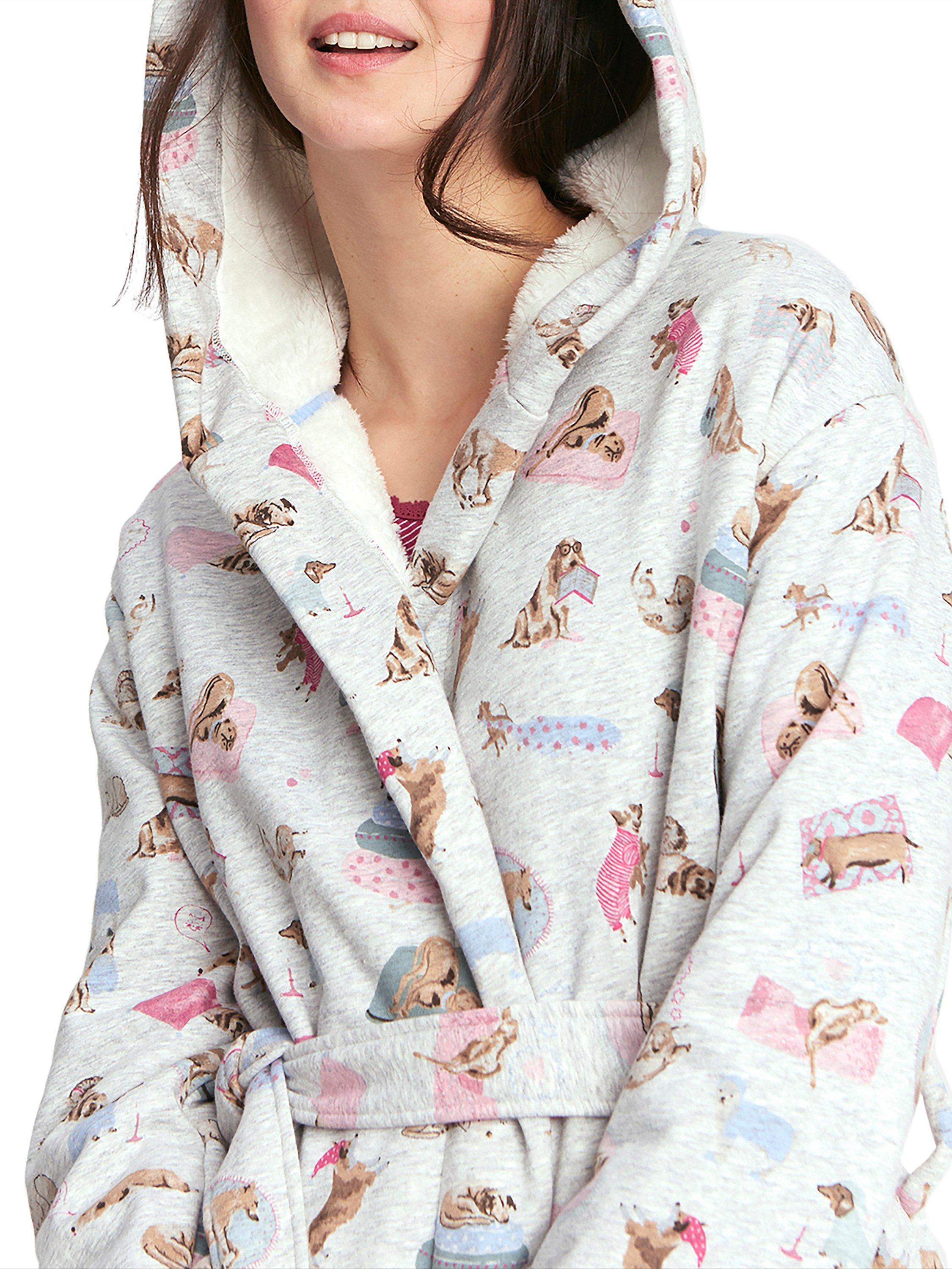 Soft to touch and fleece lined for optimum warmth, this robe has a hood, spacious front pockets and a self tie belt. It is adorned with a charming dog print for a playful touch.