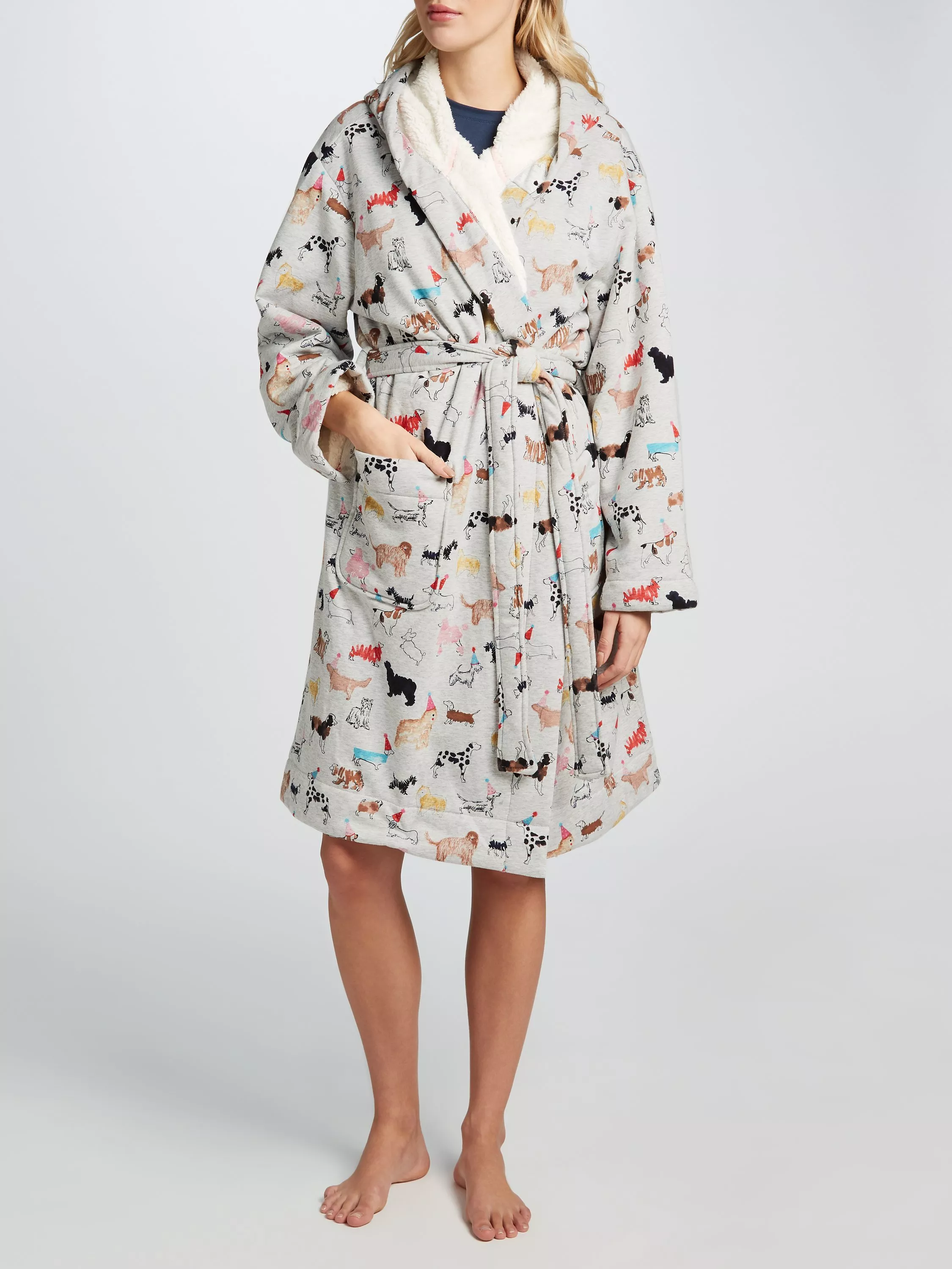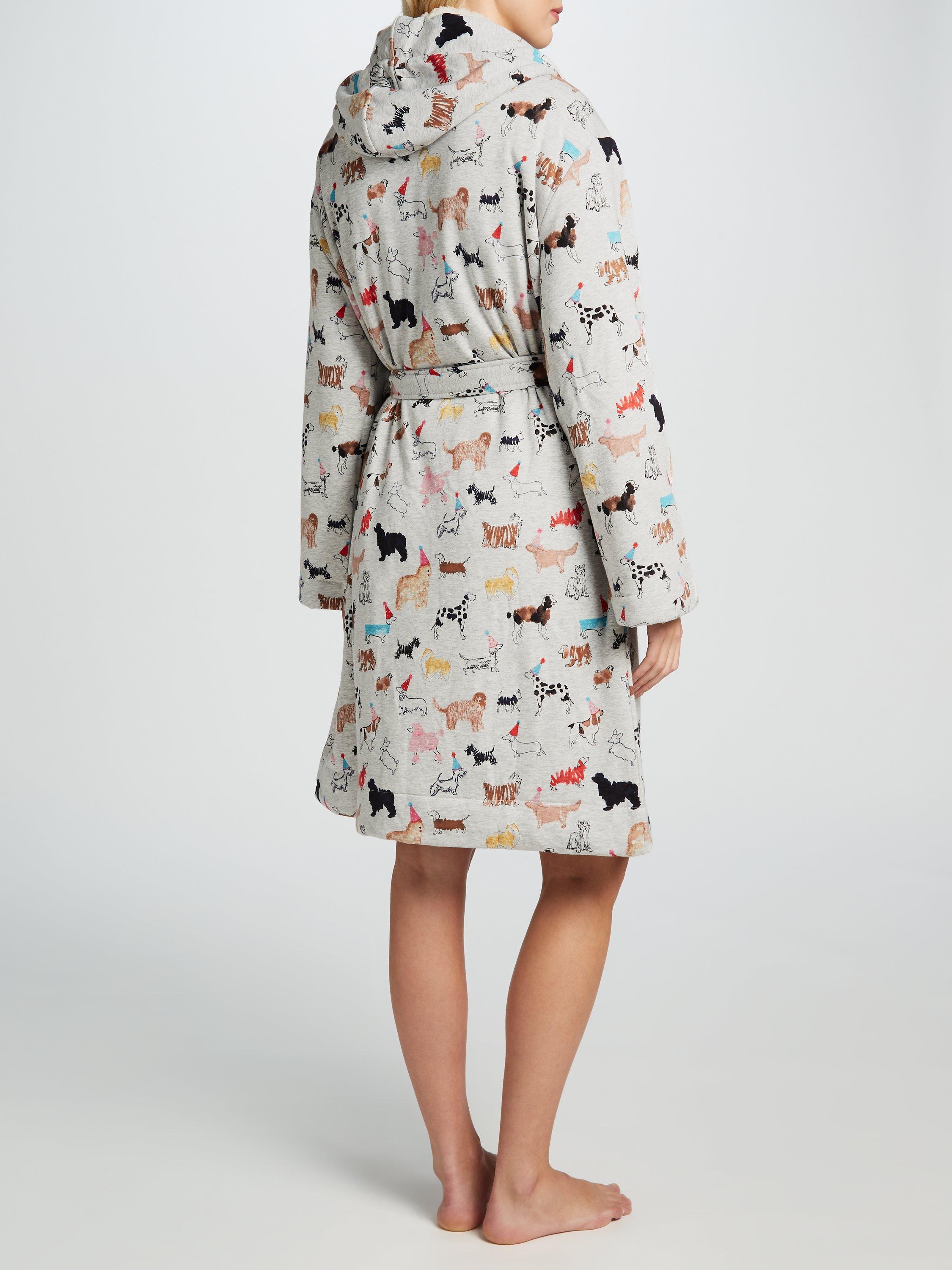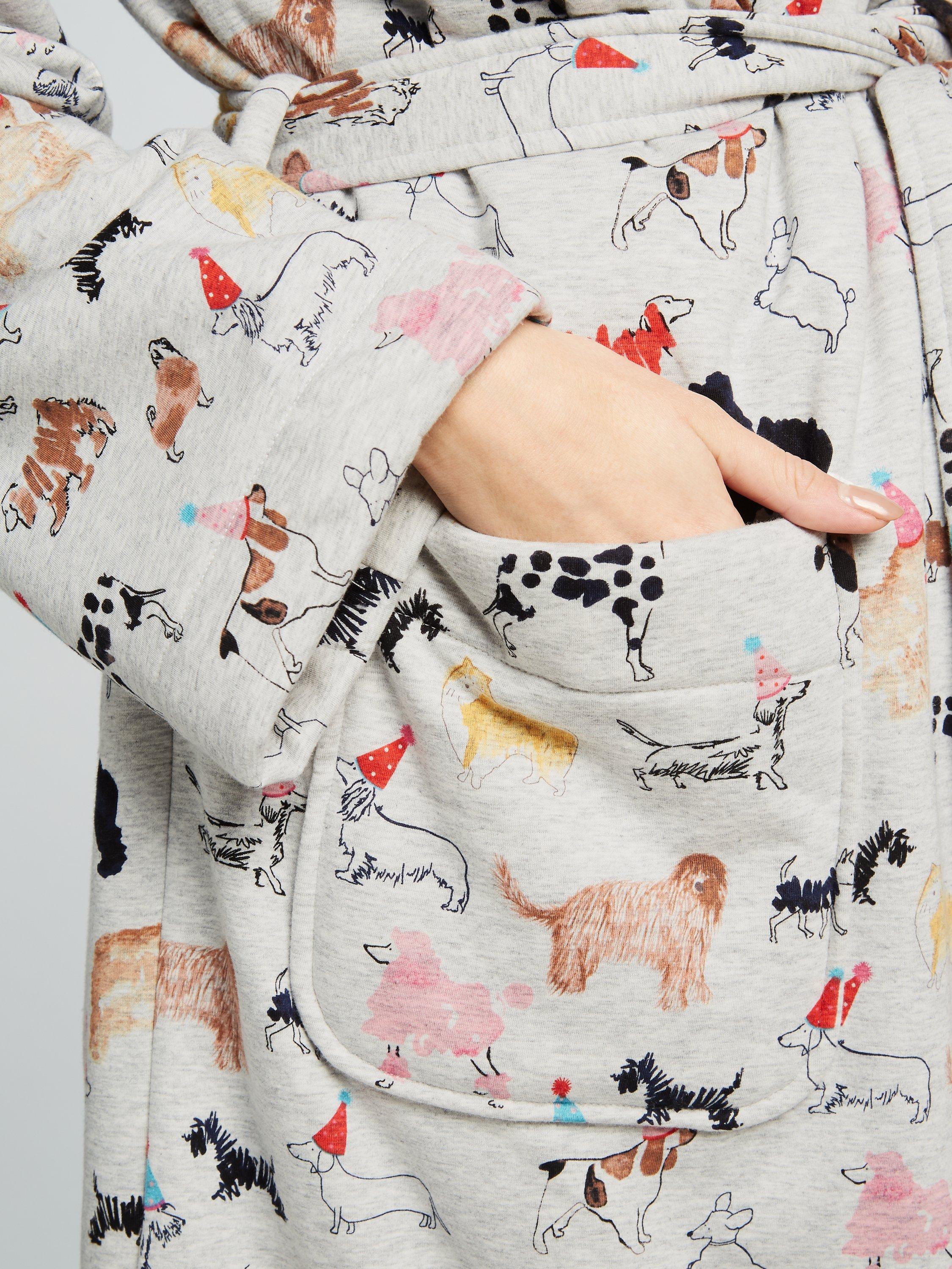 Adorned with a whimsical dog sketch print to brighten your day, it wraps around the body with a self-tie belt and features a spacious hood, long sleeves and front patch pocket.