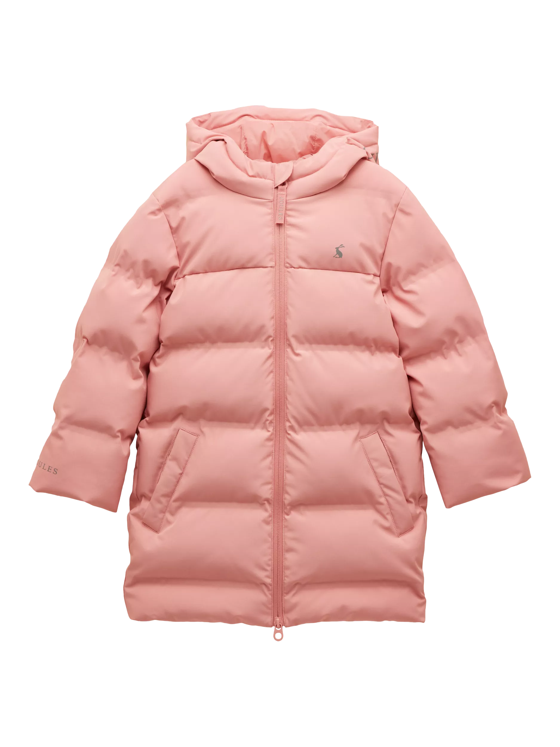 A padded coat with a full zip fastening with chin guard, a hood with reflective fixed cord detailing, slanted side pockets and ribbed storm cuffs. Fully waterproof with ultrasonic welded baffles and heat-sealed seams. It's finished off with a Joules hare screen print to the chest and a reflective 'Adventure Awaits' screen print to the back.