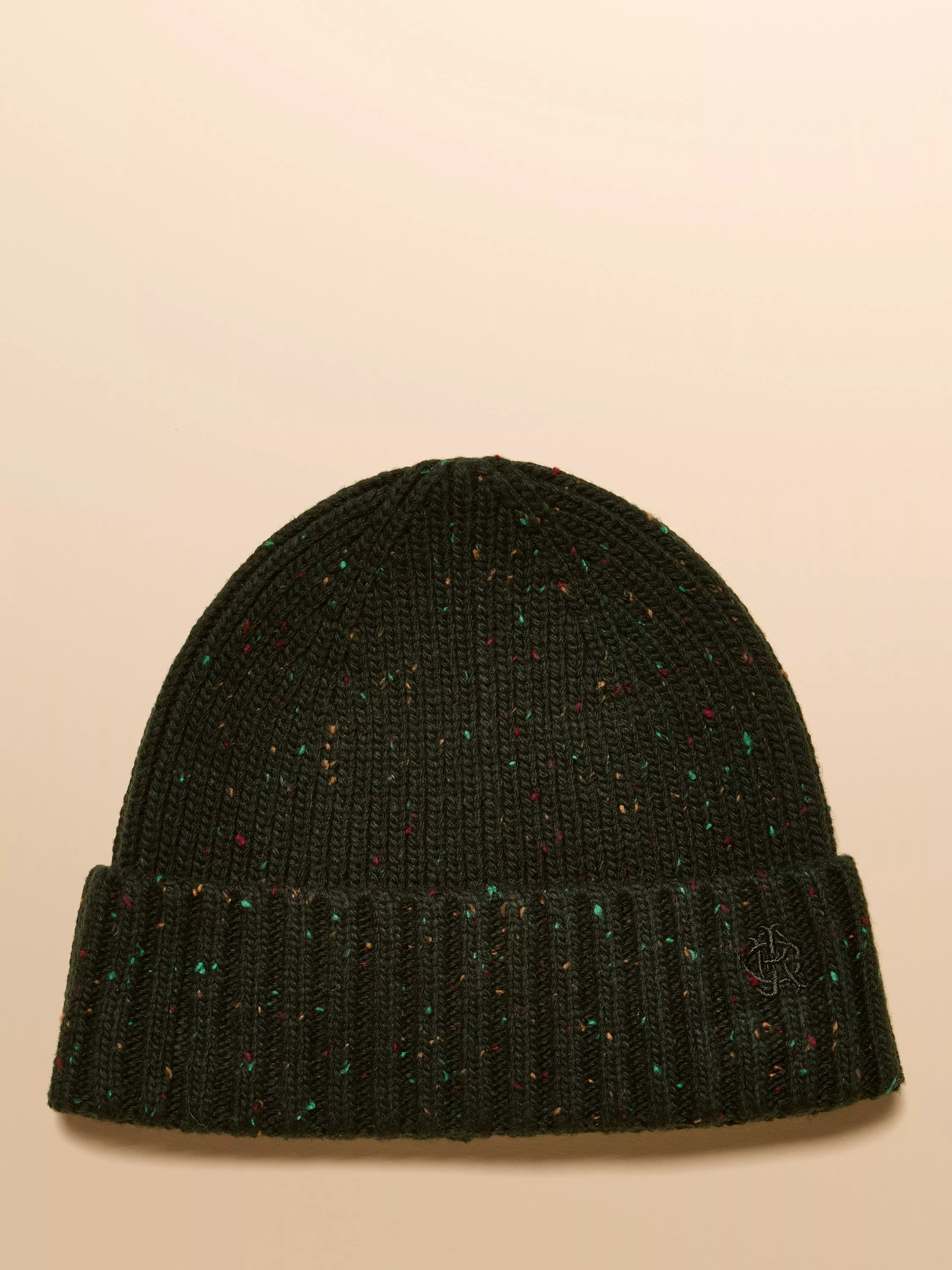 Flecked beanie hat with a chunky rib knit and Joules branding on the hem.
