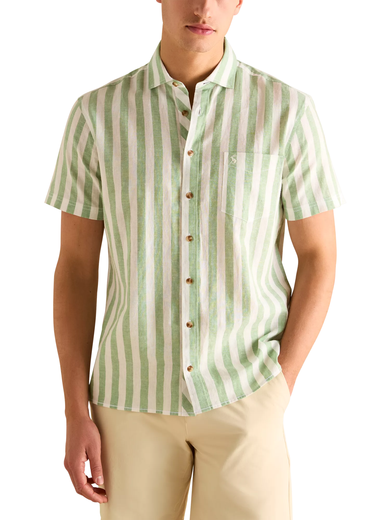 This striped linen short sleeve shirt has button fastenings and pockets on the chest with Joules logo. Perfect for sunny summer days.