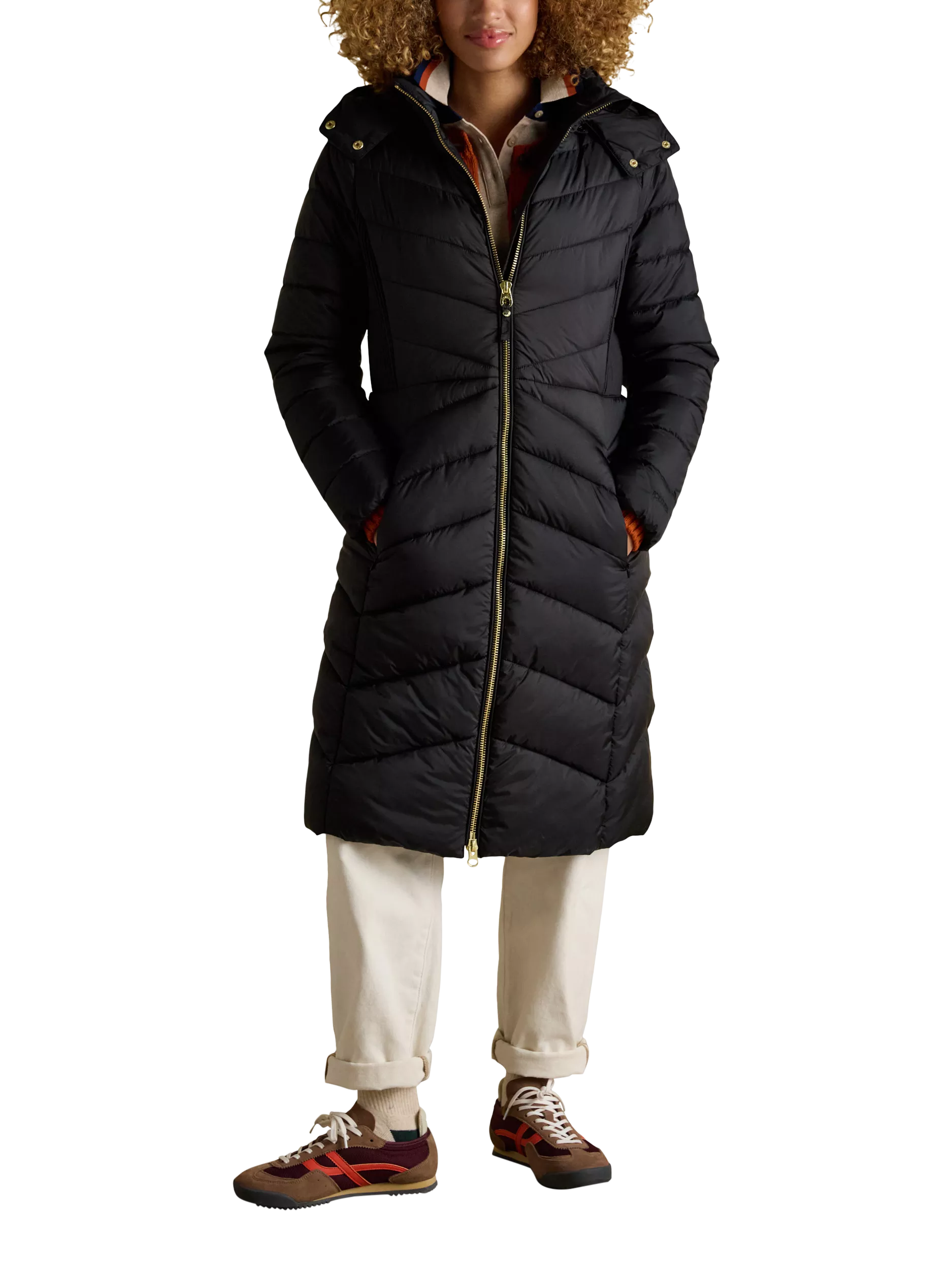 Cut to a longline length for all-over warmth this coat is a true cold-weather wonder. Joules's designers have cleverly added shirred side panels, slimmer chevron baffles to the waist and curved seams to the centre to balance out its shape for a more flattering fit.