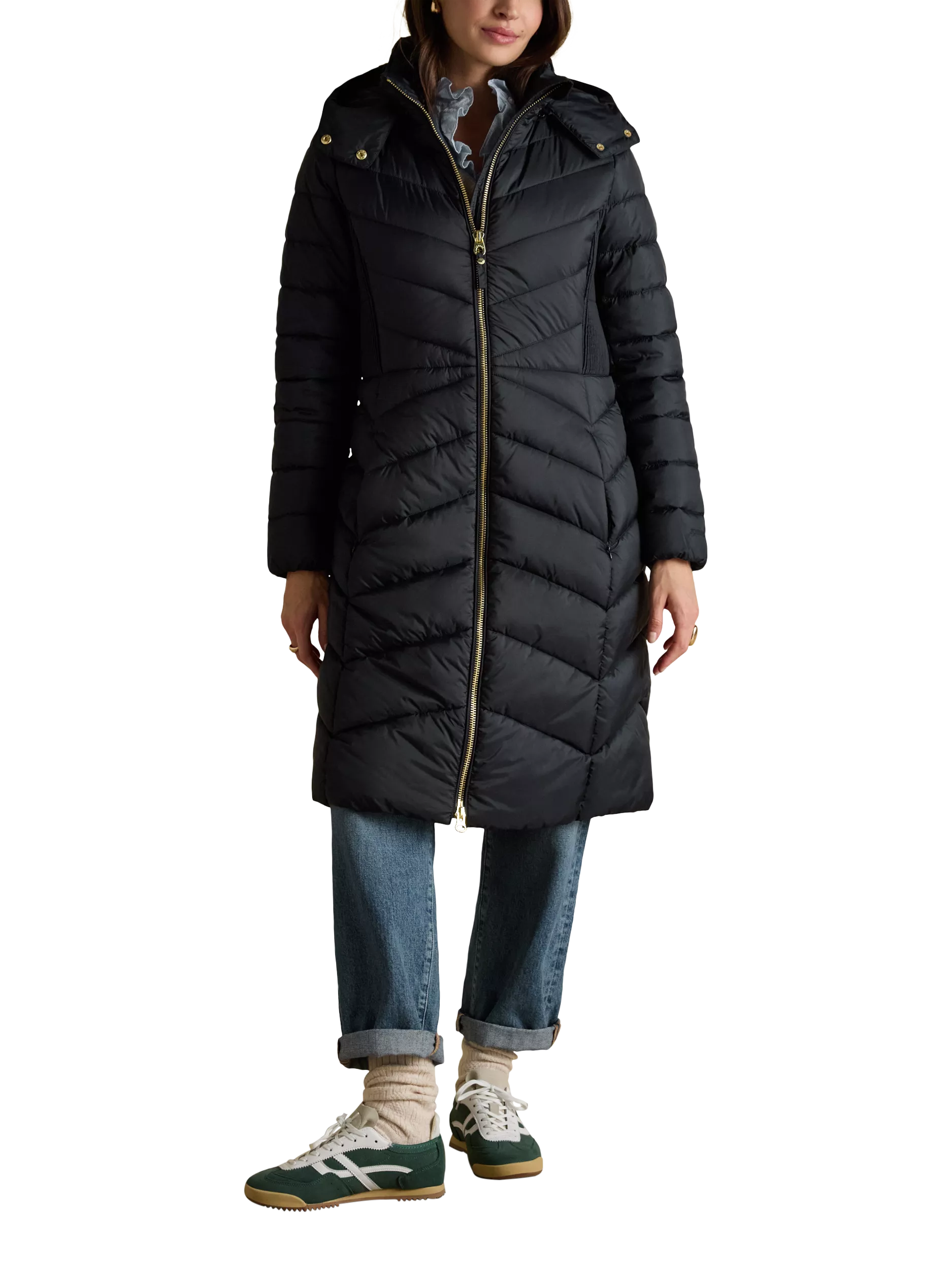 Cut to a longline length for all-over warmth this coat is a true cold-weather wonder. Joules's designers have cleverly added shirred side panels, slimmer chevron baffles to the waist and curved seams to the centre to balance out its shape for a more flattering fit.