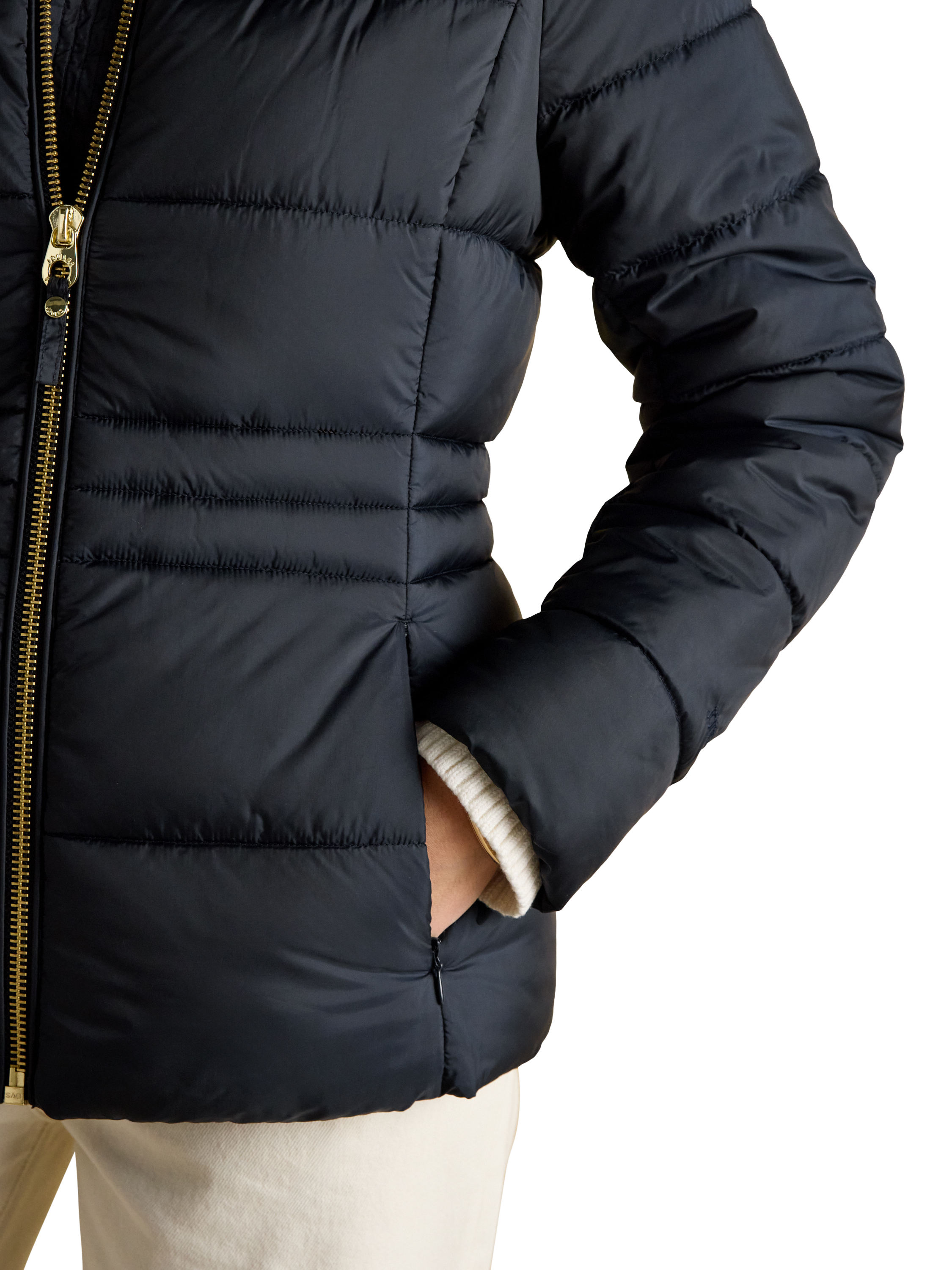 Padded shower resistant jacket, zip fastening, additional button fastening on the collar, zip fastening pockets.