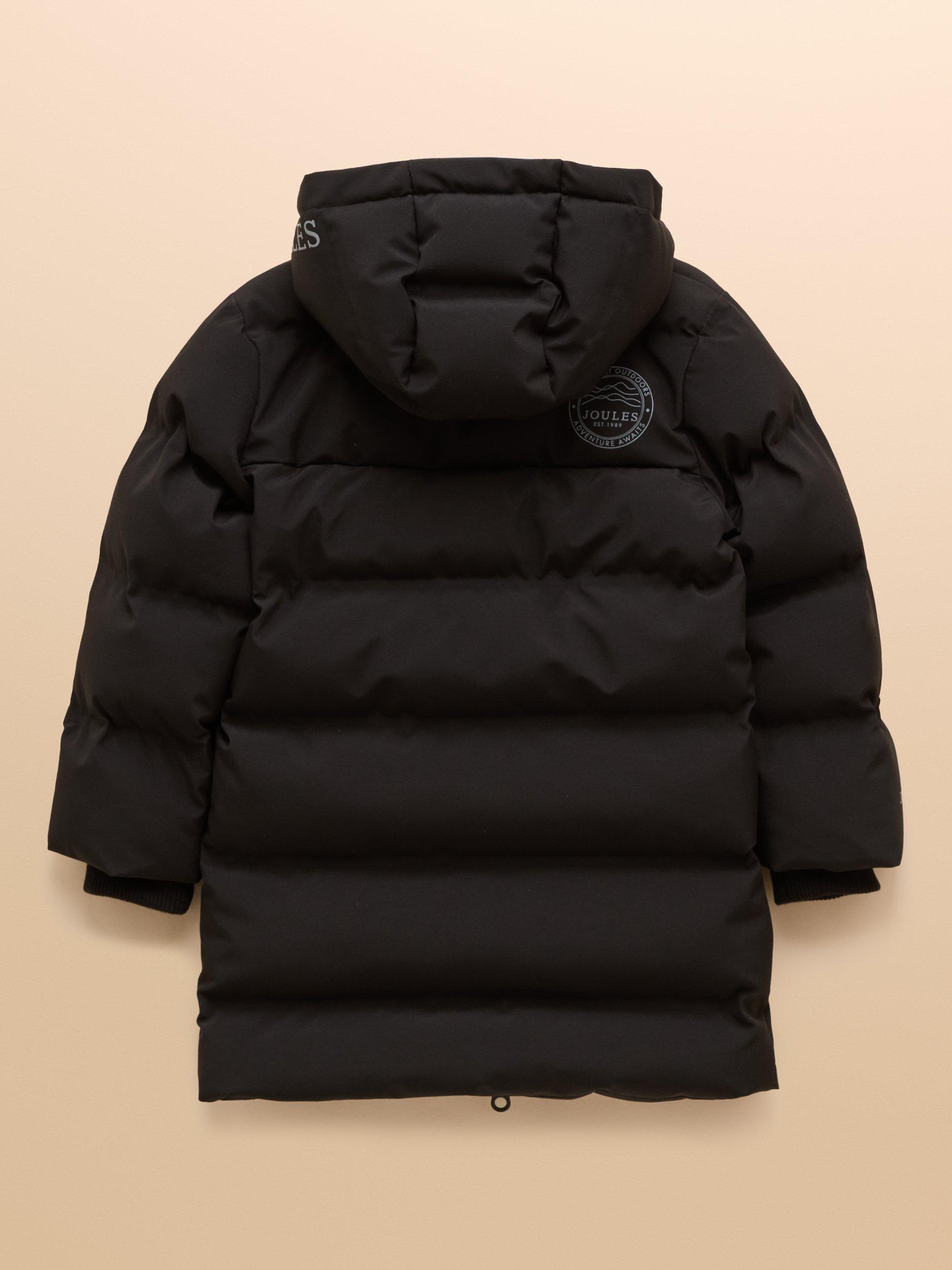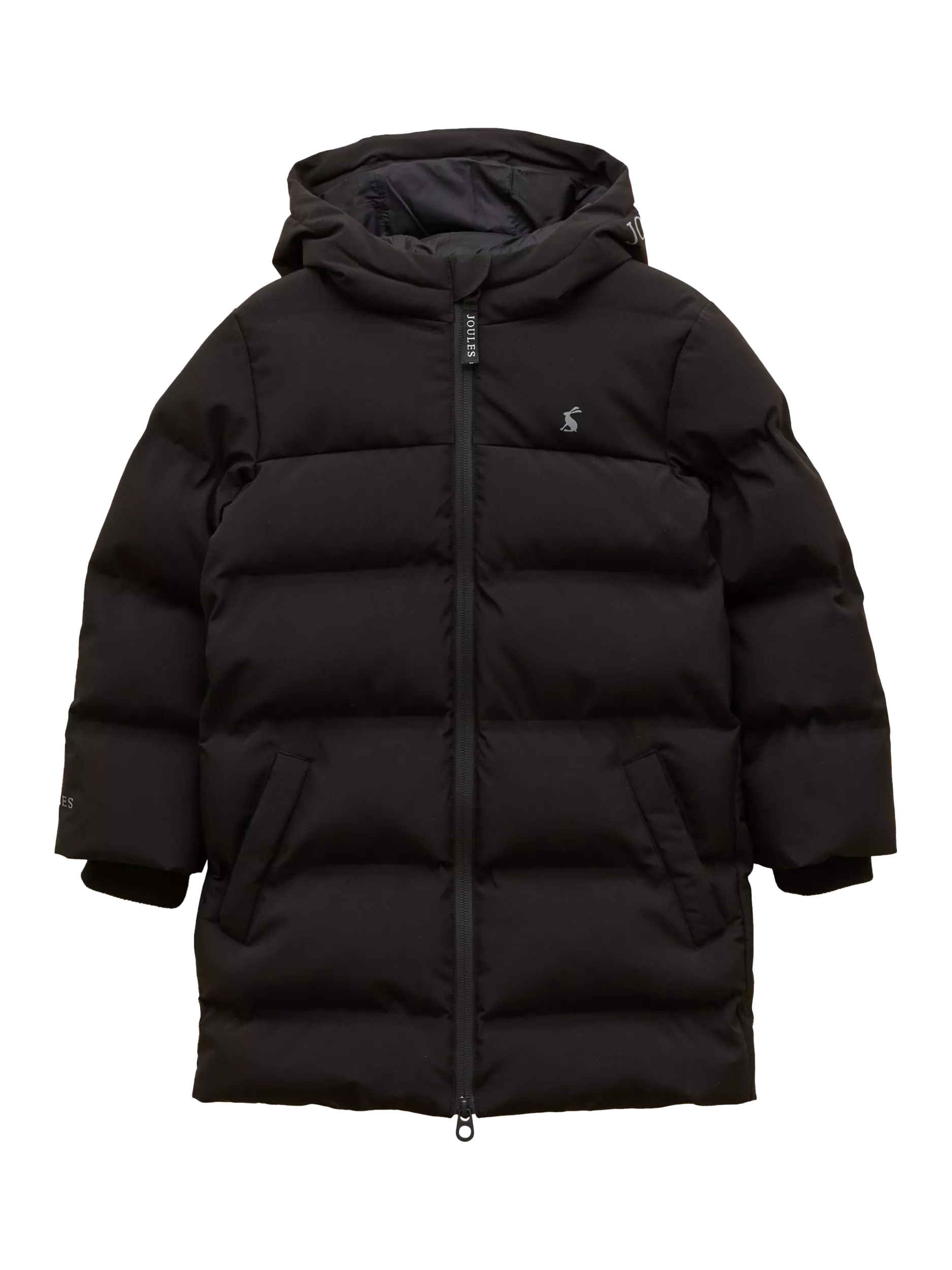 Waterproof padded coat with hood and zip fastening and Joules logos on the front and shoulder.