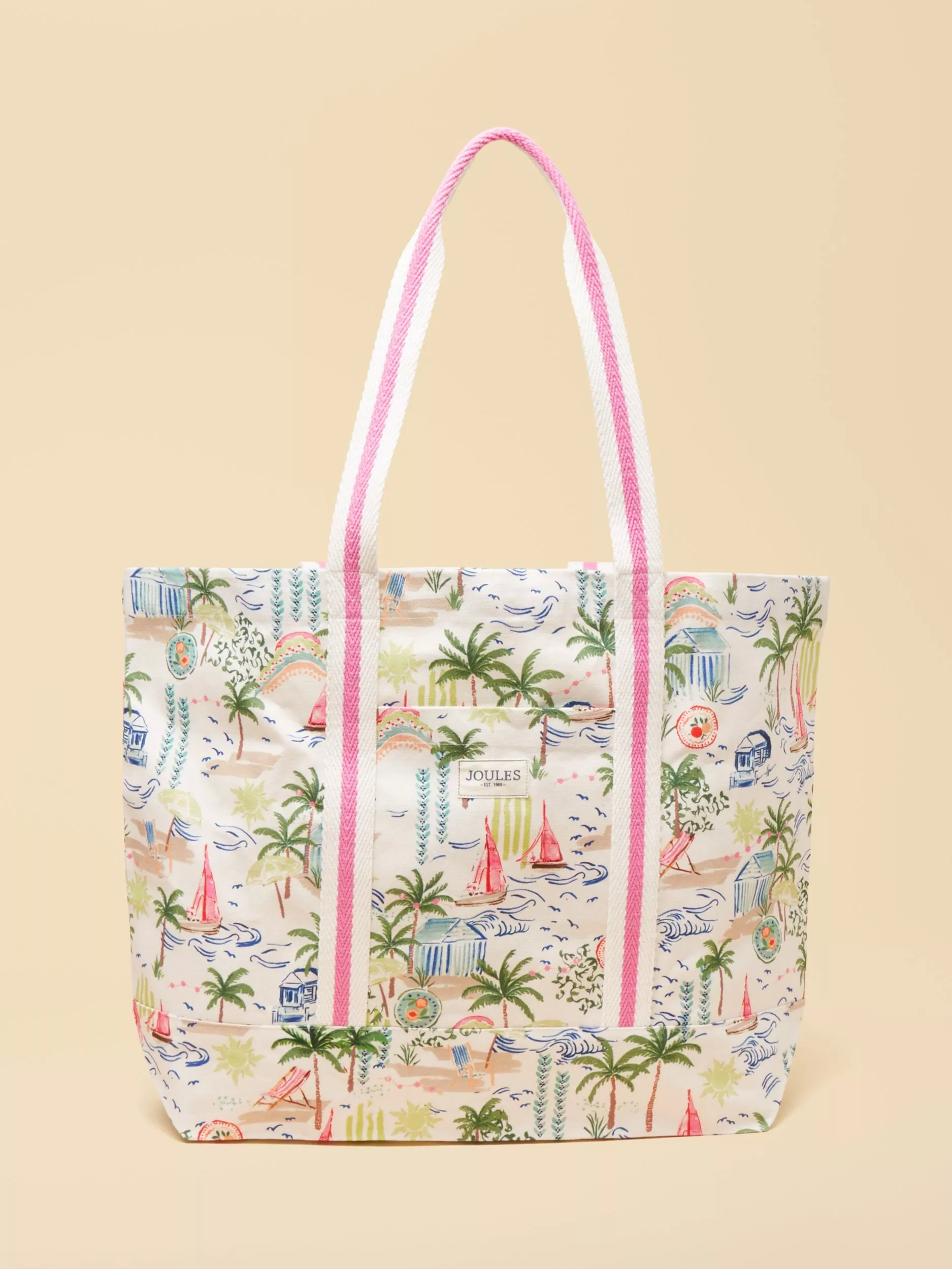 Accessorise your summer with the Promenade beach bag. It's made from hardwearing cotton canvas so will be an enduring piece you'll use time and time again and uses a neutral colour palette that will complement every outfit. The drop-in design of the bag creates a relaxed feel with plenty of room inside for your towel, book, suncream and all the other essentials. It features striped webbing shoulder straps which extend to the front and back of the bag, has an additional front slip-in pocket, contrasting base colour and is finished with a Joules branded tab to the front.